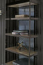 Not only is this cabinet functional, but it also adds a dynamic element to any space. Use a pair to fill a wall, or style it alongside a buffet or credenza for a luxurious touch. Its fully finished back allows for use as a screen or partial room divider, making it a versatile addition to your home. The metal frame in Deep Bronze, reeded glass back panels, and Woodland Gray wood shelves create a stunning contrast that will surely catch the eye.