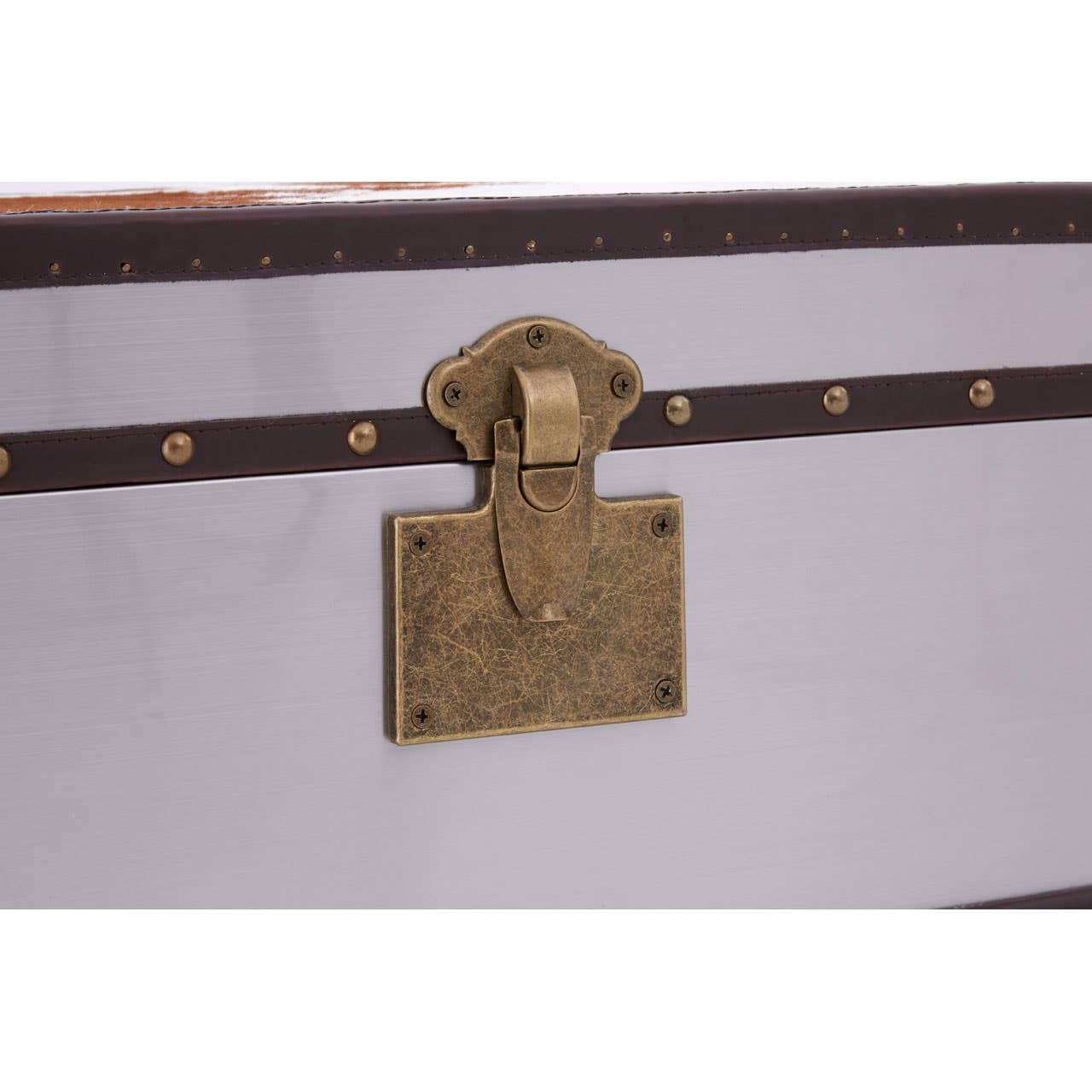 Each of its three stainless steel plated drawers is dressed with a soft leather strap handle with reflective stud detail. Three steel clasps secure the lid, which opens to reveal two generous storage compartments. Its sides are trimmed with genuine leather which is coloured brown to complement the cowhide. *This product is made from genuine cowhide. Individual units are likely to have slightly different colours, textures, or markings from the image as this is a natural material*