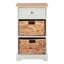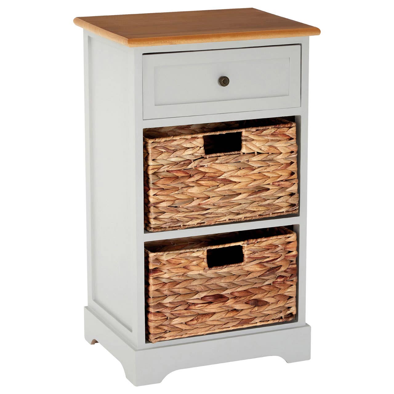 Inspired by the rural tranquillity of Vermont, our single wood drawer and 2 basket drawers cabinet will make a stylish and functional addition to your home. Made from reliable MDF and durable paulownia wood, the cabinet is sturdy and strong with a grey finish that will complement most settings. The single wood drawer gives you ample space for safely storing your household and personal items such as paperwork, magazines, keys and much more. A round metal handle allows for easy access when opening the drawer. Below the drawer are four pull out baskets that are beautifully weaved ensuring strength, while the integrated handles make them easy open. Ideal for keeping everyday use items close to hand, but out of sight, the baskets give you plenty of storage for larger items that won't fit into the signal drawer while adding a rustic charm. The top surface is ideal for displaying plants, lamps, flowers, photos and other decorative items on giving your home a personal touch. A wonderful feature in your bedroom or living space, the Vermont cabinet will provide a storage solution and a stylish piece of everyday furniture.