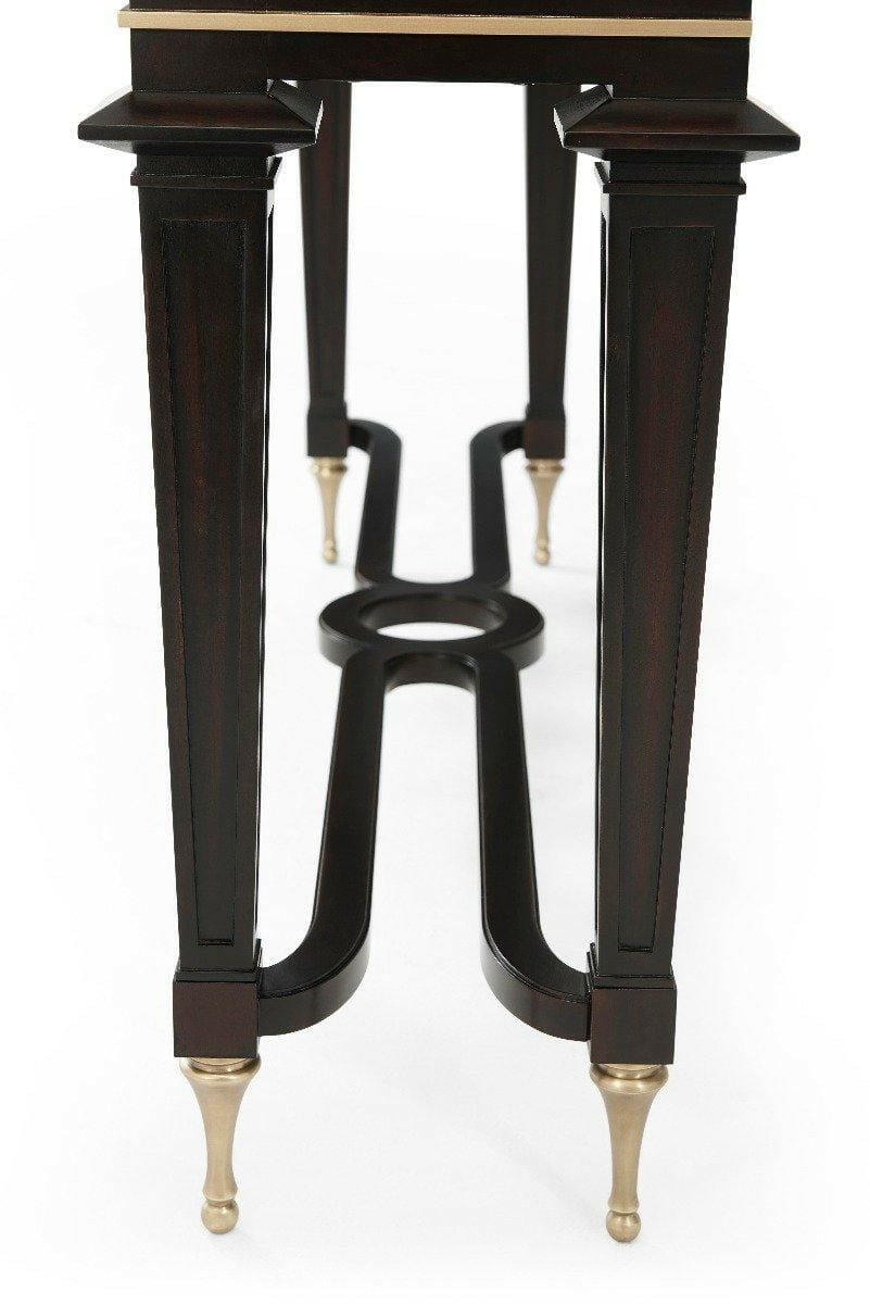 This Console Table Mid Century with Brass Peg Feet is the perfect addition to any home. Made from imbuya burl, it features a rectangular top and two frieze drawers adorned with brass moulding. The table stands on tapering square legs joined by a shaped X stretcher, with brass peg feet for added elegance. This piece is a true representation of the original Mid Century Modern style.