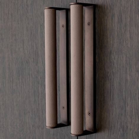 Featuring a modern mocha straight oak veneer cupboard, Bar Cabinet Harrison is a high quality storage solution for glassware, wines and liquors. The inside of the cabinet is fitted with mirror glass and contains 4 shelves. Each door has 3 shelves with a raised edge so that glassware cannot fall out when you open them. Furthermore, this cupboard has 4 hanging racks that together can accommodate up to 16 wine or cocktail glasses. Medium bronze hardware and leather look handles make this piece an important feature in your living room or dining room.