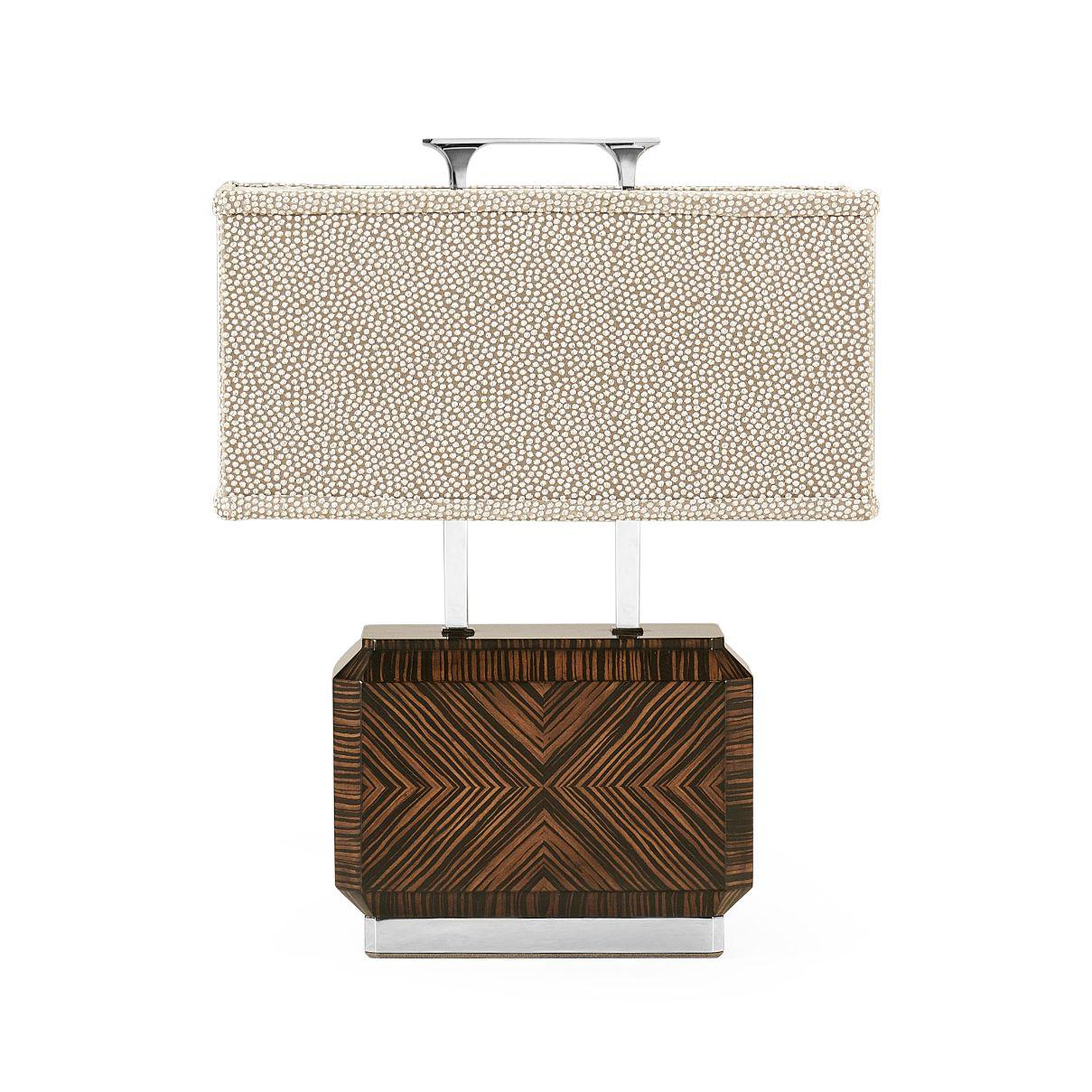 Tea Caddy Faux Macassar Table LampGeometric faux macassar and nickel table lamp based on a Chinese tea caddy form with a rectangular silk shade. JC Modern -Luxe Collection Jonathan Charles captures the heyday of the 20s -40s era, translating their underlying influences to the Luxe collection. Strong silhouettes and graphic linearity are mixed with antique beauty for the modern-day interiors. The Luxe Collection is now available in bronze, gold and silver. Jonathan Charles Furniture At Jonathan Charles, it's all in the detail. Renowned for exquisite quality and specialist artistry, Jonathan Charles excel in designing fine furniture and high-quality antique reproductions inspired by the classics of the past. Jonathan Charles Furniture is made entirely by hand using age-old techniques employed by specially trained artisans. it's this craft and attention to detail that breathes character and long-lasting quality into every furniture piece, successfully imitating antique heirlooms from the past.