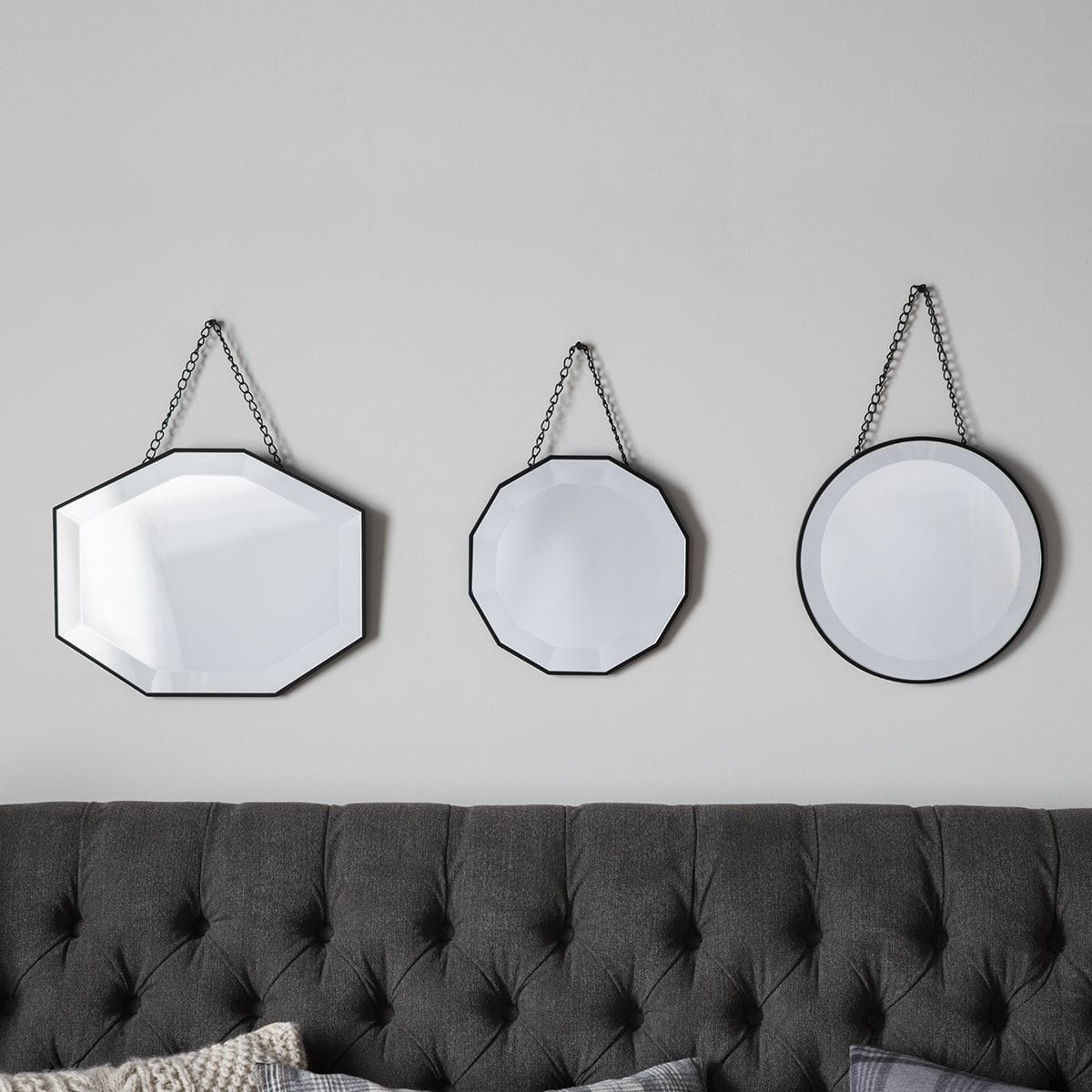 Cat Scatter Set Of Three is the perfect addition to your home decor. This set includes three feature wall mirrors with chain detailing, creating an eye-catching display. The mirrors are made with high-quality materials such as glass, MDF, and metal, ensuring durability and longevity. The silver color adds a touch of elegance to any room. The hanging orientation is portrait, making it easy to incorporate into any space. With House of Isabella, you can enjoy luxurious furniture and interiors with the added convenience of fast and free delivery within the UK. Shop now and elevate your home with Cat Scatter Set Of Three.