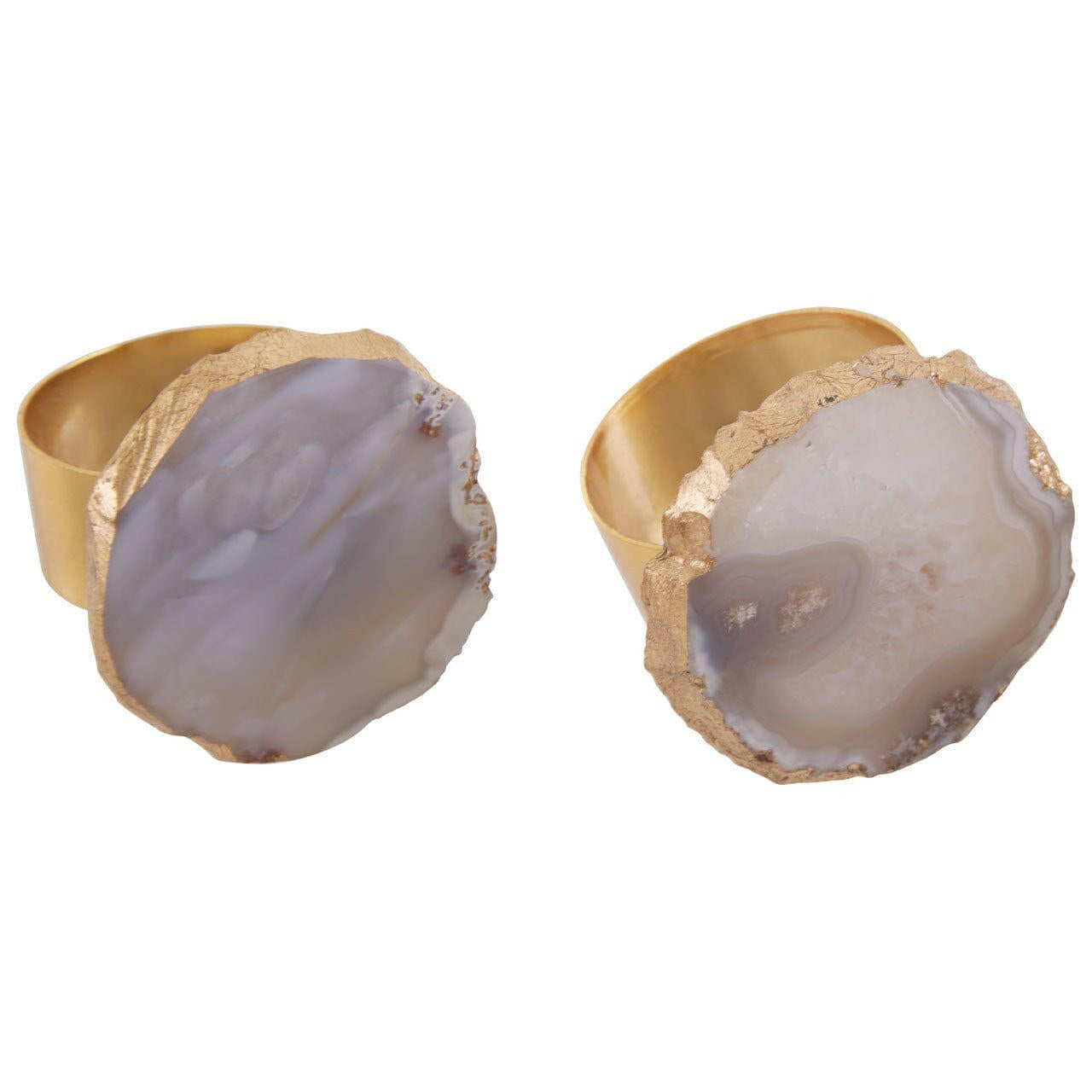 Skilfully handcrafted, set of 4 napkin rings featuring grey agate stone adorned with asymmetric gold foil trim. Each traditional stone is complemented with the gold finish stainless steel ring which is sized to wrap around table napkins.