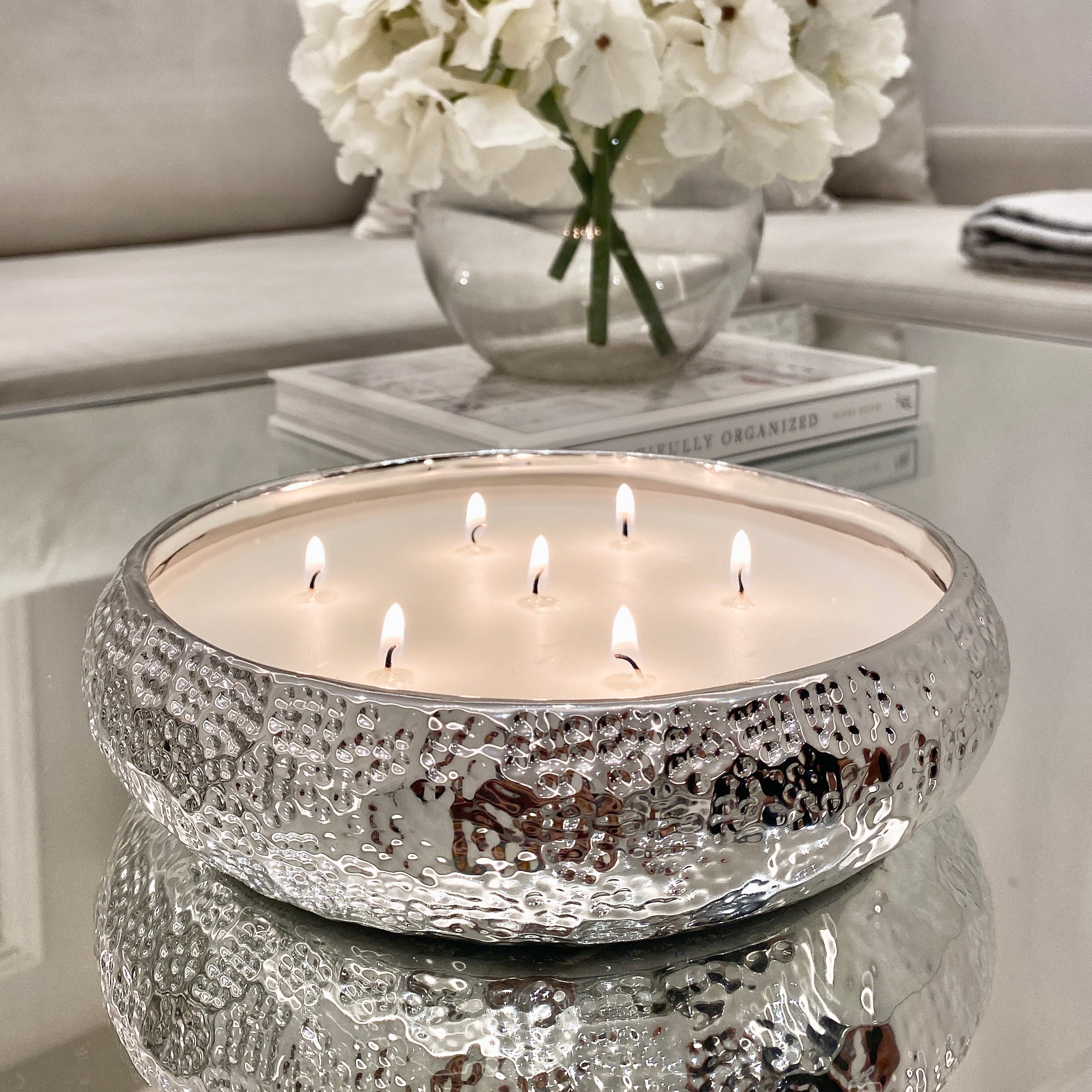 The metallic case on this candle has an impactful hammered effect for a statement look.