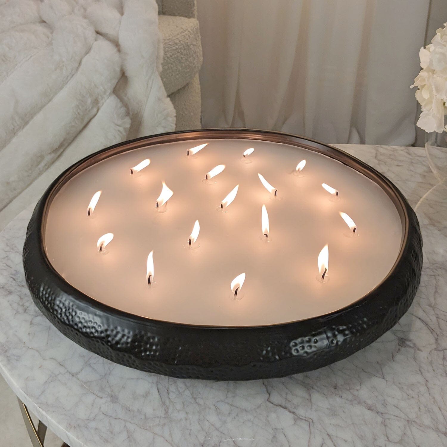 With its impressive size in a sleek black finish with 17 flickering wicks, this candle demands attention in any room.