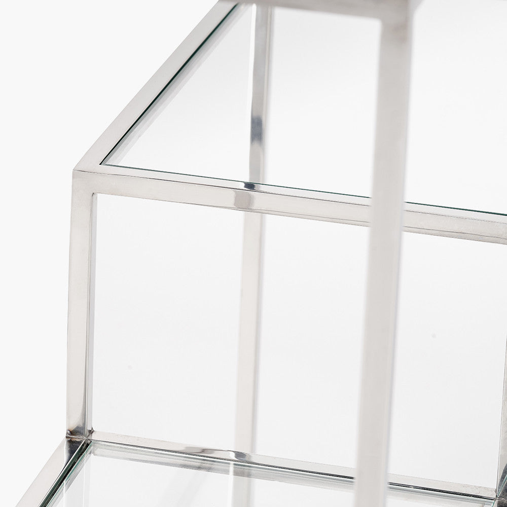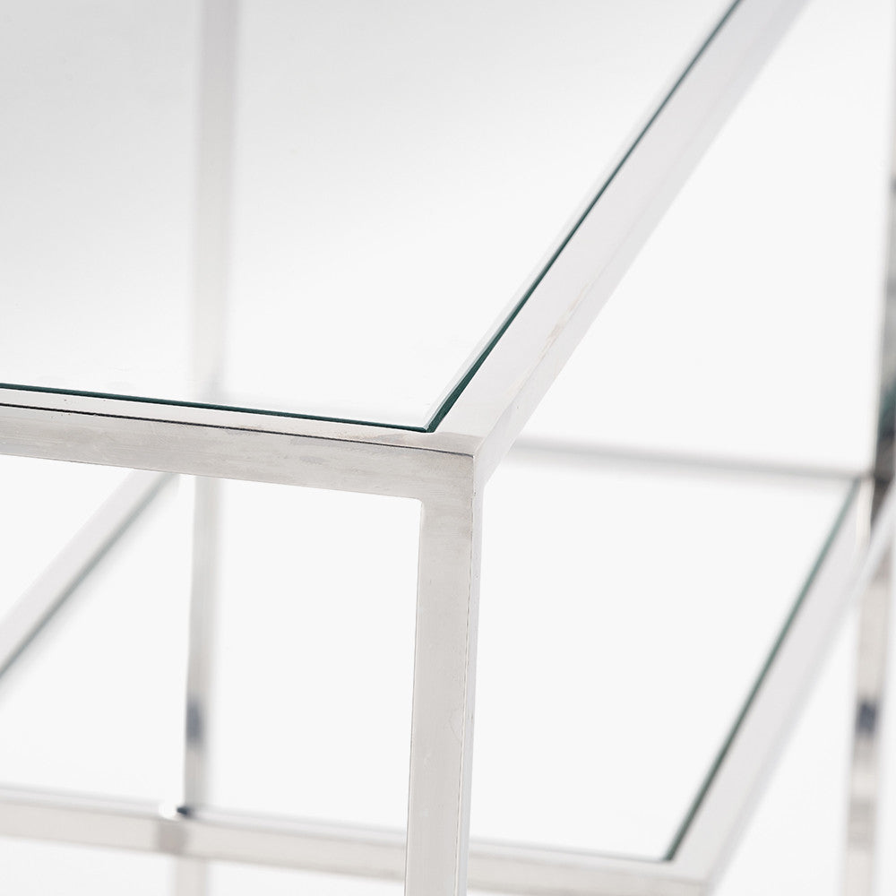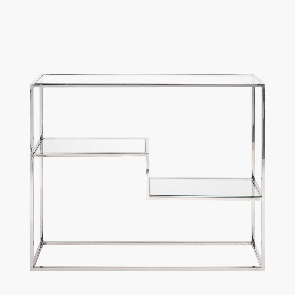 Introduce elegance and style to your interior with our Aleandra glass console table. Lovingly crafted in India, this stunning piece features a sleek, clear glass surface, with slim, shiny silver metal legs. As well as a well-proportioned surface space, the console table also offers a stepped shelf, to showcase your home accents.