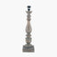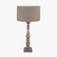 The beautiful rustic, turned mango wood lamp base is handcrafted in India and finished in a grey wash. This elegant lighting solution is coupled with a beautifully rustic open weave jute linen cylinder lamp shade.