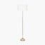 An effortlessly stylish metal floor lamp created from simple lines. This elegant base finished in a shiny nickel silver, sits beautifully with the cylinder white lamp shade. The linen shade allows the light to softly filter through the weave producing a soft glow when lit.