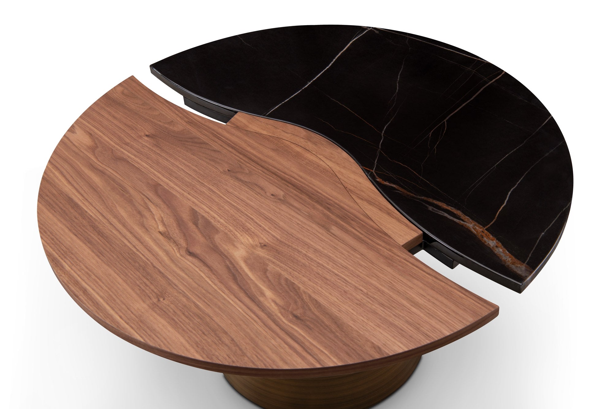 The Aurelia Coffee Table is a refined statement piece that seamlessly blends luxurious materials with contemporary design. Featuring a distinctive round tabletop split between glossy Lauren black gold marble and light walnut veneer, this dual-surface design creates a striking balance of opulence and warmth. The contrast between rich marble veining and natural timber grain brings depth and visual intrigue, making Aurelia a sophisticated focal point in any living space.