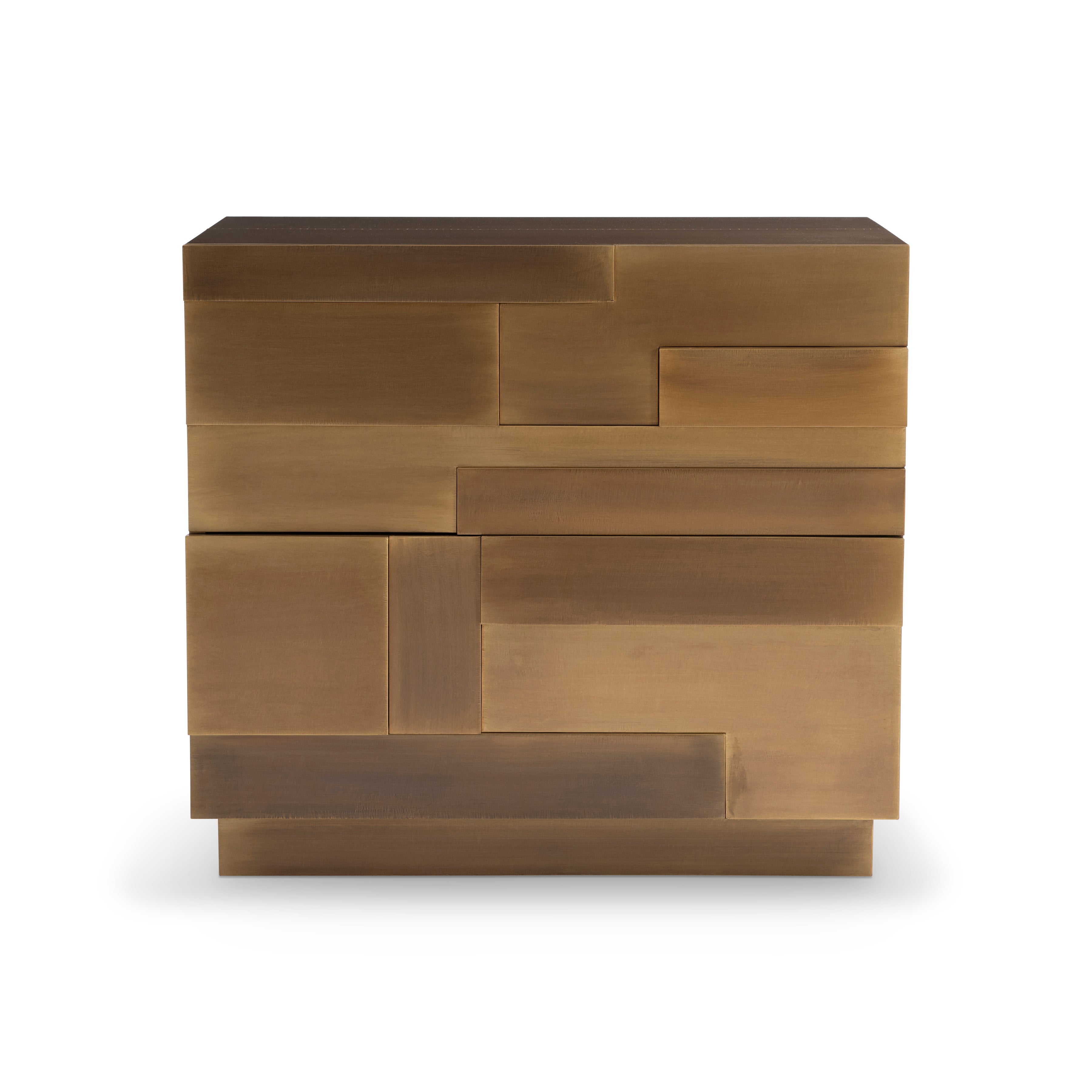 The wood frame of the Acora nightstand, featuring three-dimensional drawer fronts, is wrapped in beautiful sheets of brass and sits on a plinth base. Each seam is also finished with brass nailheads, giving the design a tailored detailing. Two drawers open to reveal a glossy black interior and an A+C USB charging unit is included.