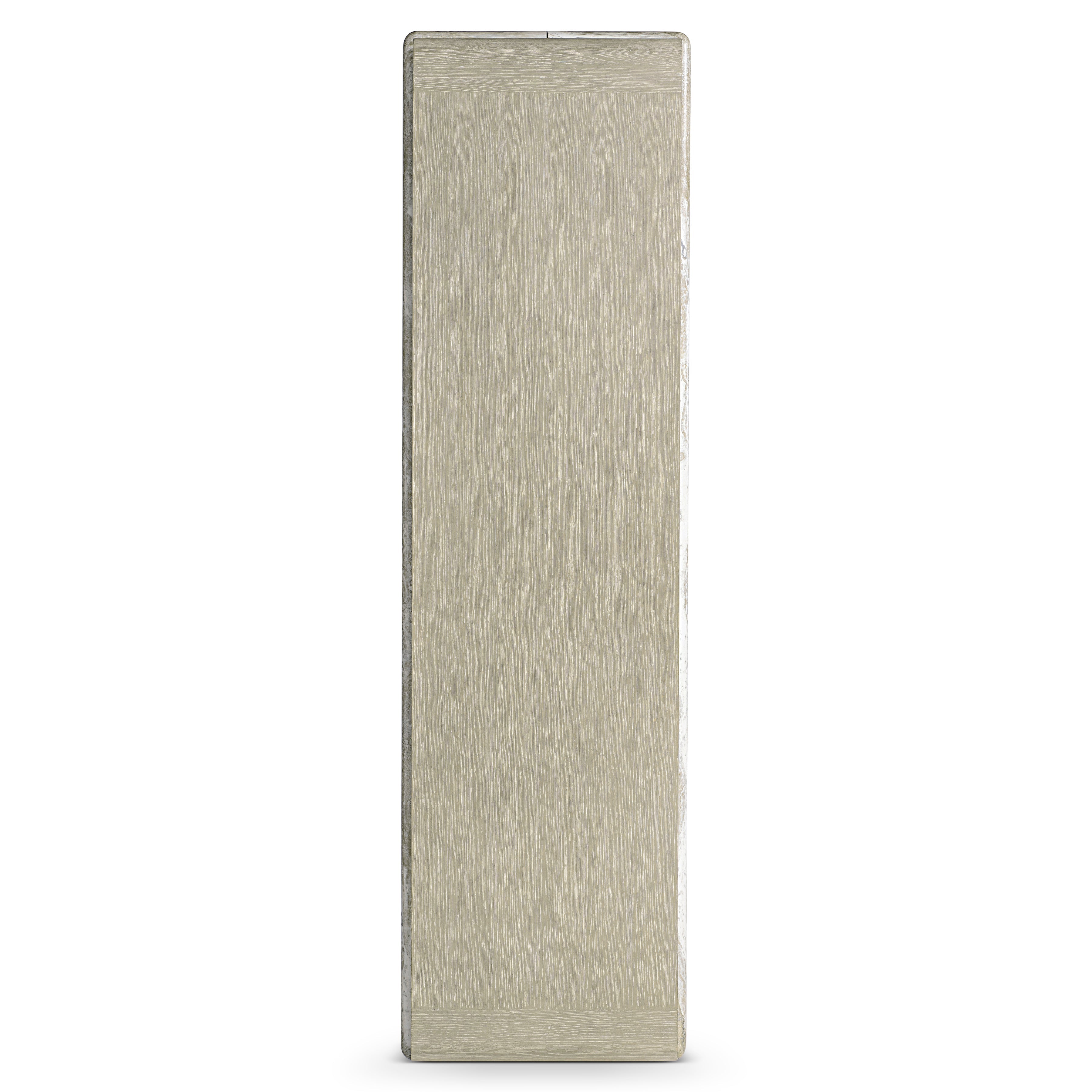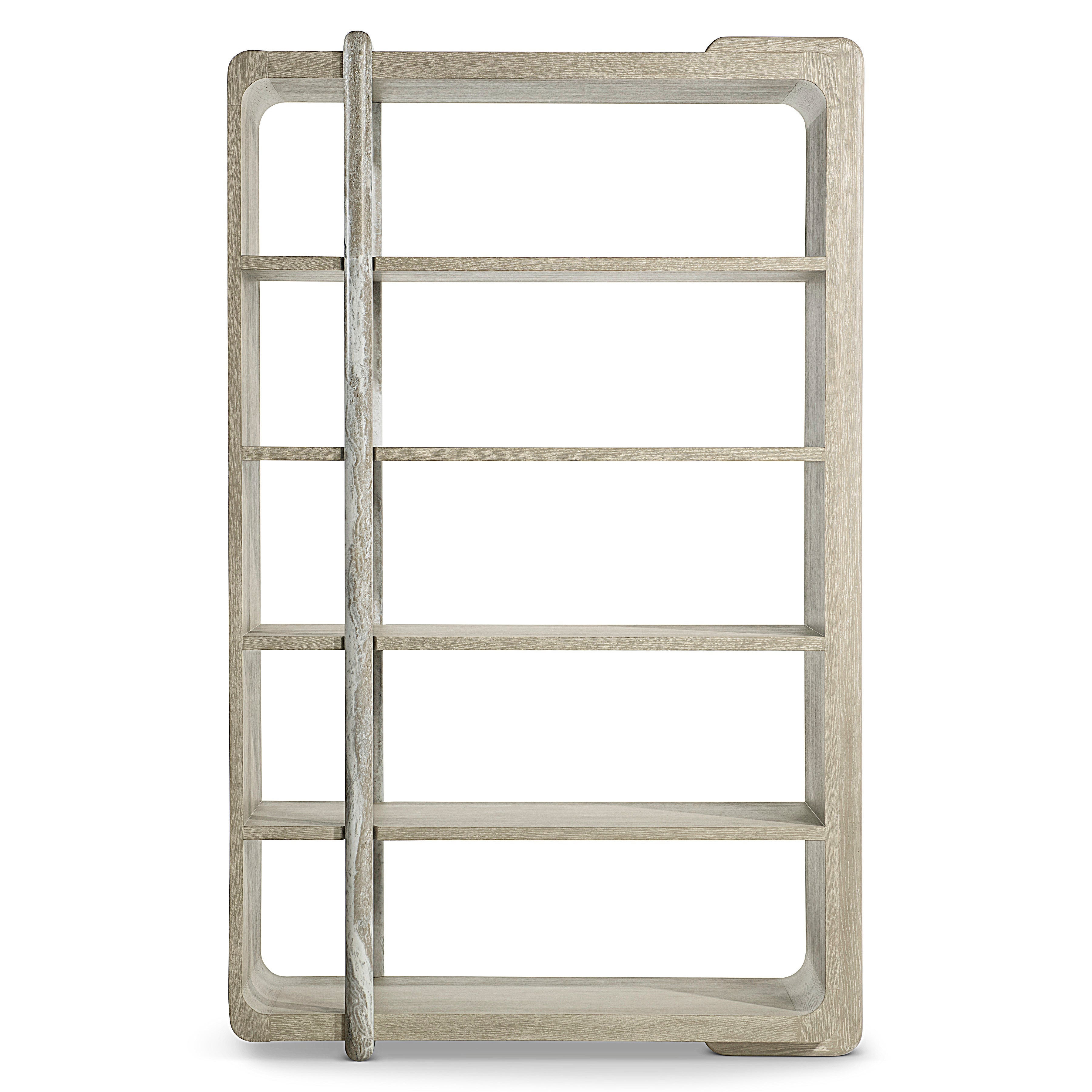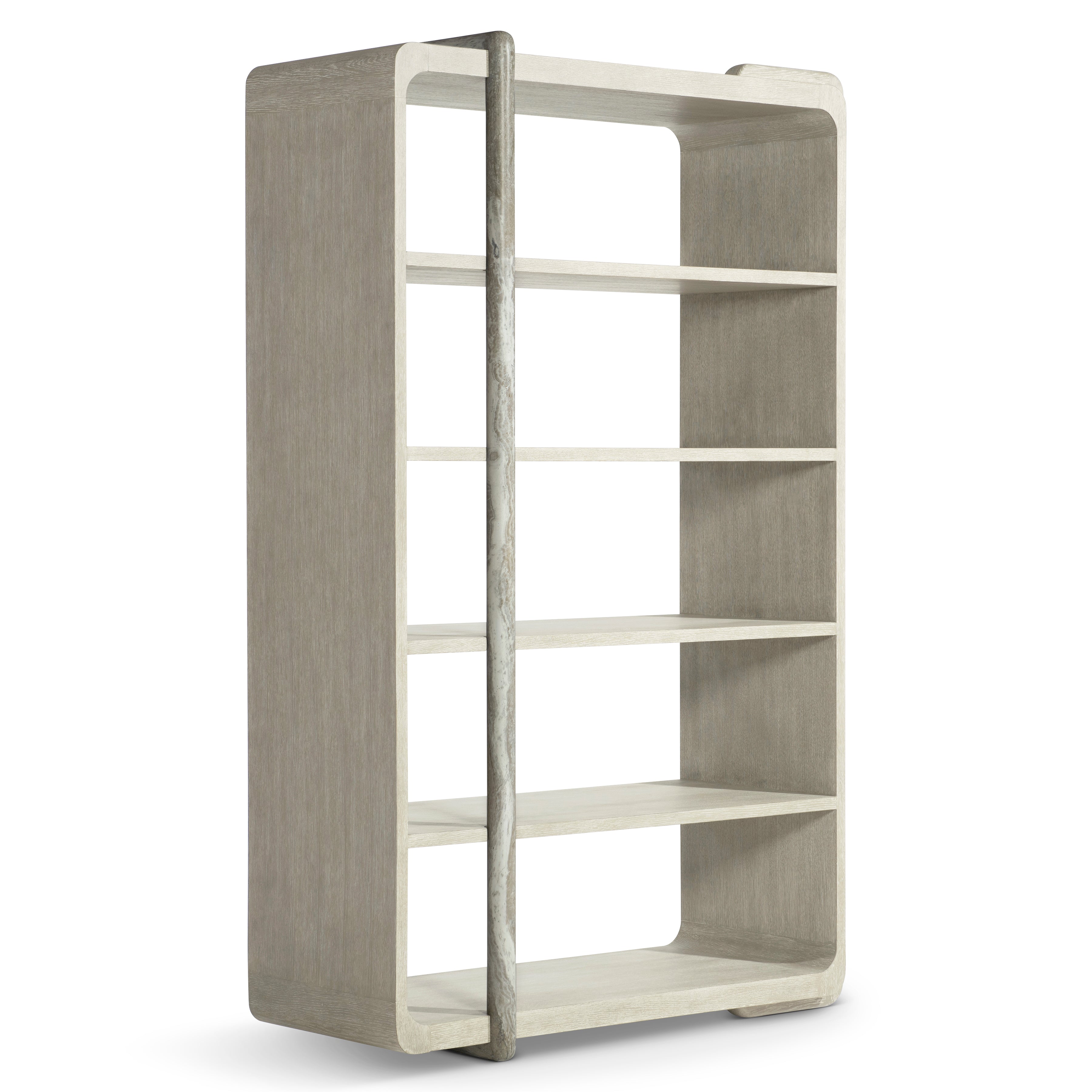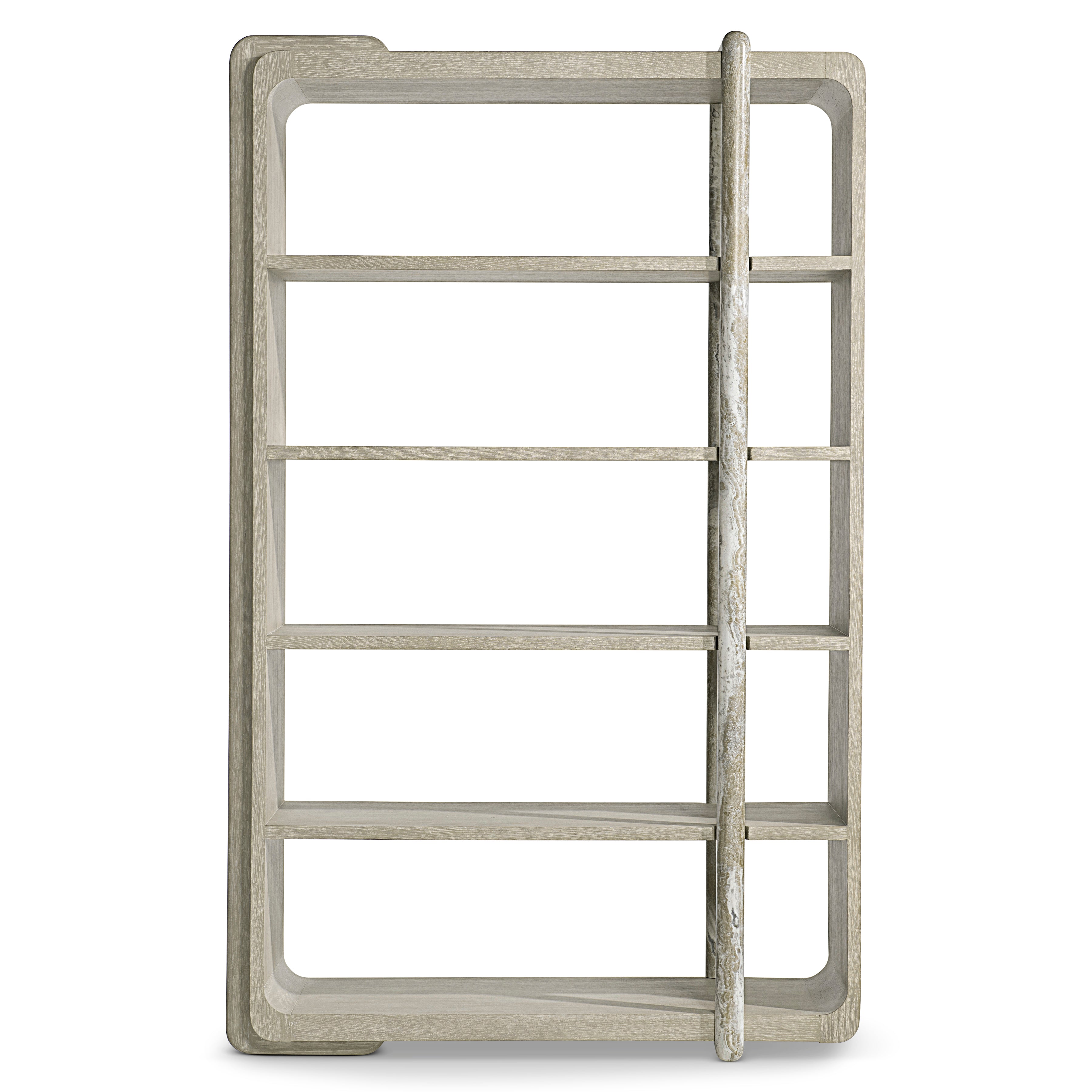 Wrapped shapes and a textural style give the Arcadia etagere a standout design in oak and faux stone. A rounded wood brace in Clay finish curves over one side of the case, while a faux stone post in Kalta encircles the front and back.