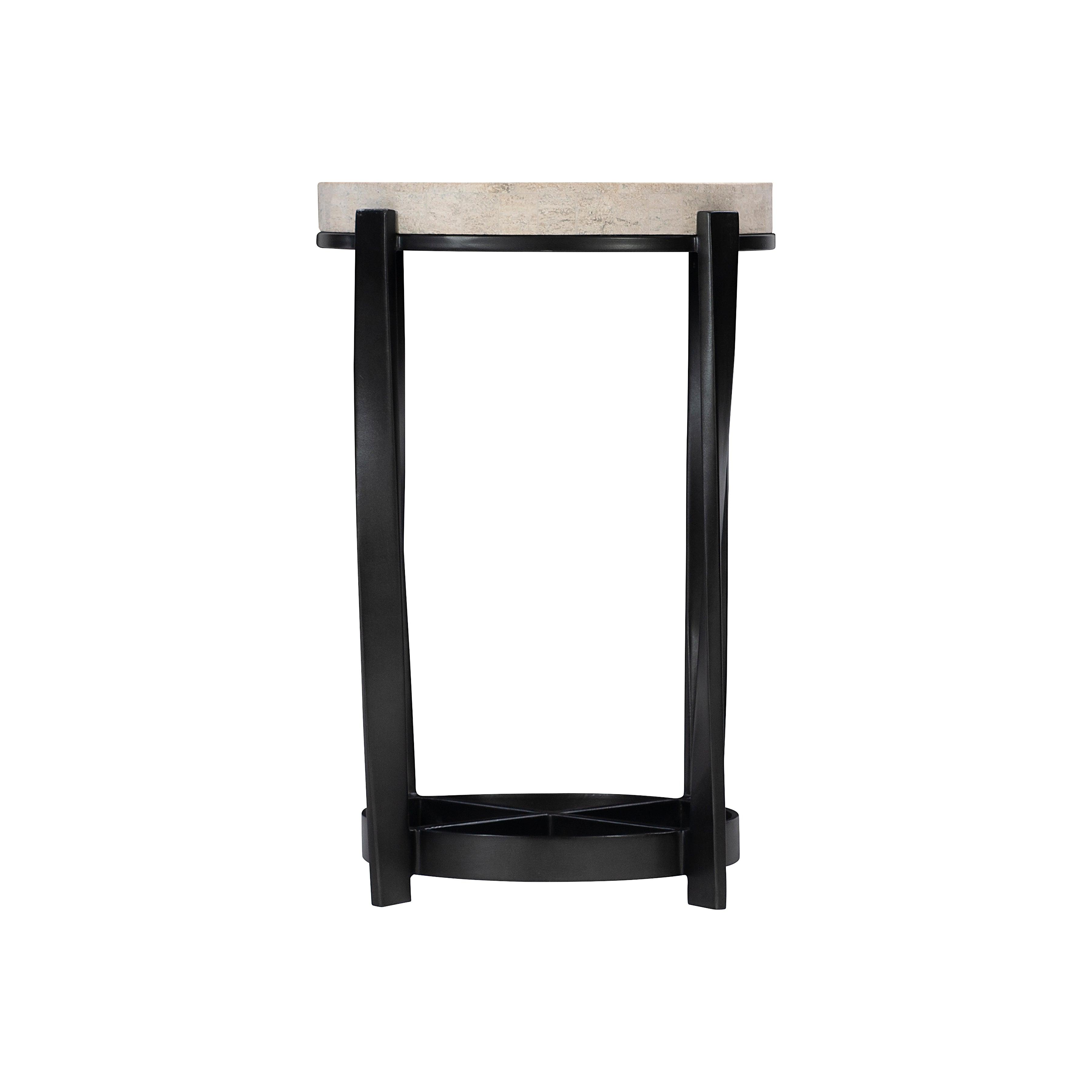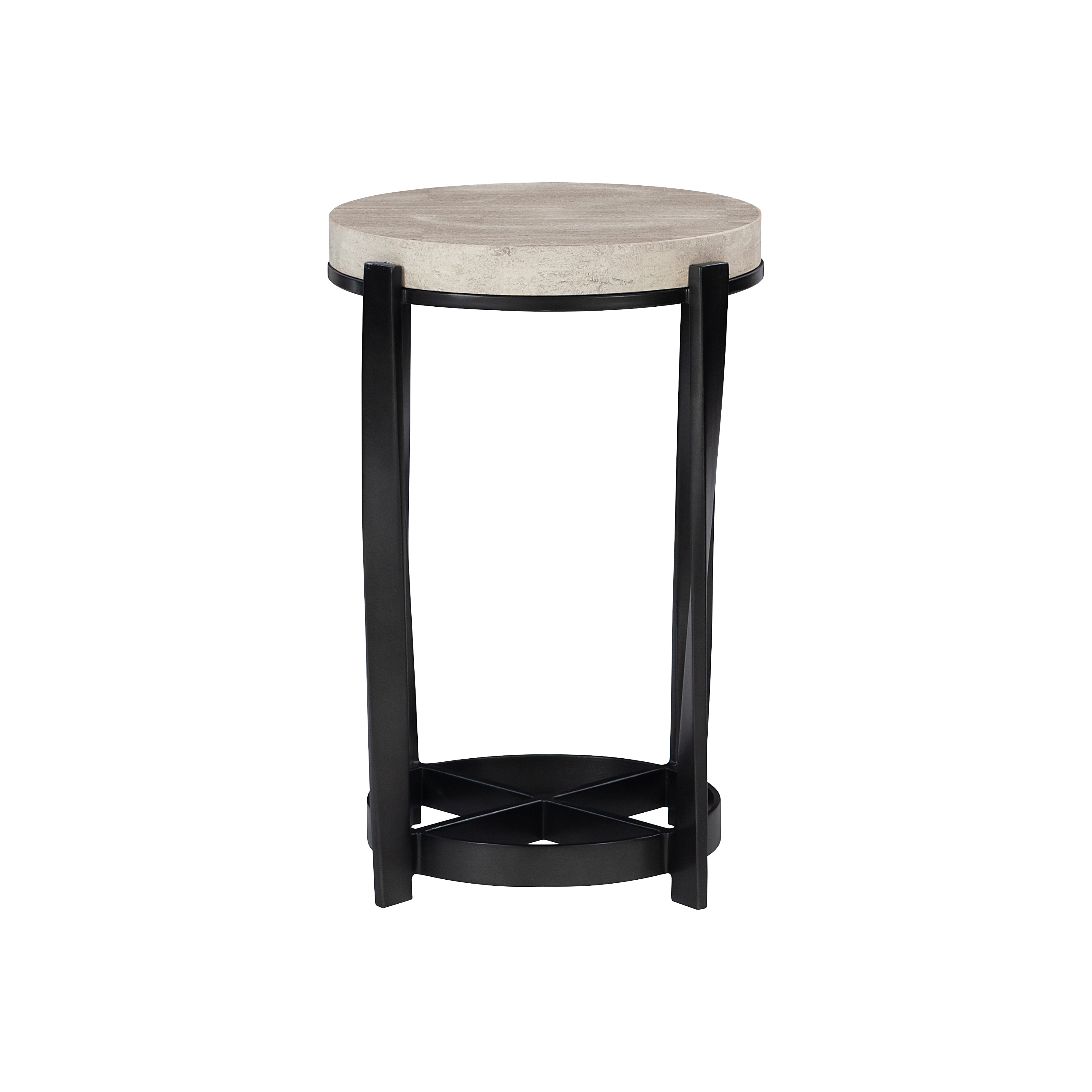 Bernhardt Occasional offers a range of upscale designs for luxe living spaces. The Berkshire accent table pairs elegant stone with textured steel. Finished in aged pewter, the dark metal base contrasts with the organic, neutral hues of the round stone top. Twisted steel legs add movement and visual interest.
