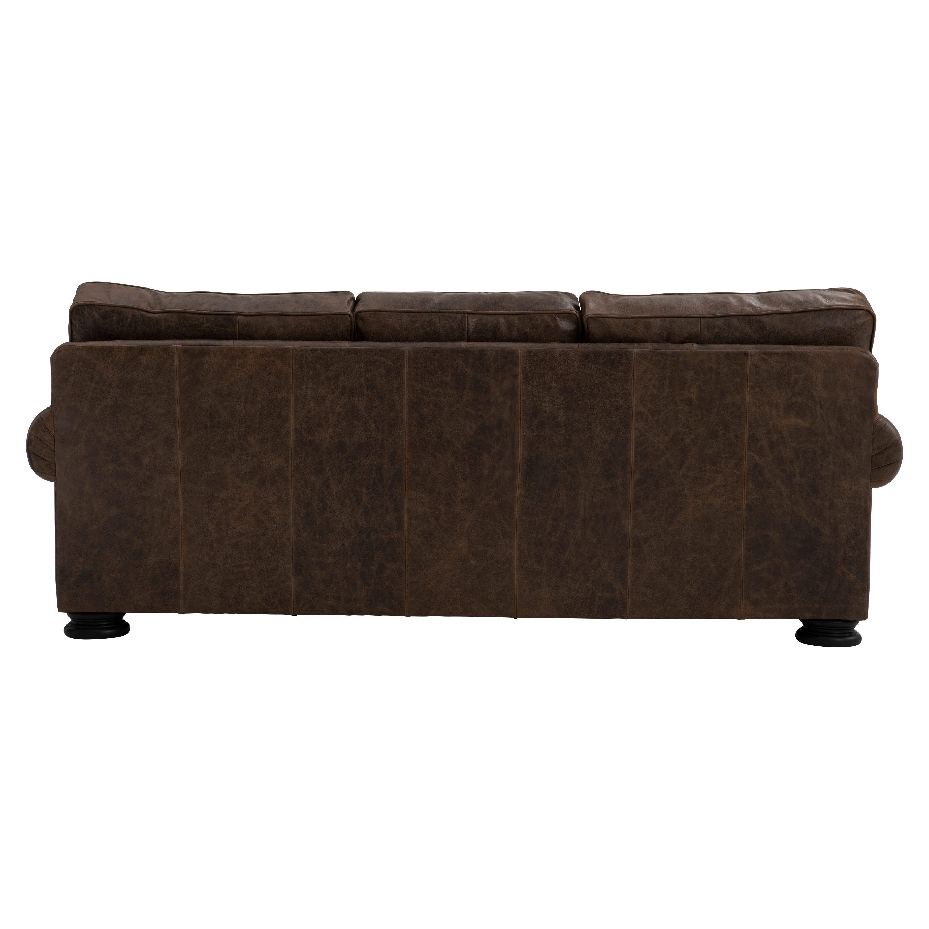 The stately Foster leather sofa offers comfortable support with an air of traditional grandeur. The plush cushions invite relaxation, while rolled arms, nailhead trim, and wide bun feet exude refinement. Throw pillows complement the sofa and surrounding decor.