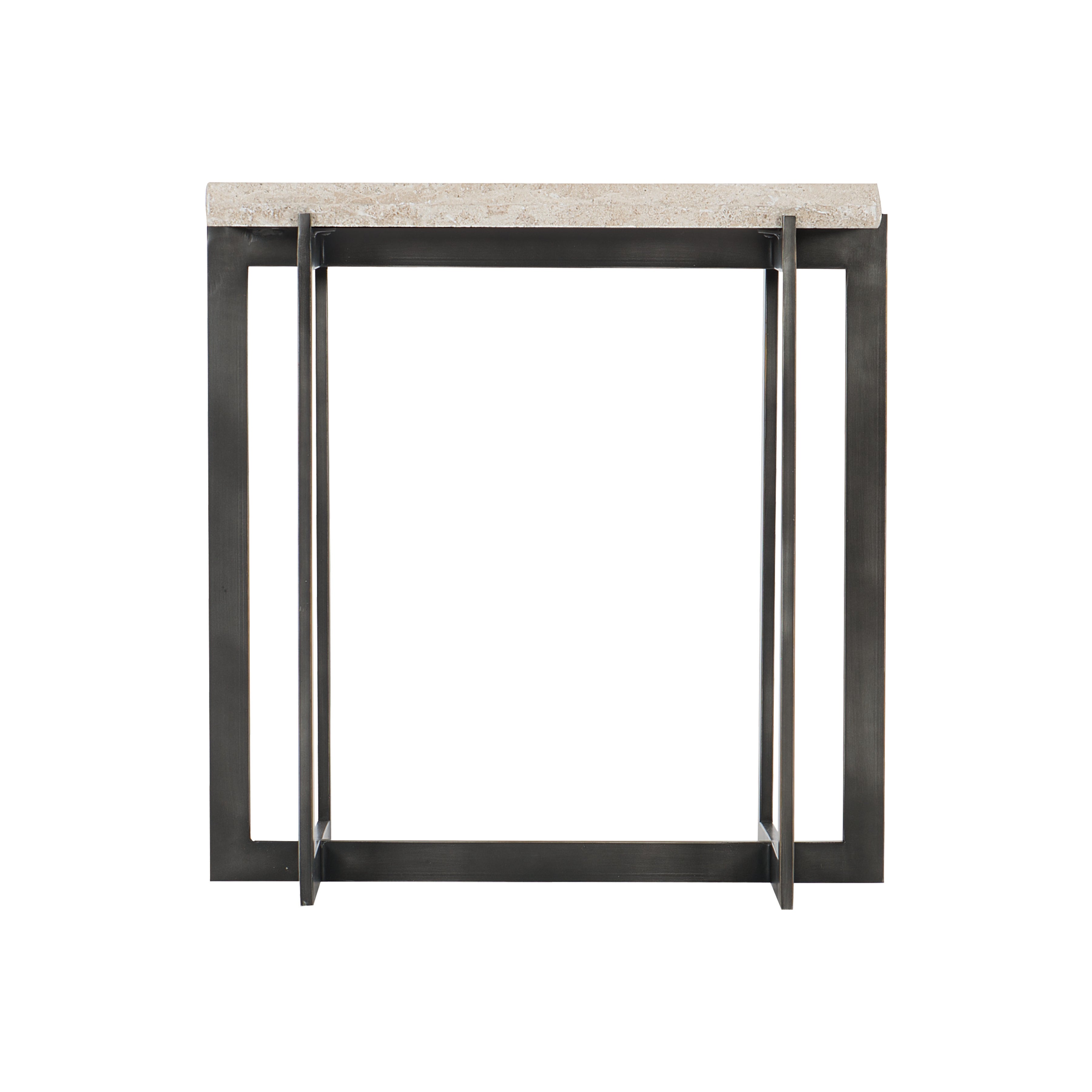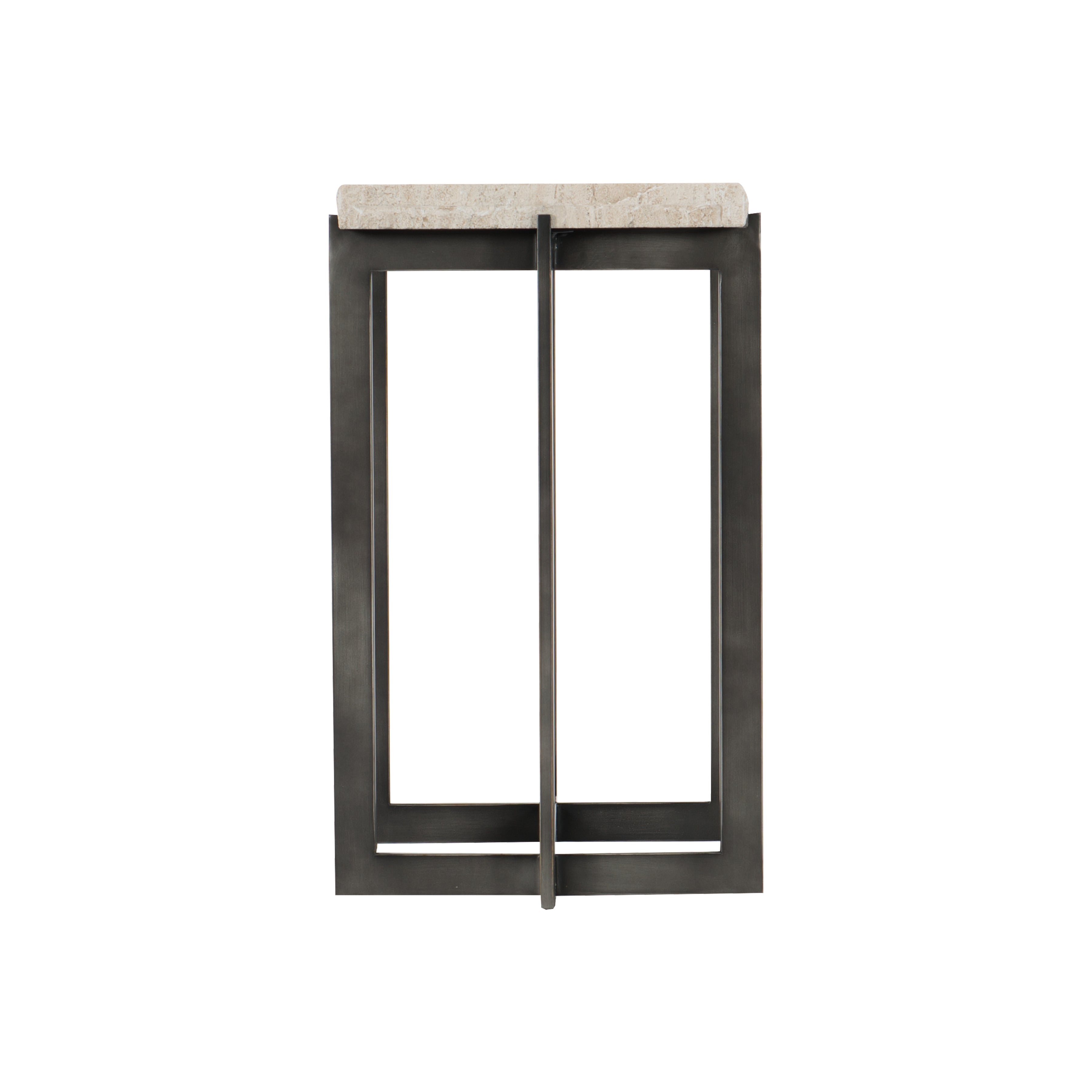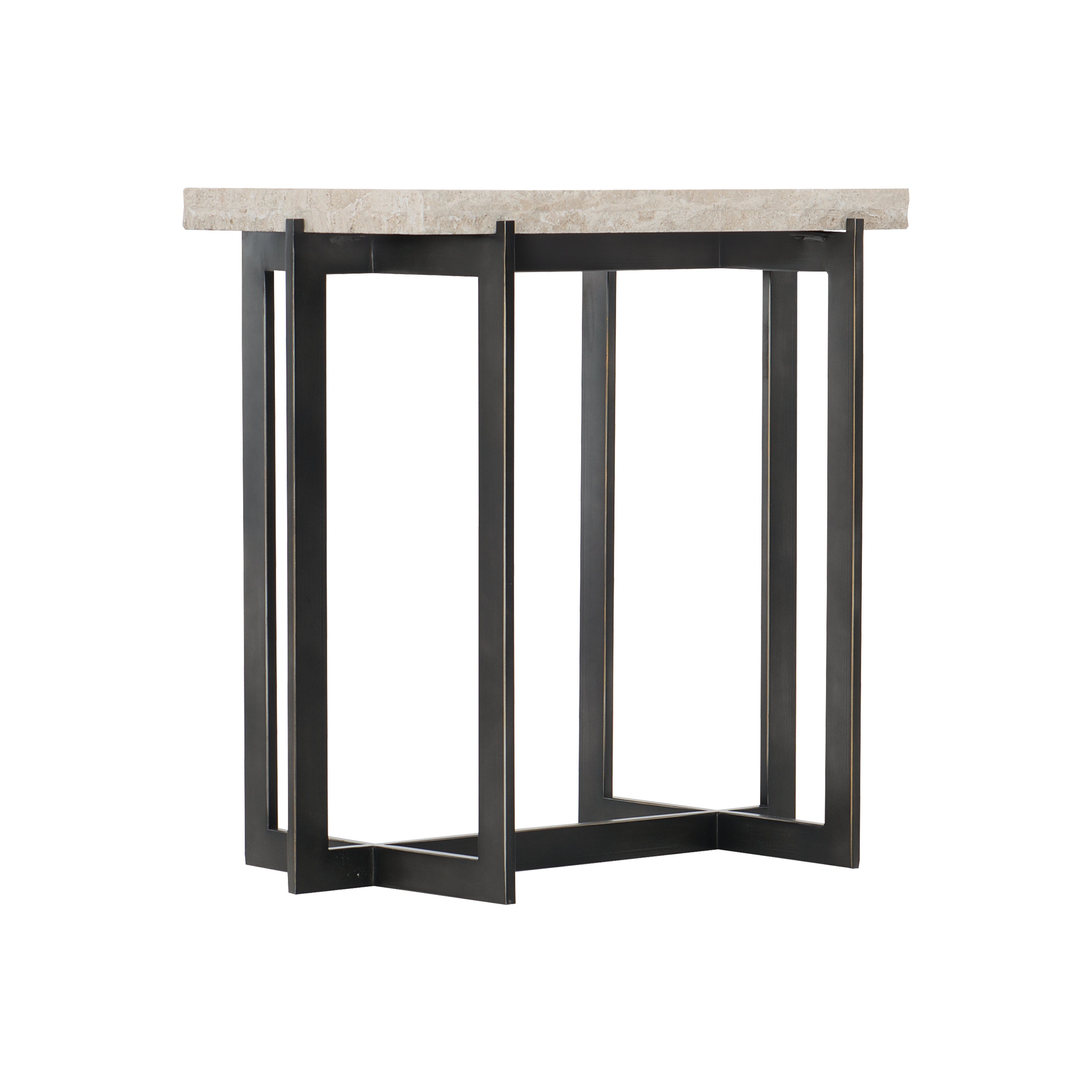 Bernhardt Occasional offers upscale designs for luxe living spaces. The Hathaway drink table presents contemporary style with geometric leanings. With origins in mid-century design, the sleek tubular steel base provides structural stability and clean, bold lines. An oil-rubbed bronze finish on the base creates an engaging contrast with the white travertine stone top, which features a chiseled edge.
