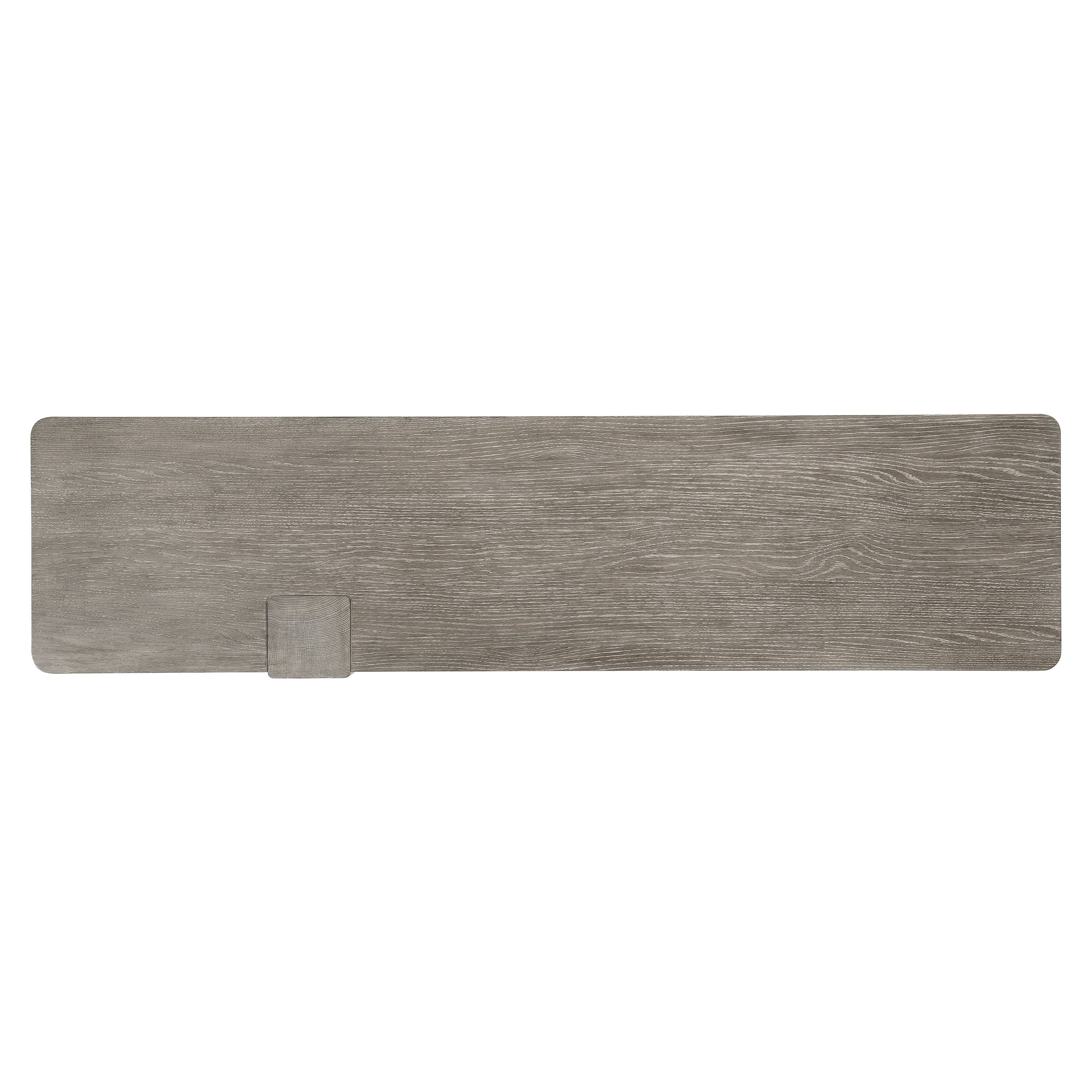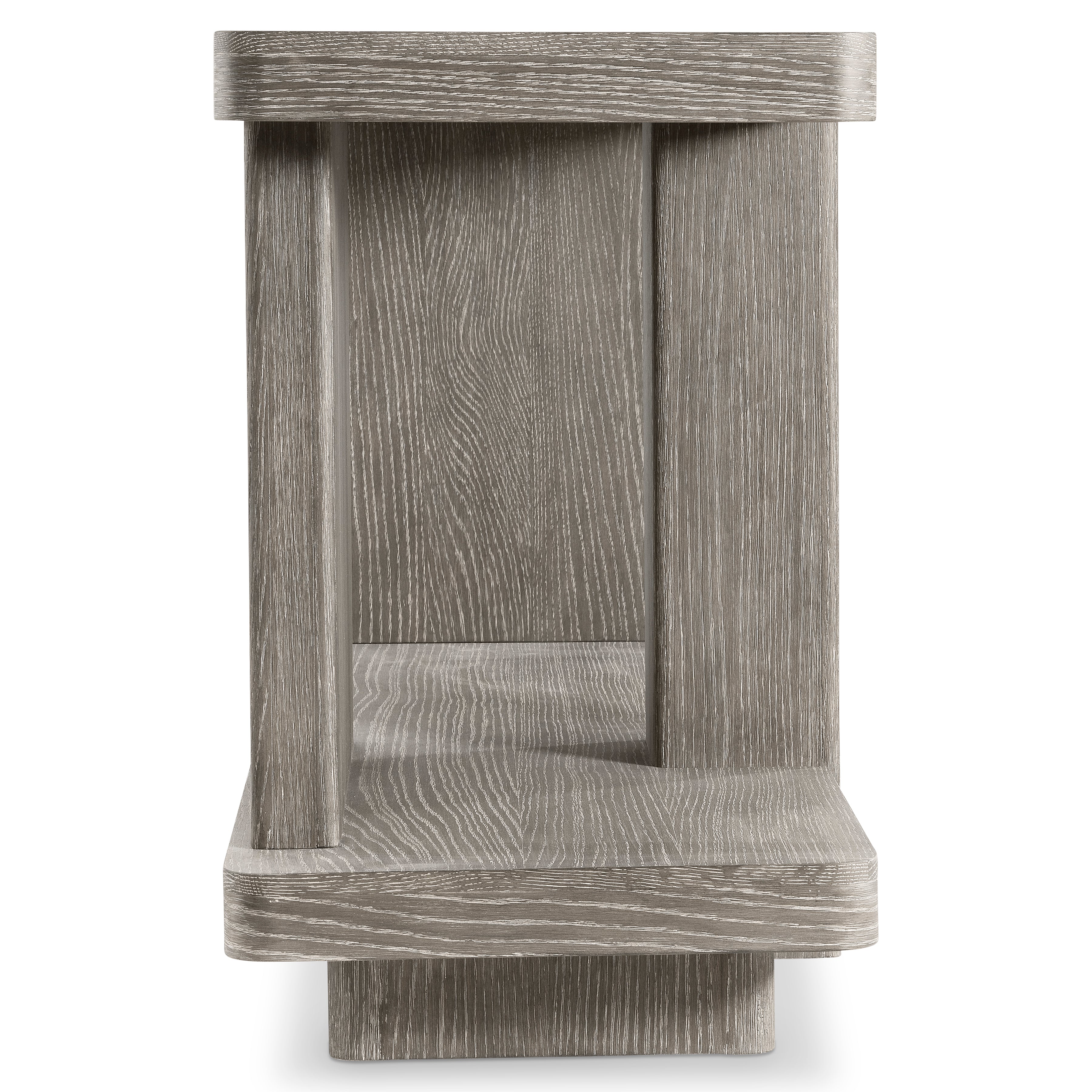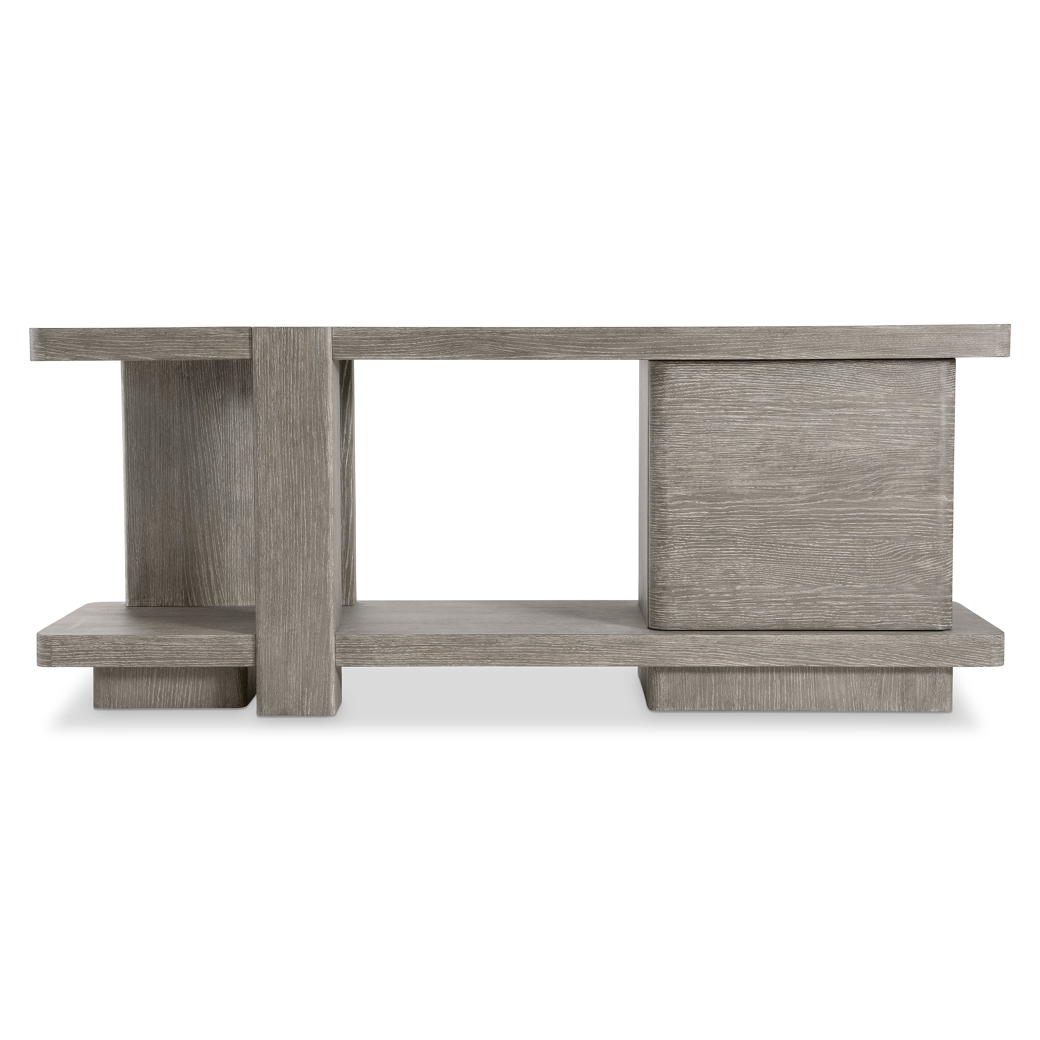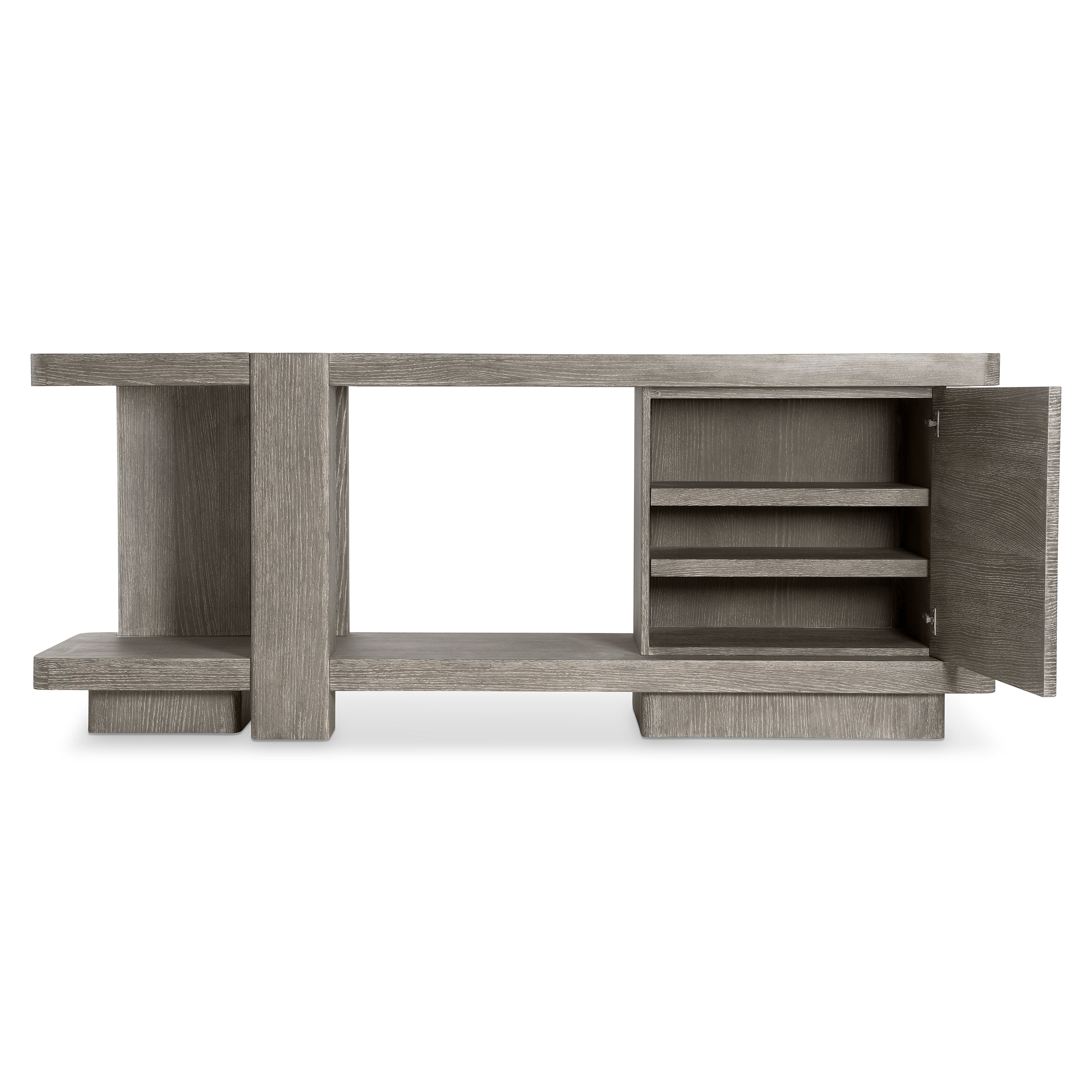 An offset vertical post pierces the top of the Monolith entertainment credenza, giving it an asymmetrical style. A second back panel connects to a plinth base, while a push-to-open door on the right reveals adjustable shelves. The wirebrushed wood highlights the natural grain in Puma finish.