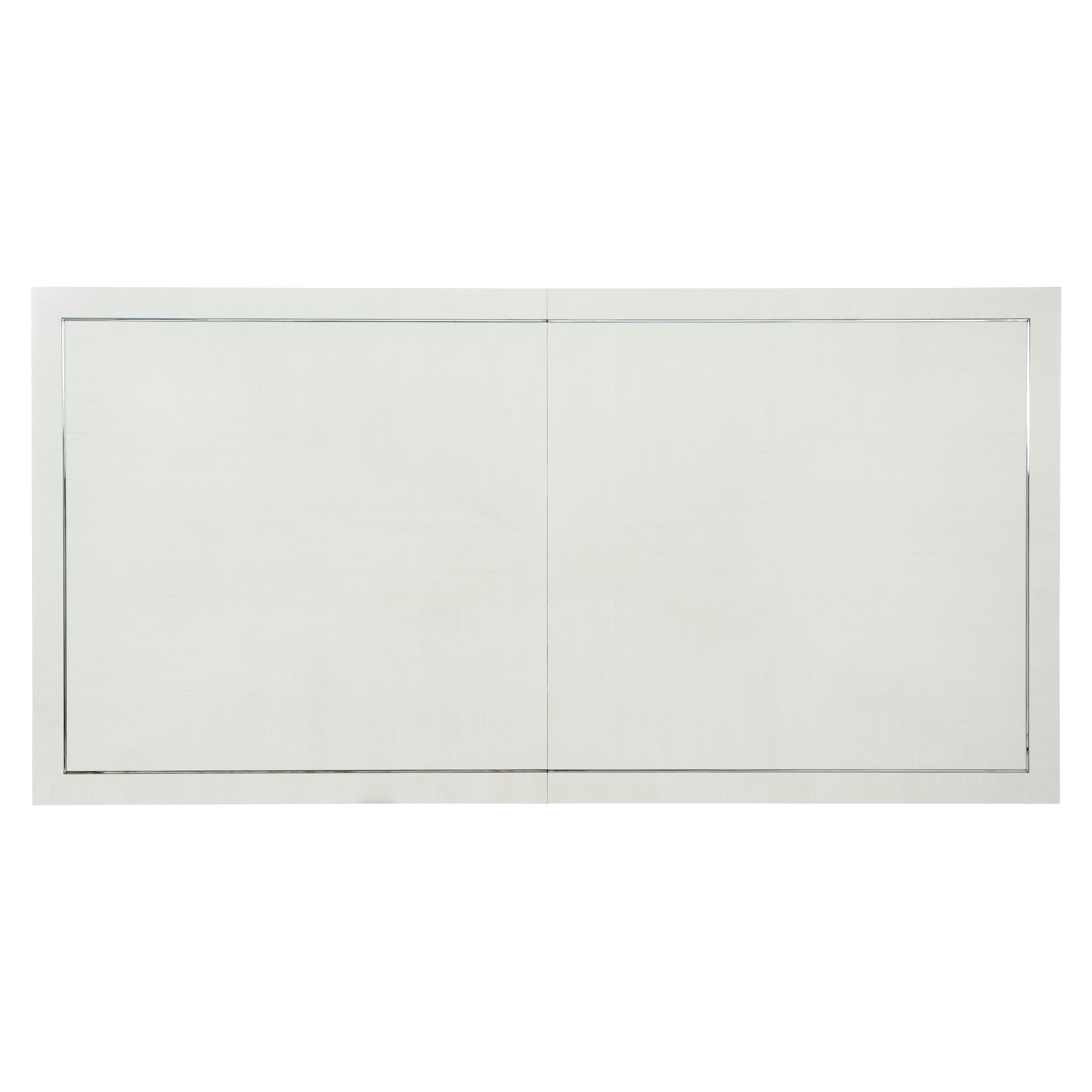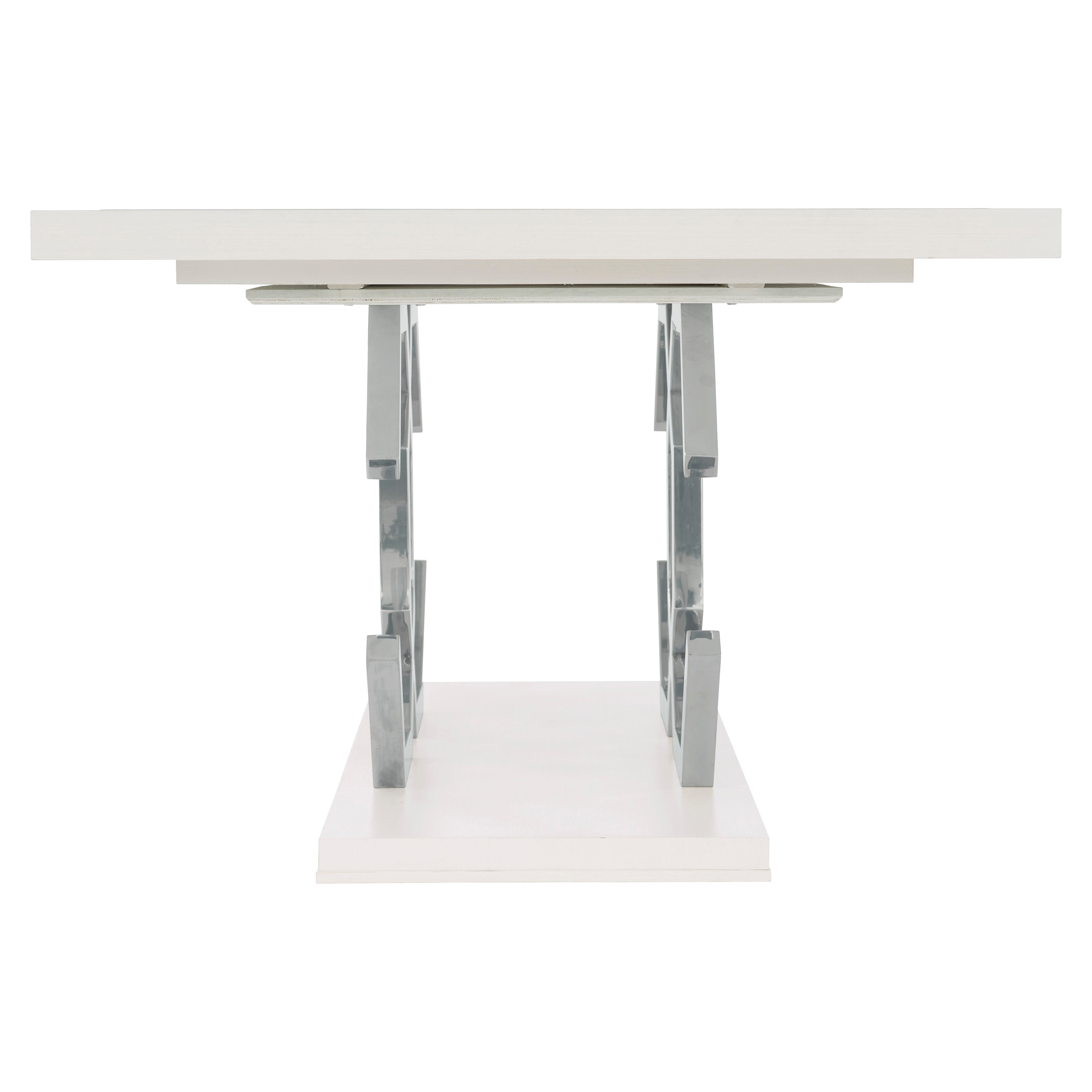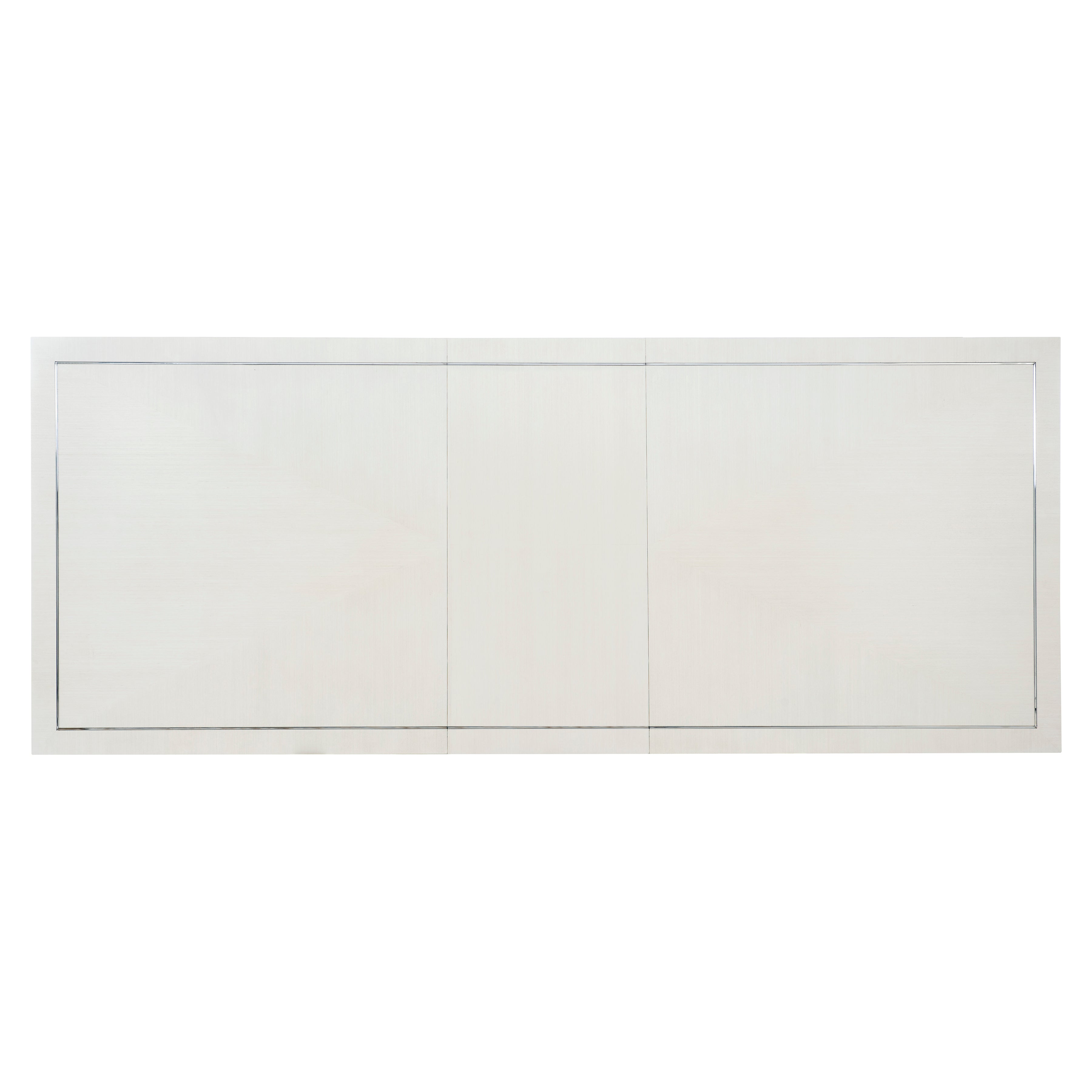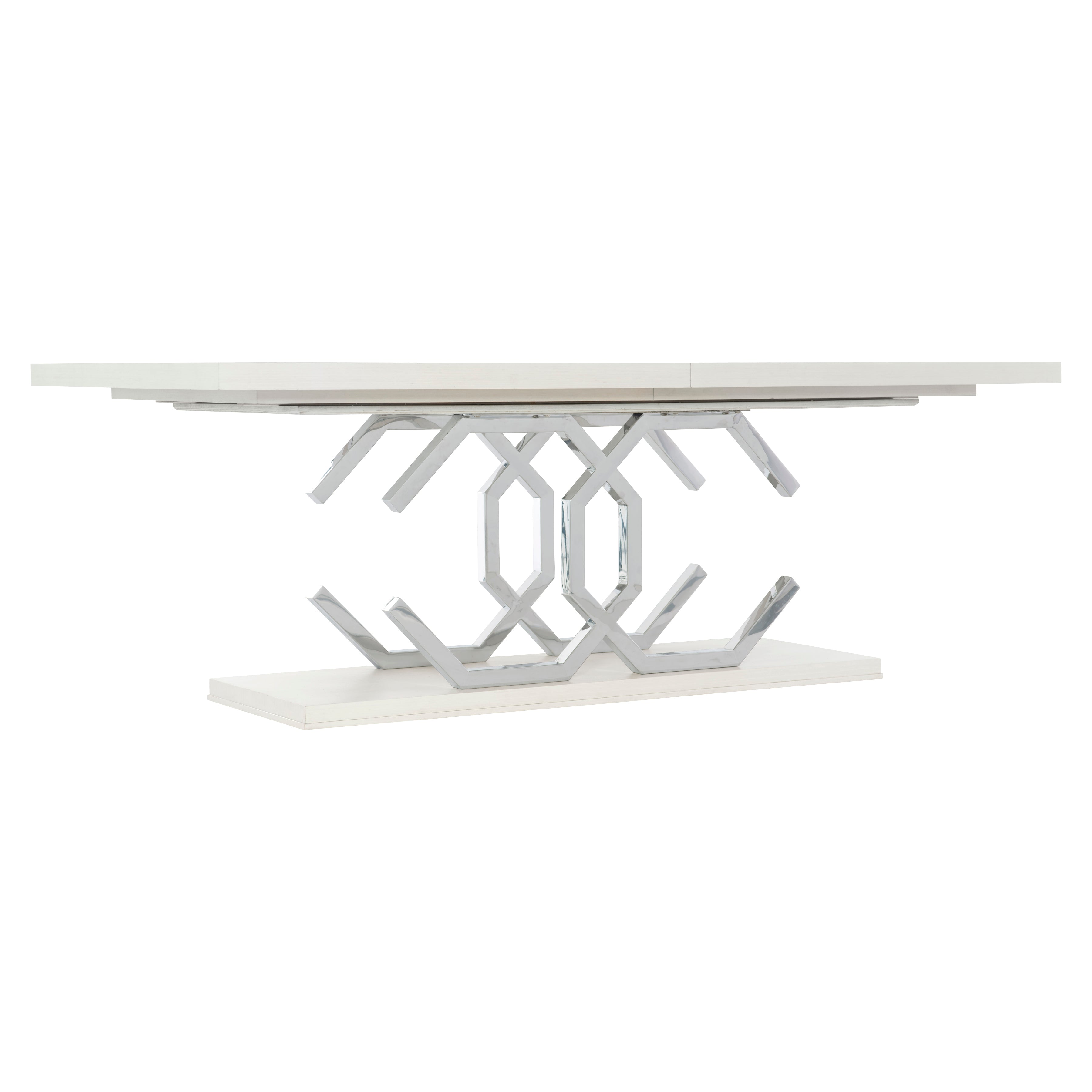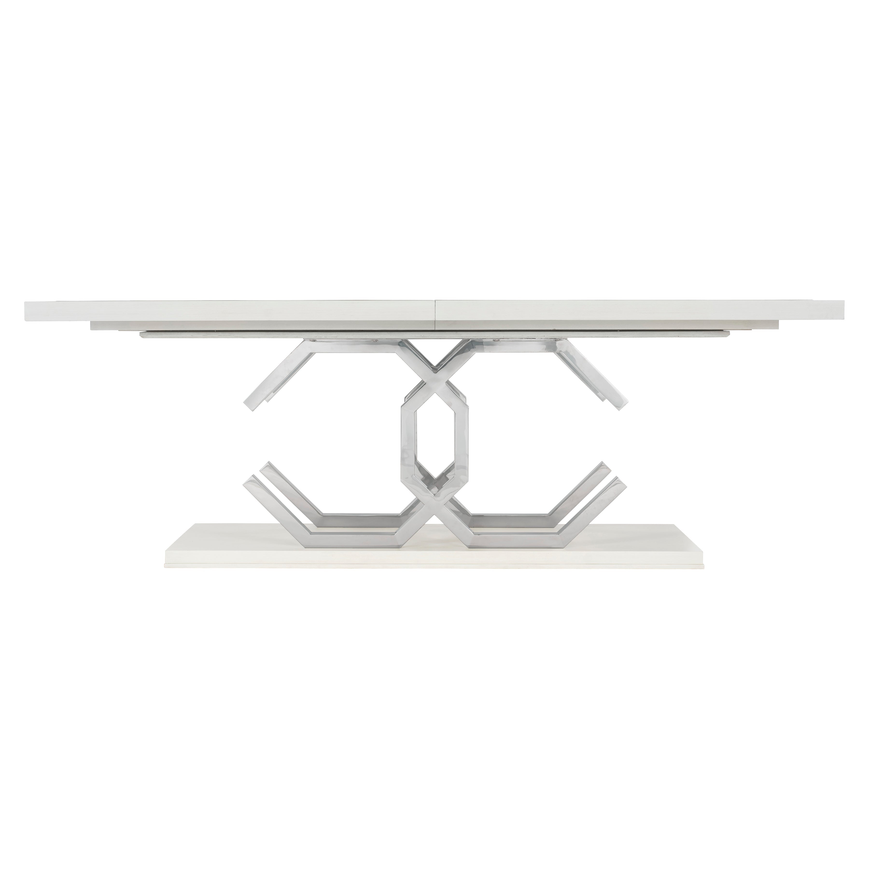 Silhouette is defined by bold contrasts, clean lines and a hint of Hollywood Regency glamour. The rectangular Silhouette dining table is sculptural and unique. Finished in Eggshell, the fancy face top features a stainless steel inlay border. The two pedestals bring geometric appeal as interlocking open octagons. Throughout the piece, polished stainless steel adds a luxe, mirror-like shine.
