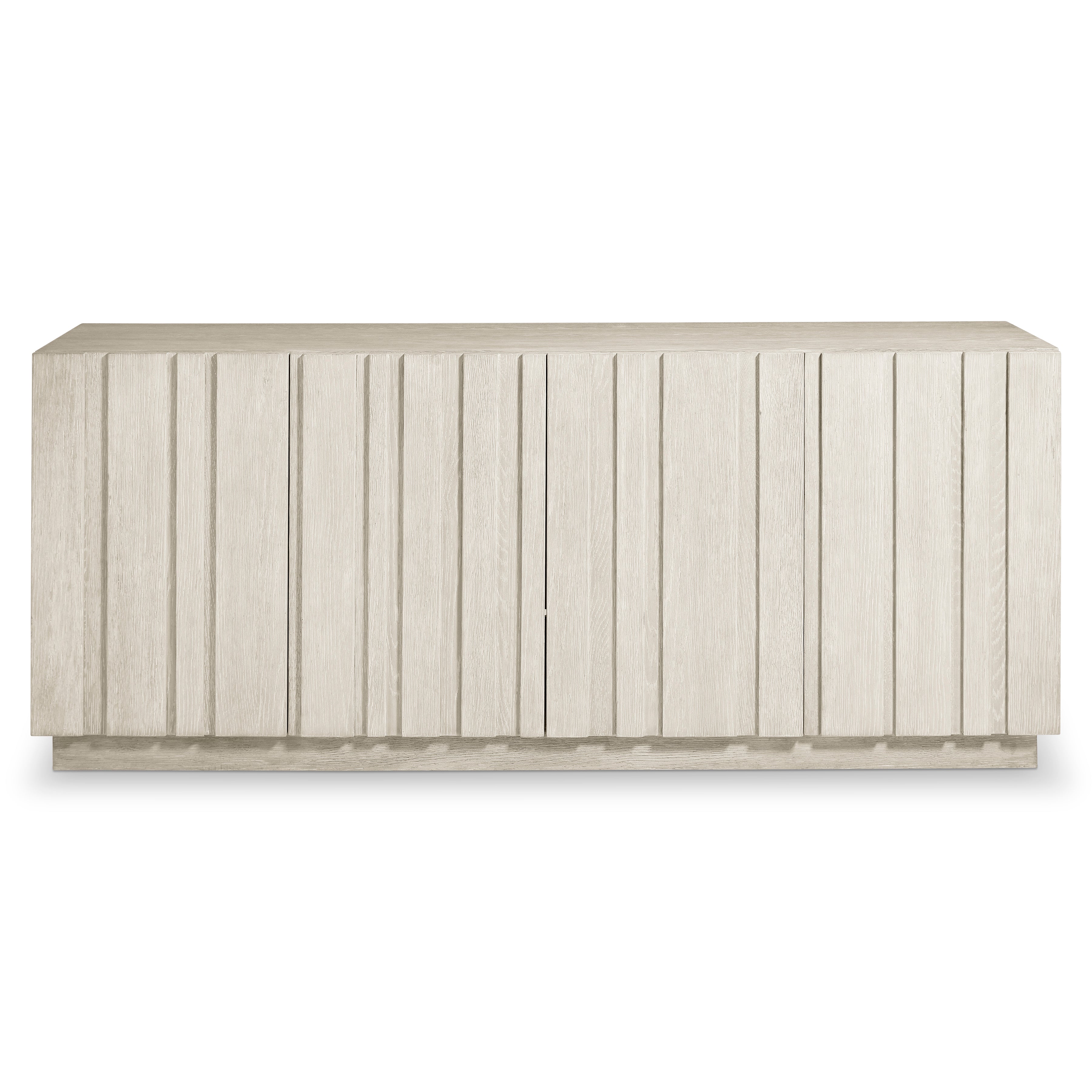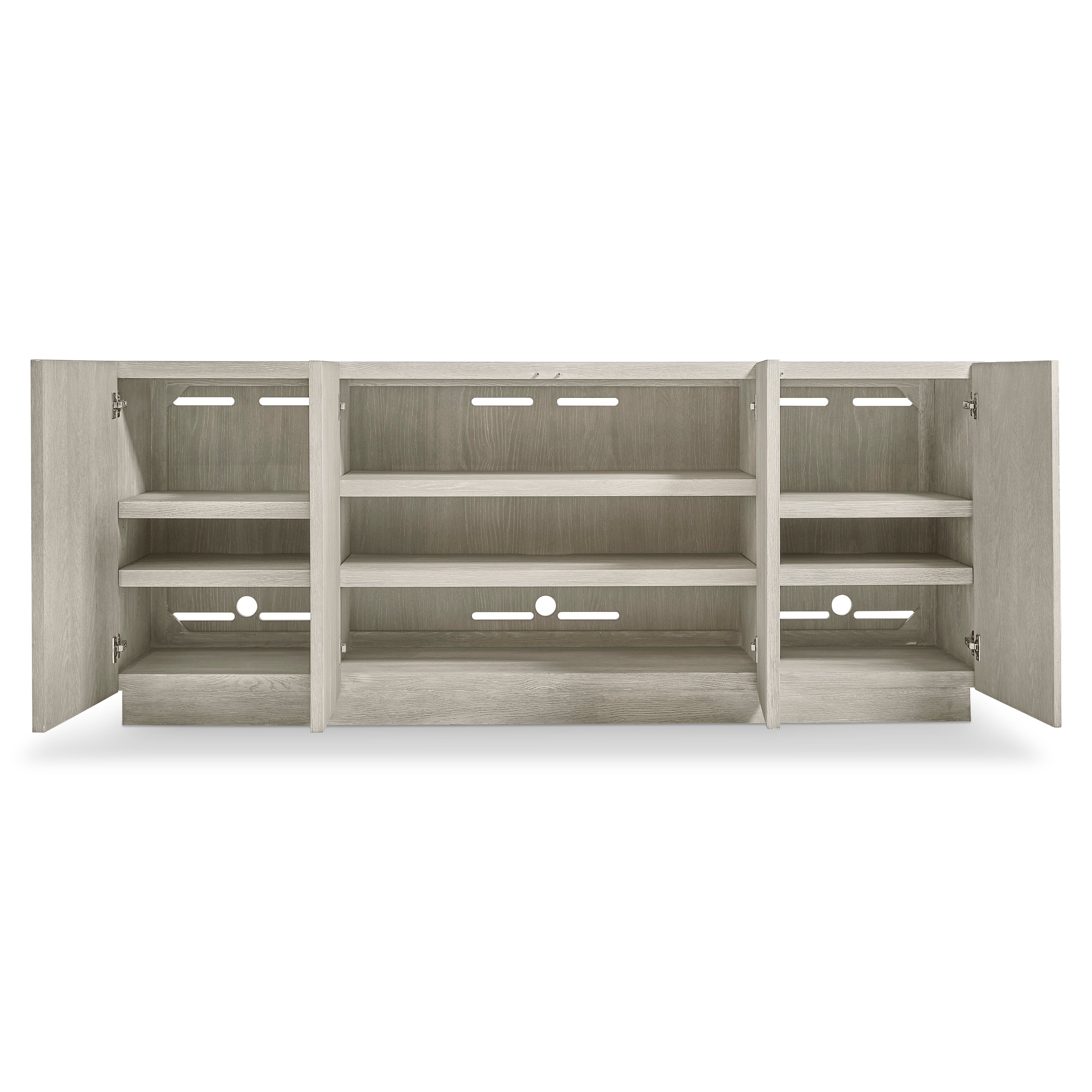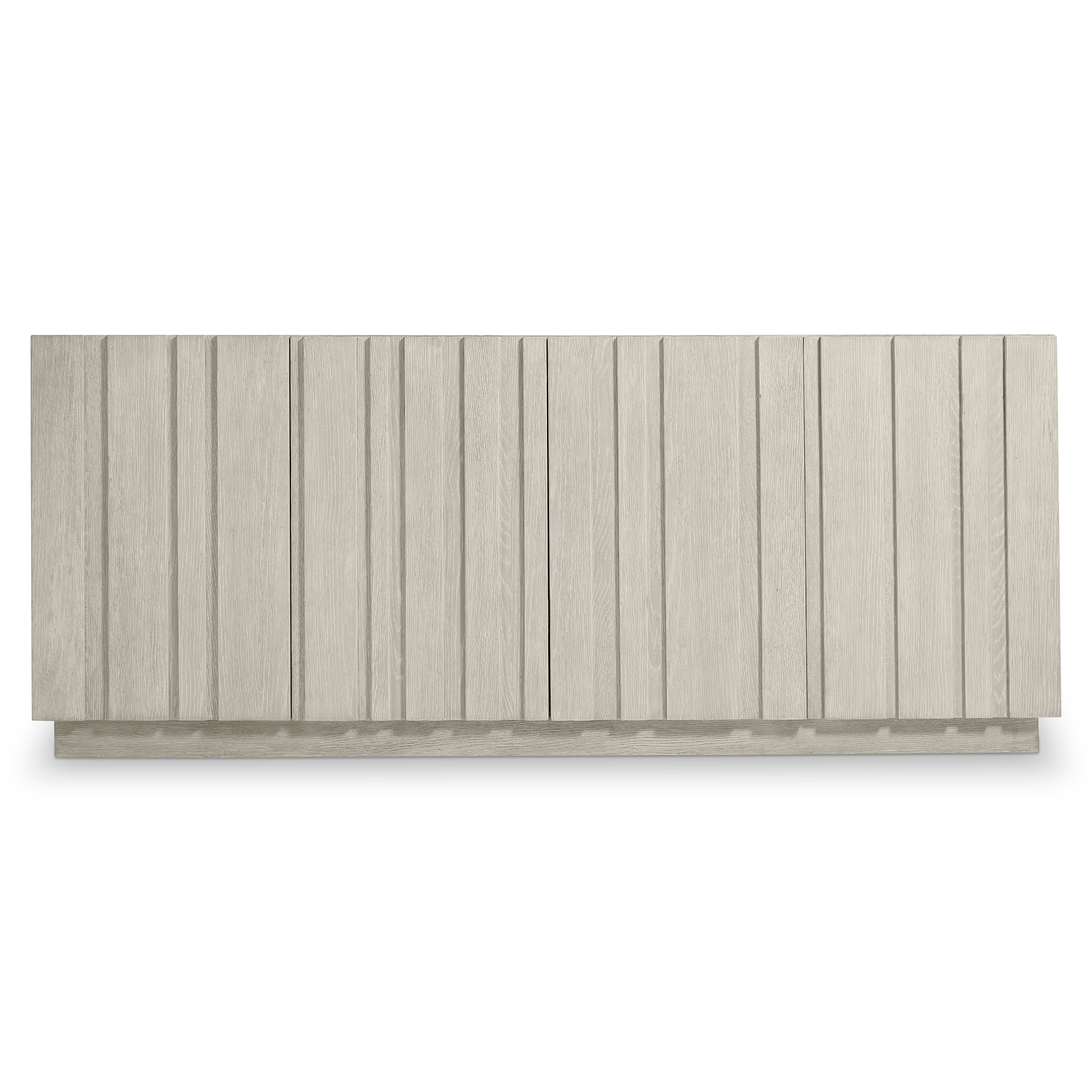 Rhythmic vertical panels of wood create a beautiful depth and dimension on the Tempo entertainment credenza. Crafted of wirebrushed oak in Larza finish, the credenza has four push-to-open doors and sits on a plinth base. The interior offers six adjustable shelves.