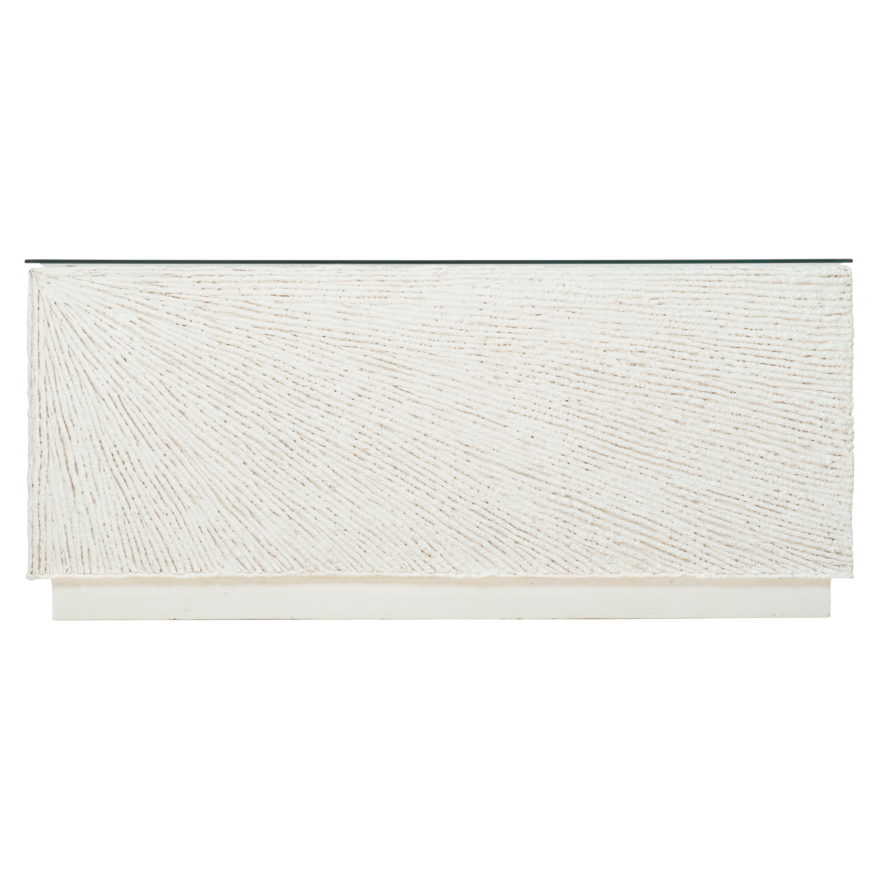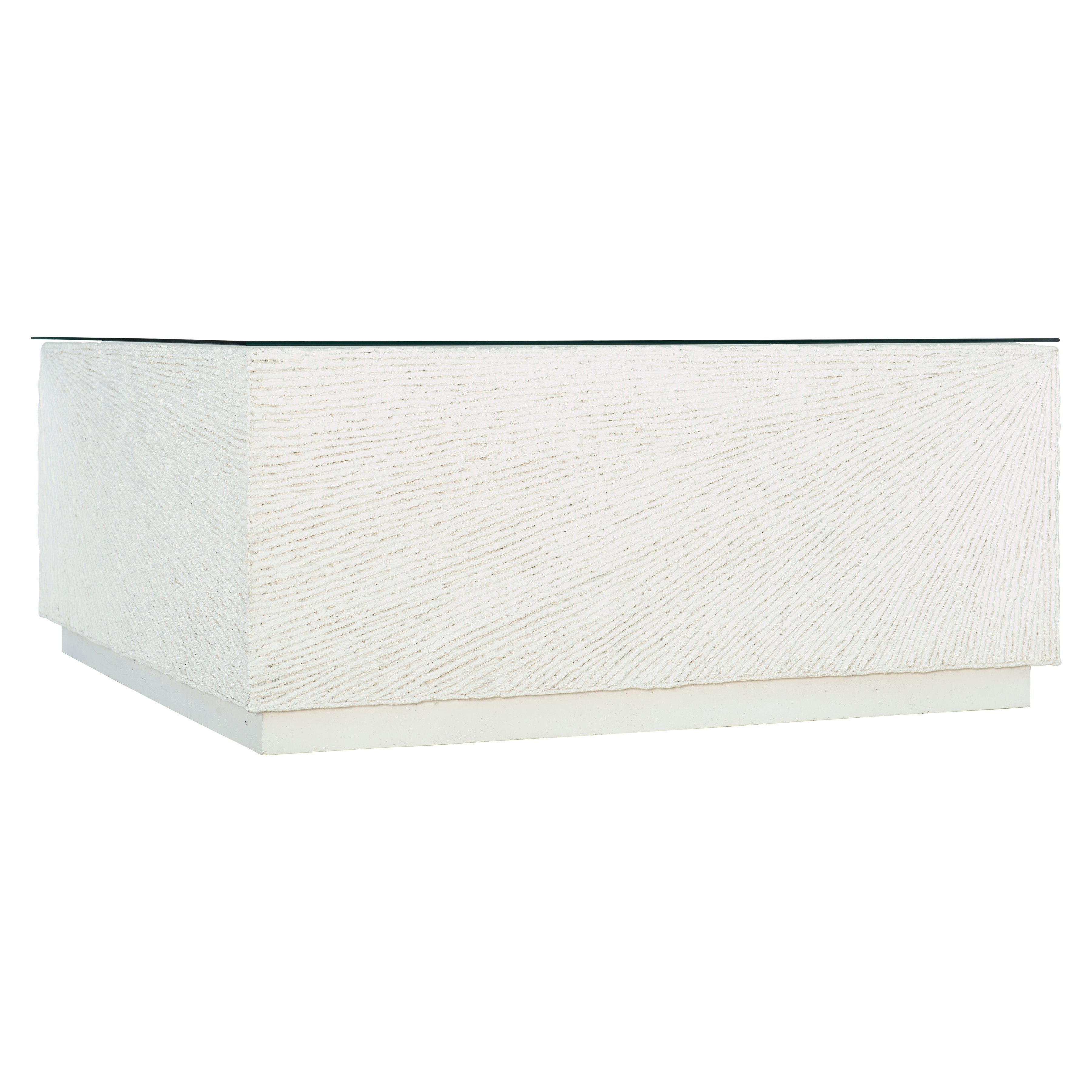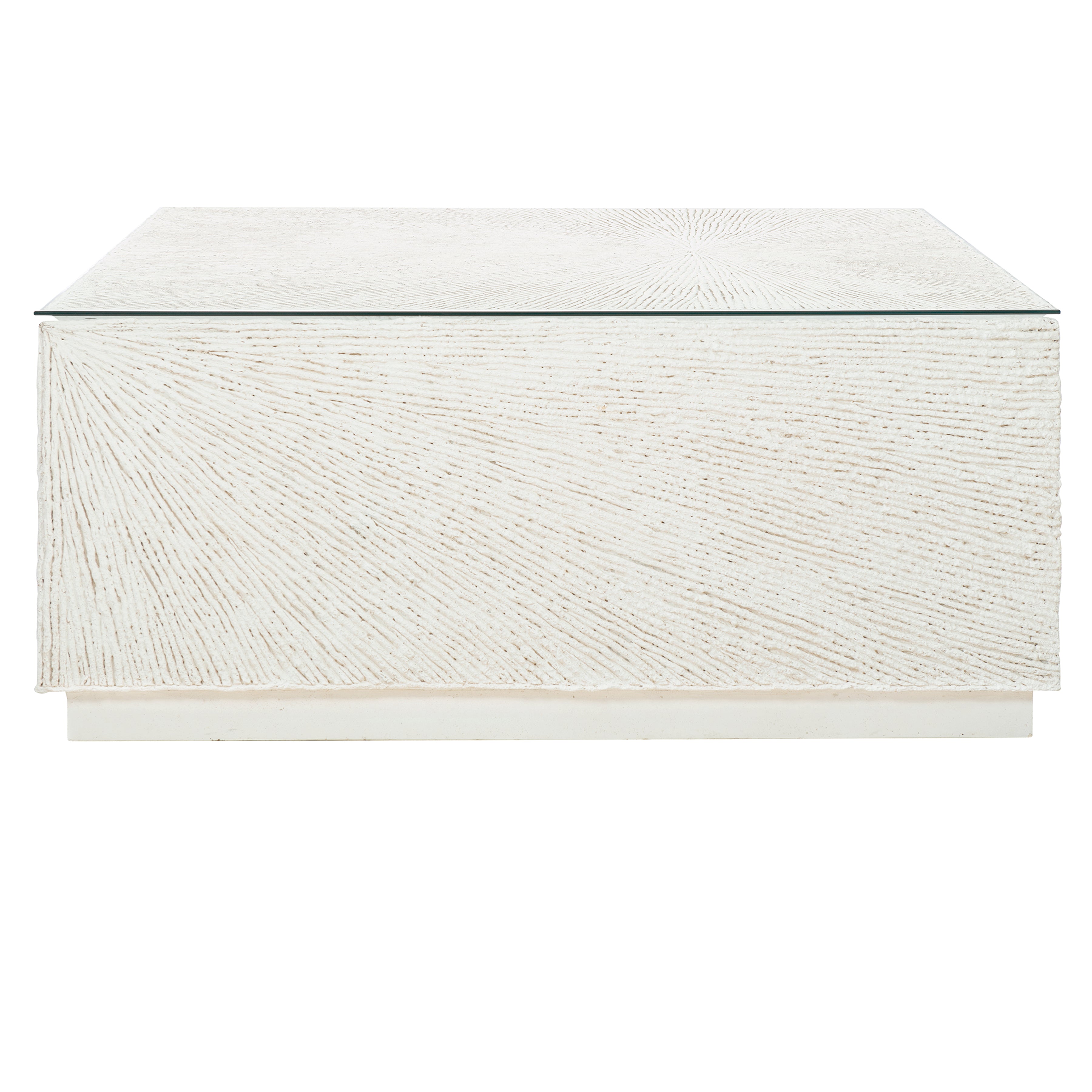 Characterized by exceptional luxury and sophisticated design, Bernhardt Exteriors offers a selection of elegant yet durable accent tables for every type of setting. The Tenerife cocktail table is crafted from natural stonecast with a unique coco twig pattern. A lay-on tempered glass top with a polished edge provides a smooth, sleek contrast to the textured stonecast. Clean and simple, this table reflects a stylish, modern approach to outdoor design.