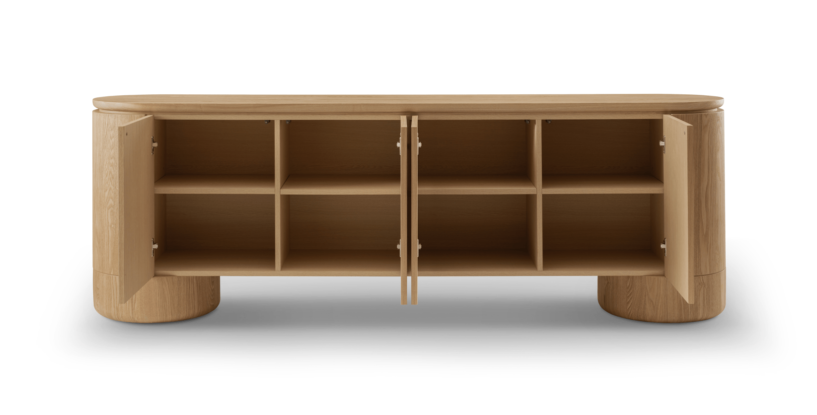 The surface feels refined yet tactile, while the four-door facade offers a rhythm of gentle repetition. Minimal hardware keeps the look seamless and uncluttered, allowing the character of the wood to take centre stage. Whether viewed front-on or in profile, the piece speaks to symmetry and intention — a grounded, sculptural storage solution with serene impact.