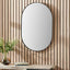 This oval shape mirror has a slim frame, the slender metal frame is finished in a minimalistic matt black. The large mirrored area and delicate styling makes this a versatile piece and the perfect addition to your home. Not suitable for bathroom use.