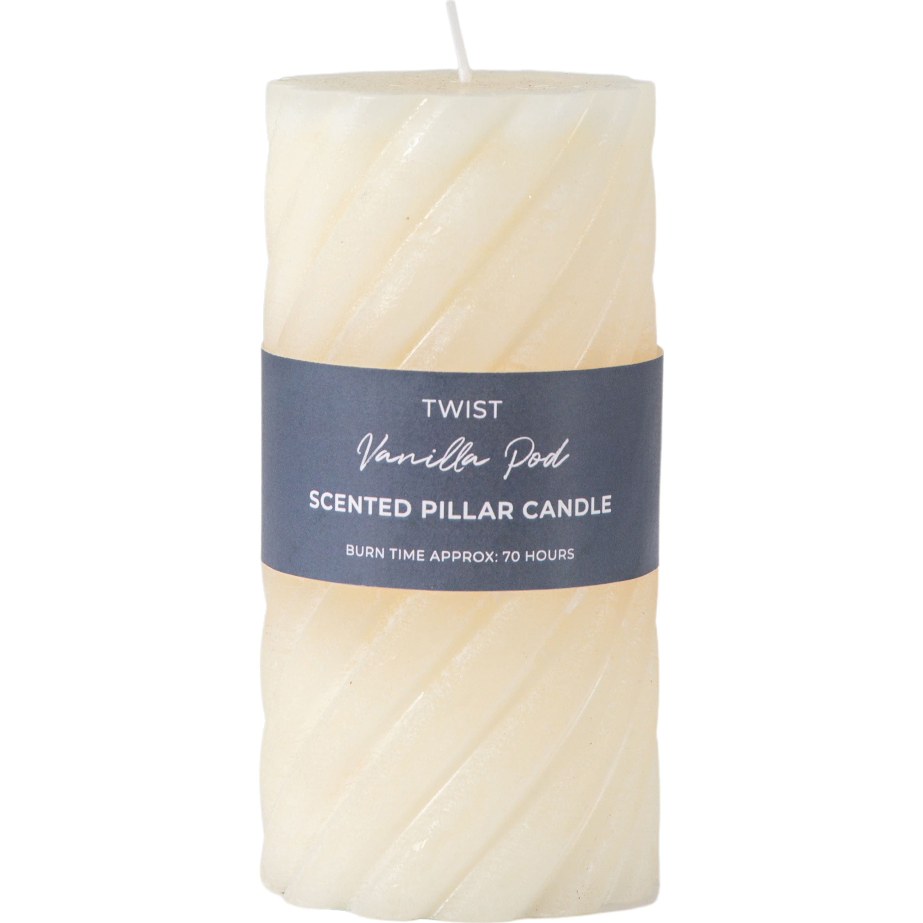 Classic pillar candle with a contemporary twist design in a clean ivory colour and vanilla scent, perfect addition to a candlestick or lantern. Burn time of approximately 45 hours