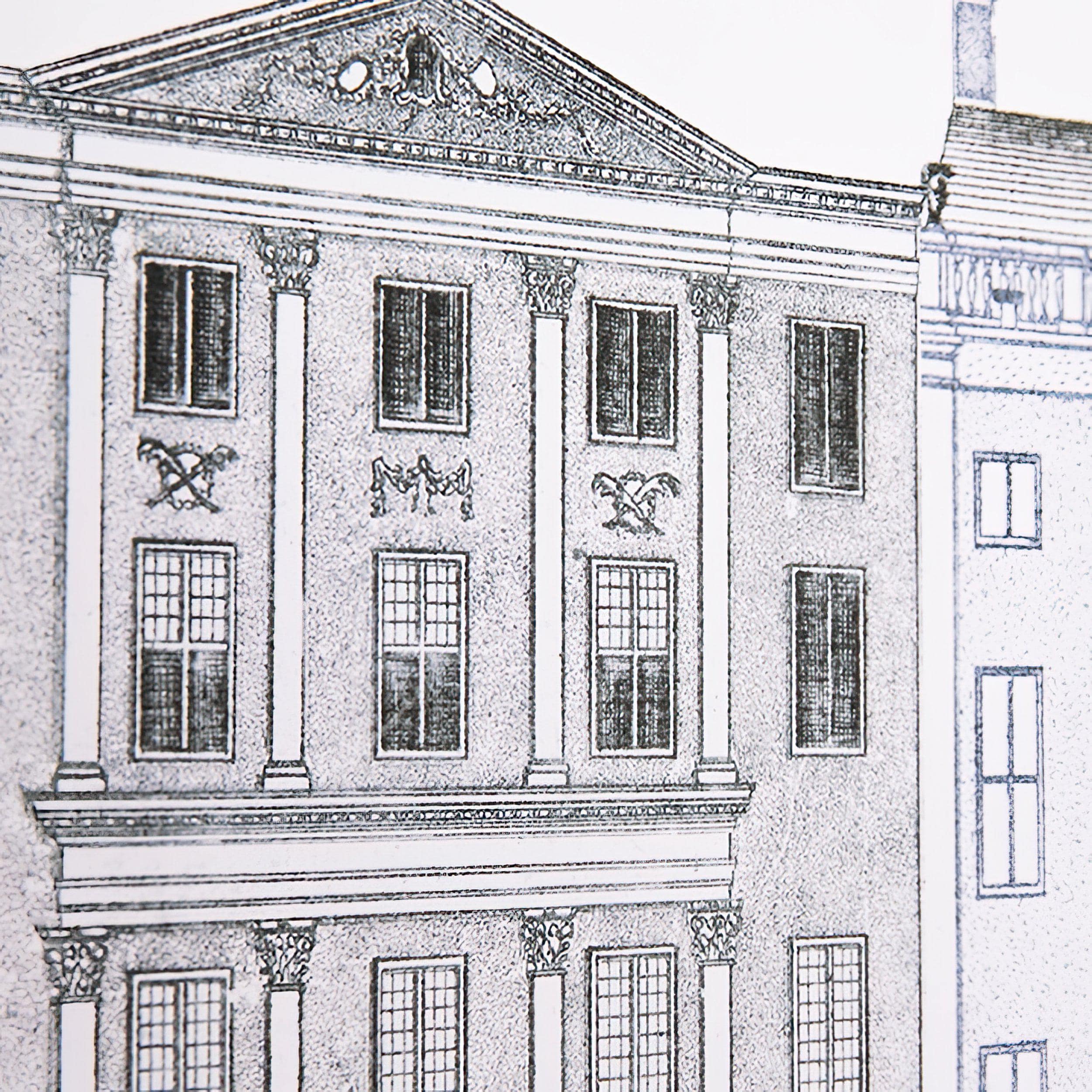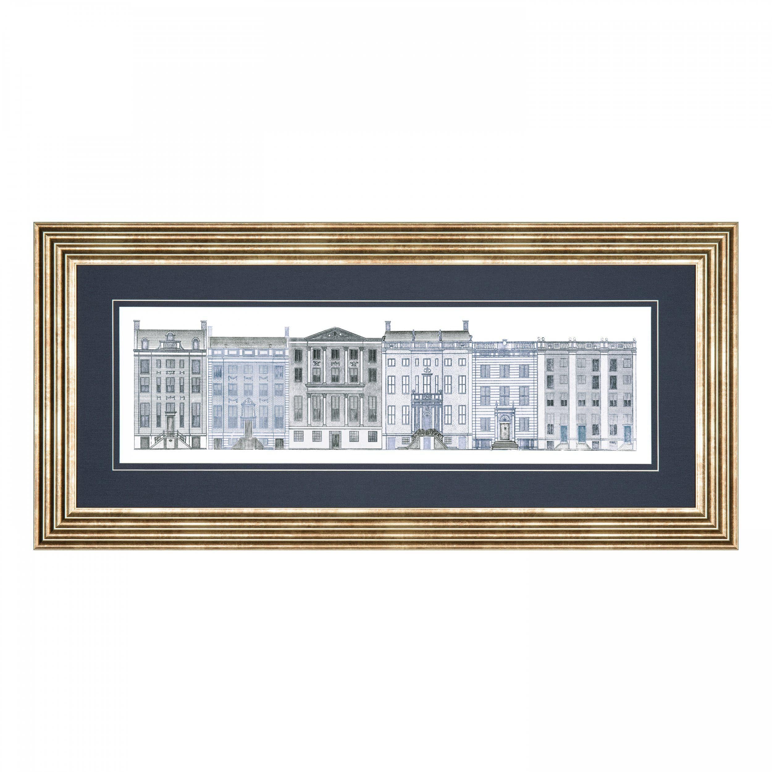 A print of Johan Teyler's 'Amsterdam Canal Houses'. This multitalented Dutch artist captures the stunning architecture of the townhouses built during Amsterdam's Golder Age when the city expanded faster than it could keep up. A simple blue colour palette reveals the impressive pencil drawing. A distinguished dark blue mount and a decorative gold frame complete the design.