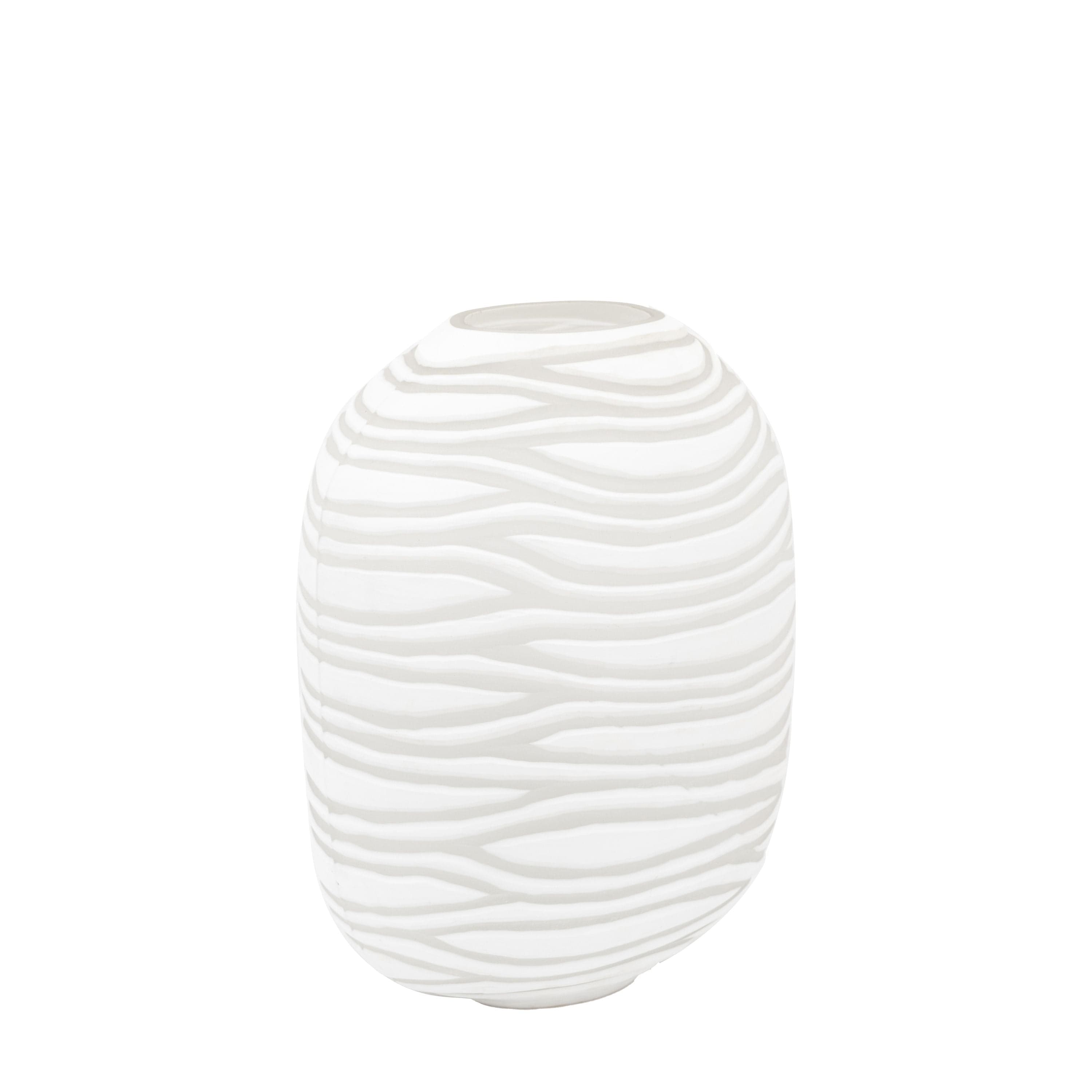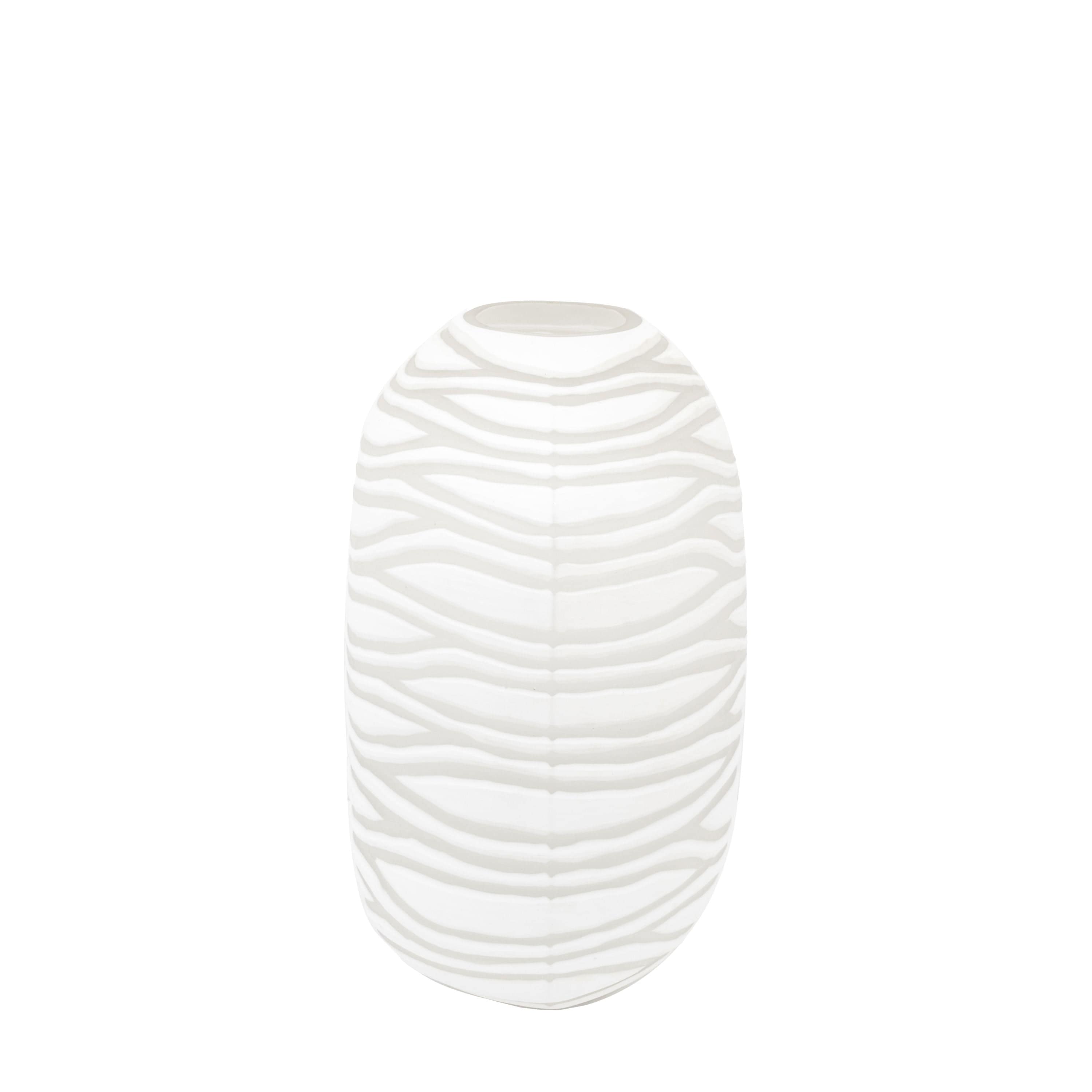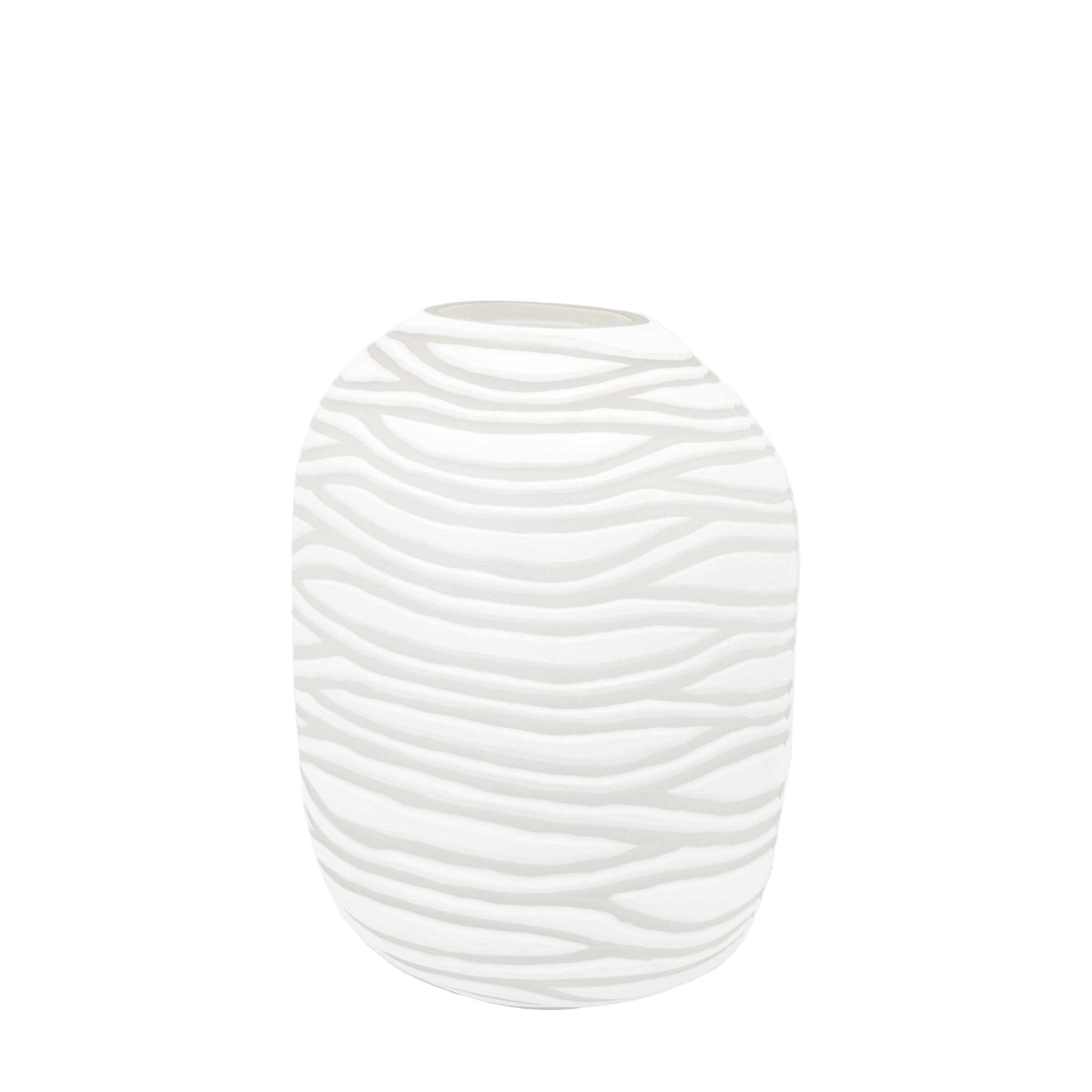 Anclo Handblown Carved Glass Vase White Large is a stunning addition to any home. This heavy white glass vase is hand blown with intricate detail, making it a unique and eye-catching piece. When placed against a window or other light source, the hand carved freeform stripes and organic shape come to life, adding a touch of elegance to any room.
