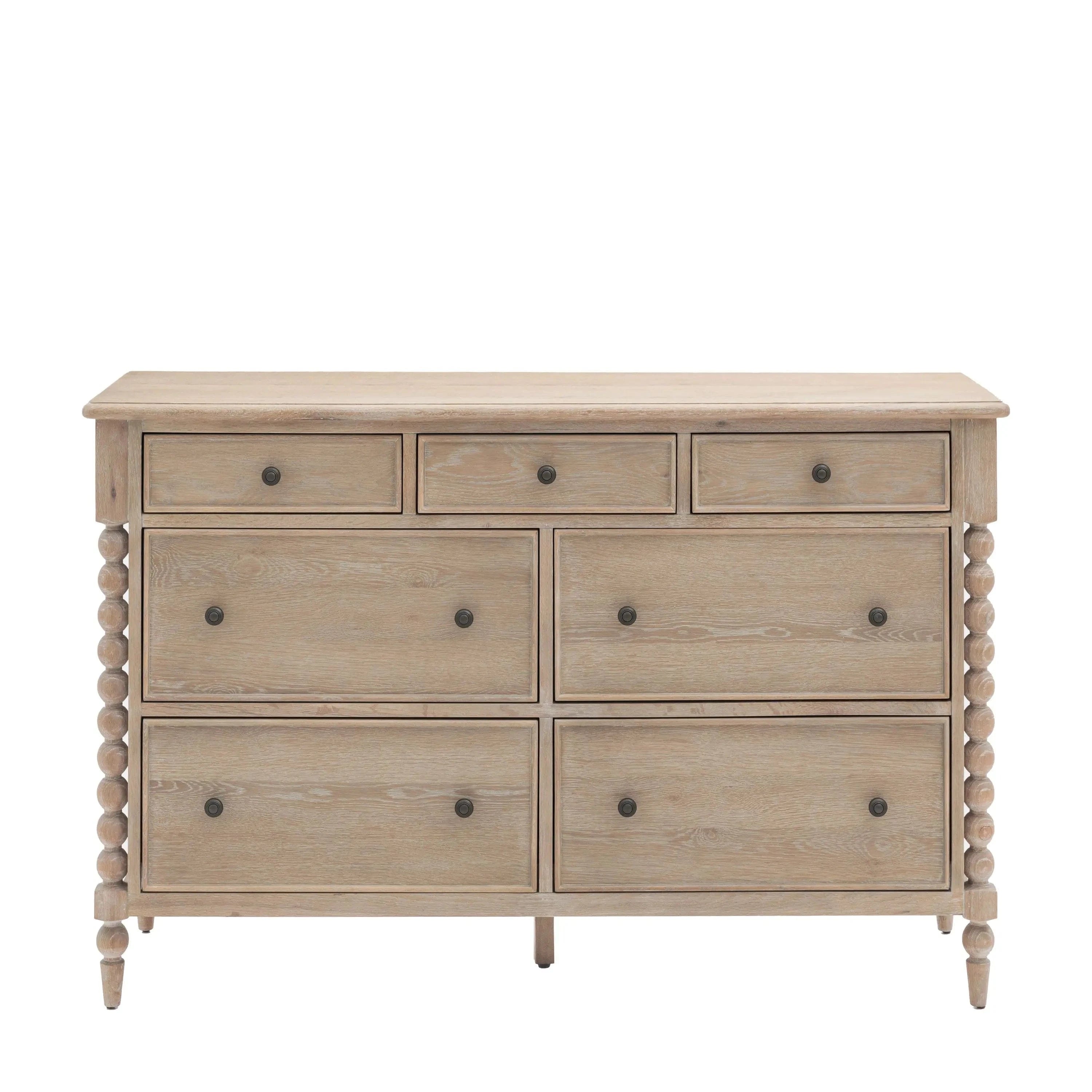 Introducing the Artisan 7 Drawer Chest, a stunning piece of furniture that combines practicality and style. With its seven spacious drawers, this chest offers ample storage space for all your belongings. The hand-turned bobbin accents and lime-wash oak finish add a touch of elegance to any interior.