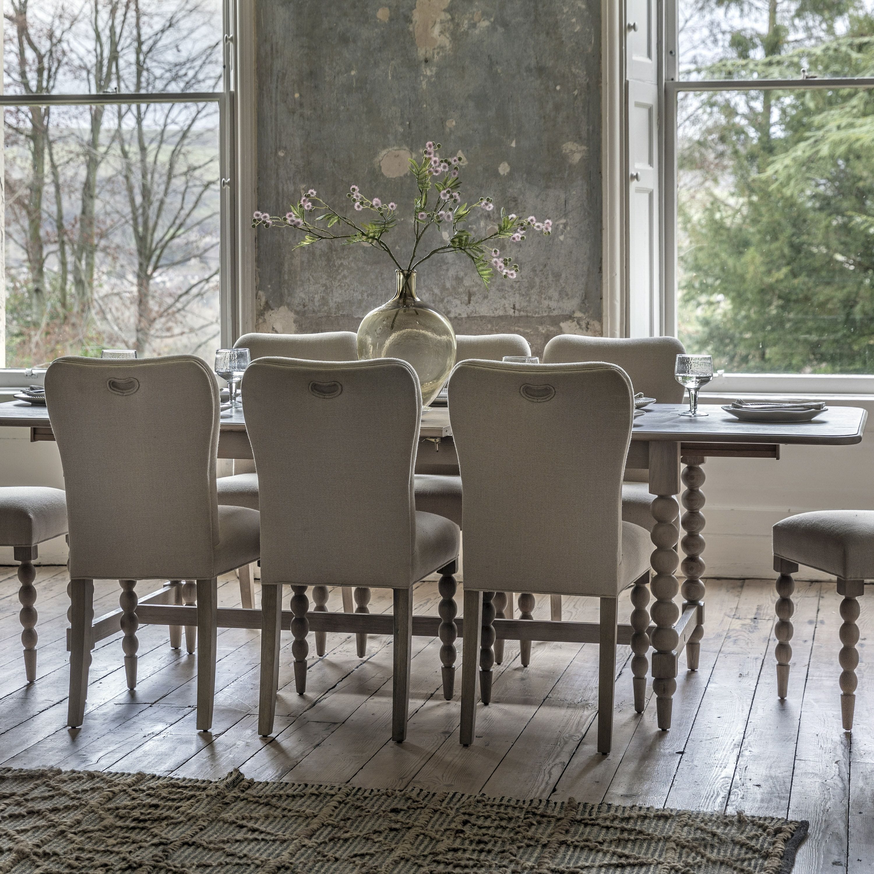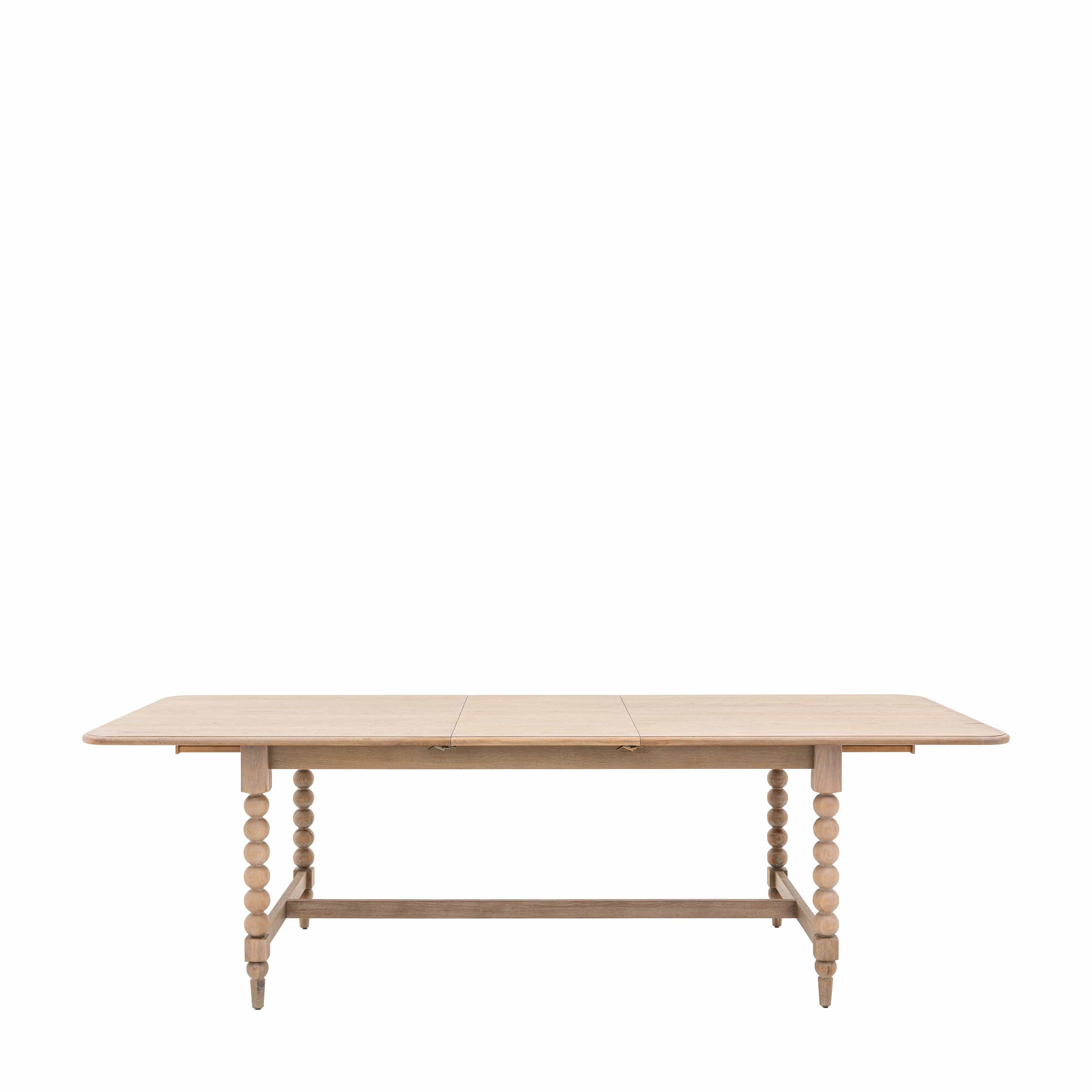 This stunning dining table will make a classy addition to any dining room, and with its extending top it is both beautiful and practical. The legs feature hand-crafted bobbing detail which is created by turning the wood on a lathe, a task carried out by the finest craftsmen. The table is made using beautiful oak solids and veneers where practical, with a very subtle lime wash tone to the finish which is soft and mellow. Matching pieces are available.
