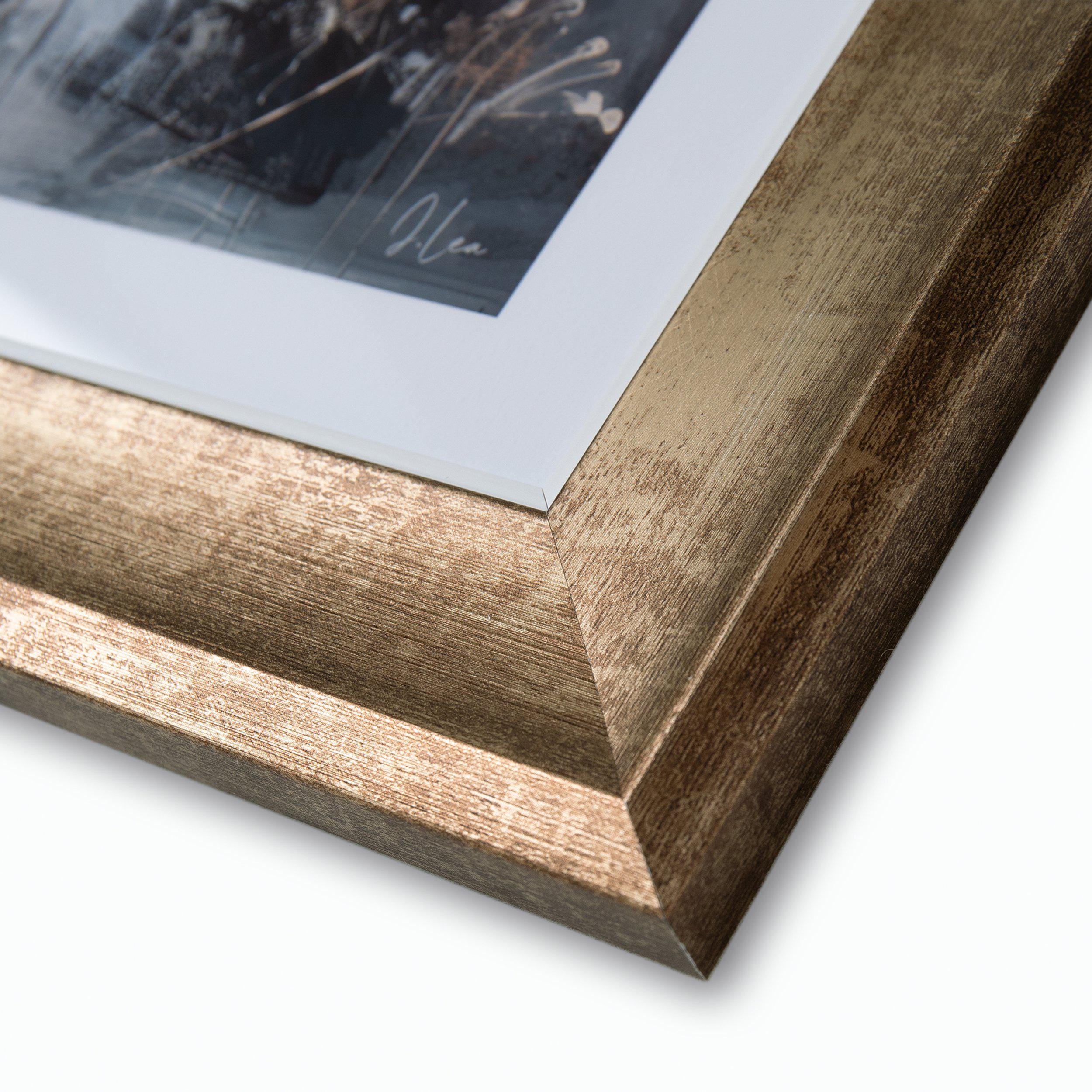 Embracing muted pastel shades, Joanne Lea captures a beautiful English countryside that gracefully moves into the cooler months. The rolling fields feature soft brushstrokes that create a serene atmosphere, evoking the beauty found within nature's embrace. A dark shade of charcoal amongst a rich terracotta gives the minimalist composition an impactful finish. A mottle-bronzed frame with a white lip presents the glazed artwork.