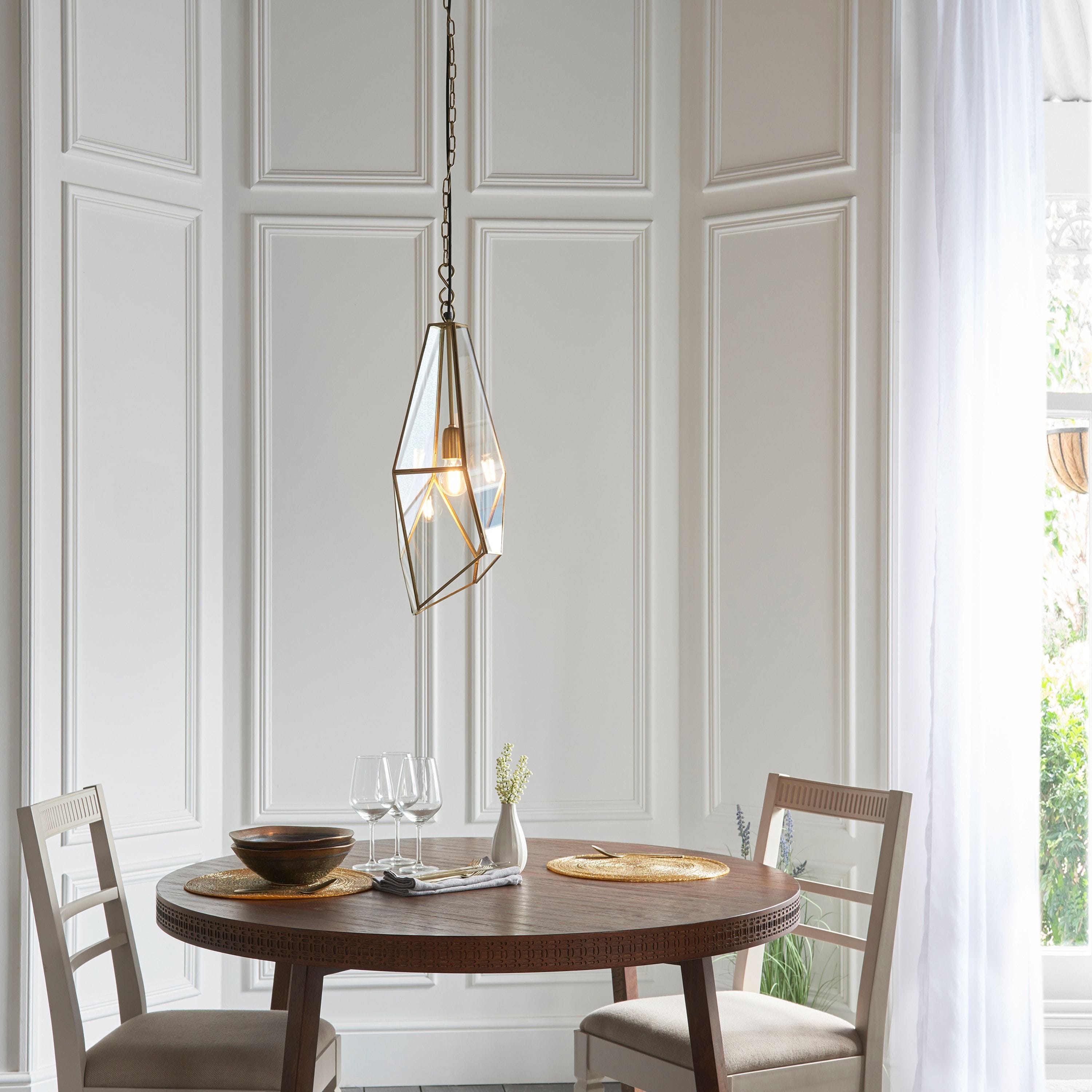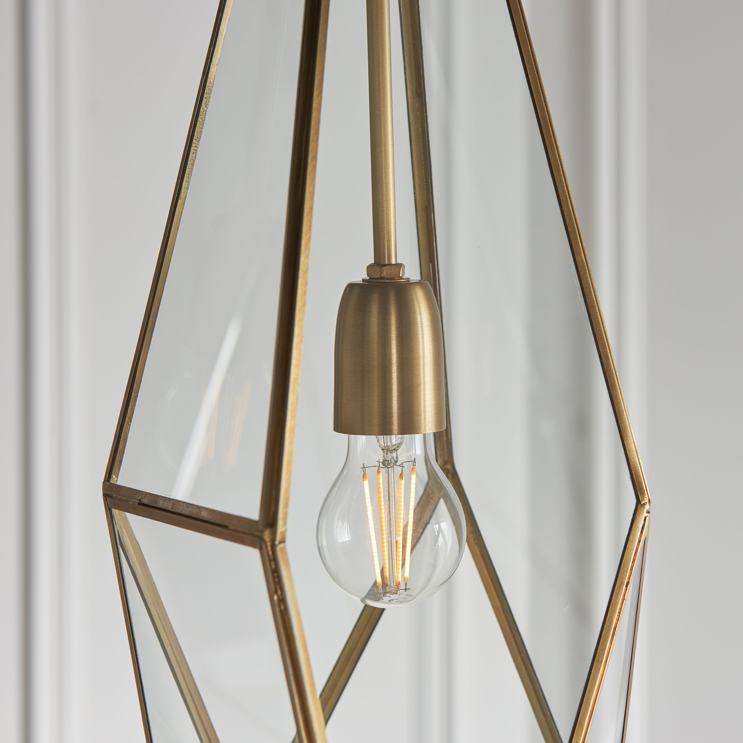 The Avington Pendant Light is a stunning addition to any home. Made from glass panels with an antique brass effect trim, this angular cage pendant adds a touch of elegance to any room. Not only is it visually appealing, but it is also practical, as it is compatible with LED lamps and dimmable. Measuring at 230mm in width, depth, and 900mm in height, this pendant light is the perfect size for any space. The brass color adds a touch of warmth and sophistication, while the materials of glass and steel ensure durability. Designed for indoor use, this pendant light does not come with a bulb, but it is compatible with a 40W E27 GLS bulb. With a lumens output of 400 and a lumens per watt ratio of 10, this light provides ample brightness. The cable length of 1000mm allows for flexibility in installation. One of the standout features of this product is its fast delivery. At House of Isabella, we pride ourselves on providing luxurious furniture and interiors with free UK delivery. This pendant light is no exception, and with its dimmable function, voltage of 220-240V, and Class 2 rating, it is a high-quality and convenient choice for any home.
