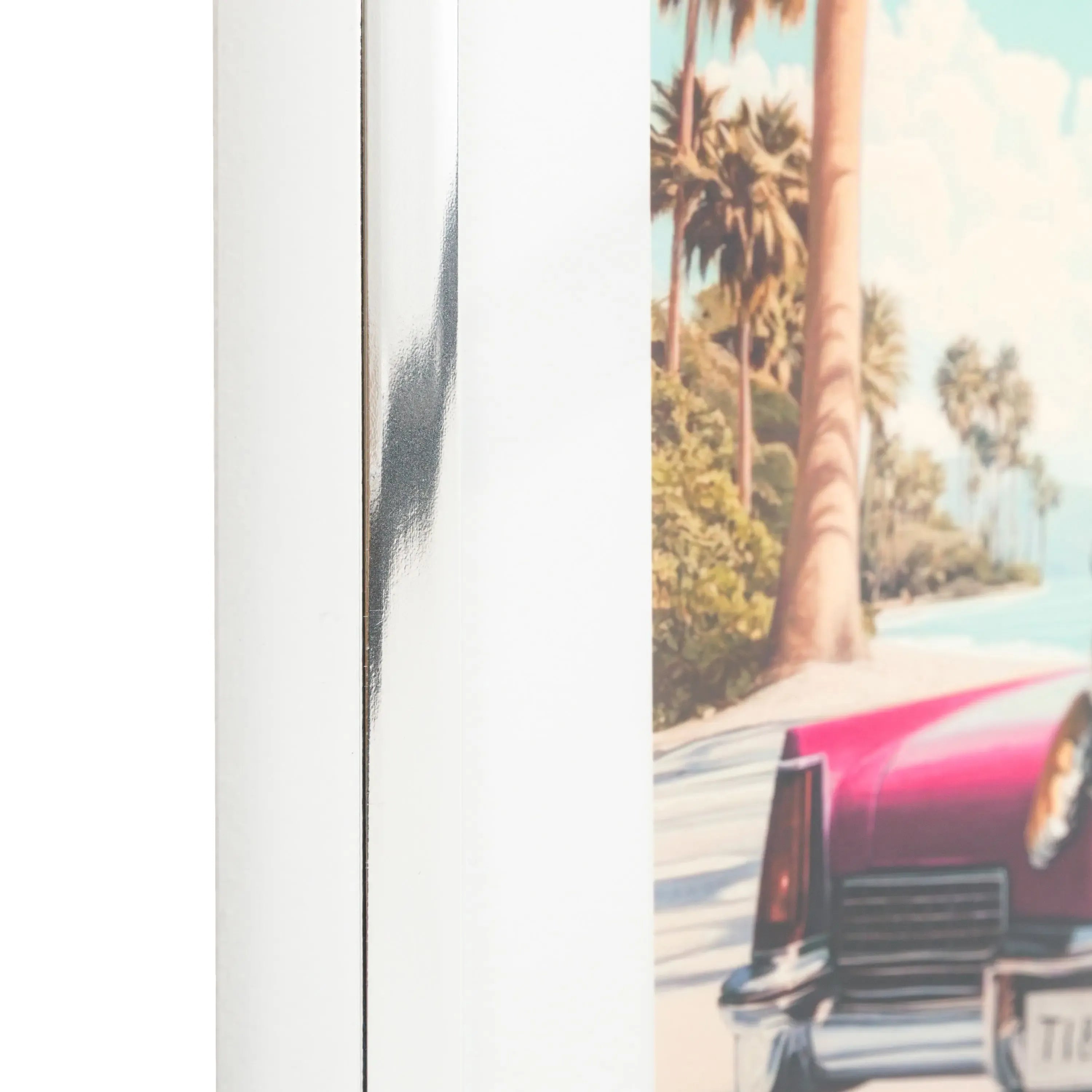 Bring the Miami vibes to any room with this bright, bold and quirky piece of pop art. Merging the vibrant colours of the Miami aesthetic with a hint of 80s style, a majestic tiger lounges on the back of a bright pink vintage Cadillac, observed by a curious giraffe and surrounded by a backdrop of tropical palm trees. Framed in a silver chrome frame.