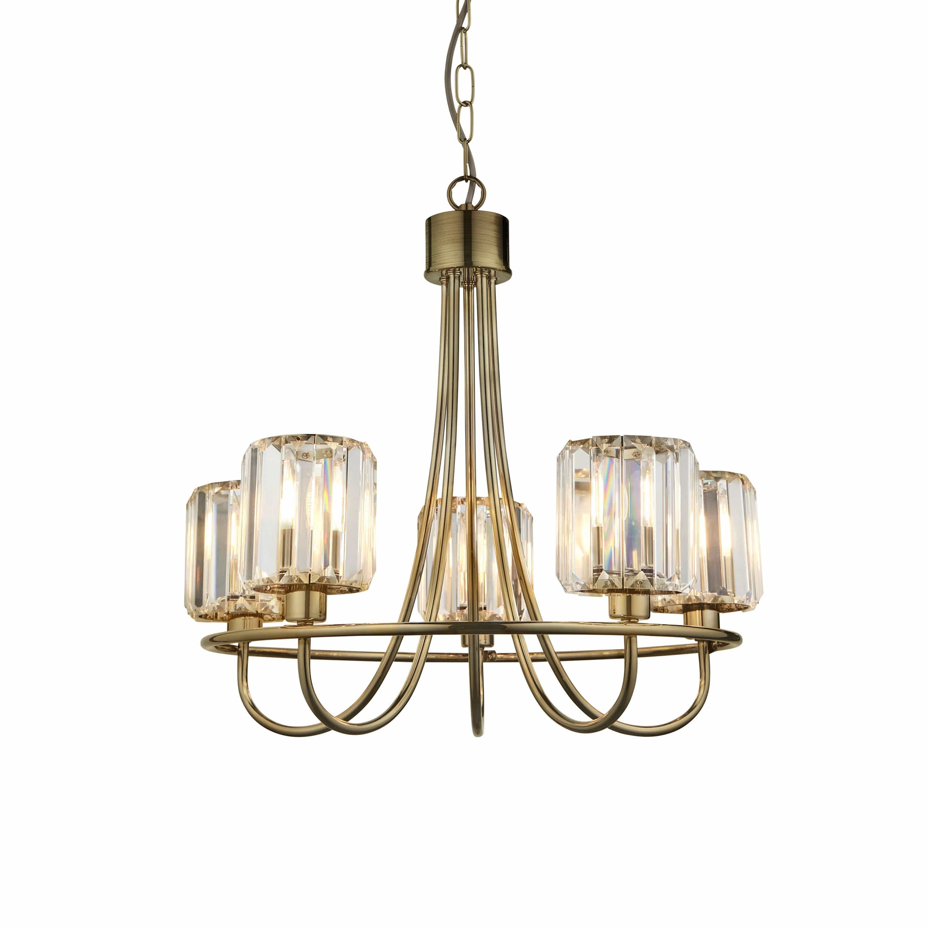 Introducing the Berenice 5 Pendant Light Antique Brass, a sophisticated and elegant addition to any living space. This pendant light features five decorative clear cut faceted glass shades that beautifully disperse the light, creating a warm and inviting atmosphere. The bright nickel plate finish adds a touch of luxury to the design, making it a perfect statement piece for your home.