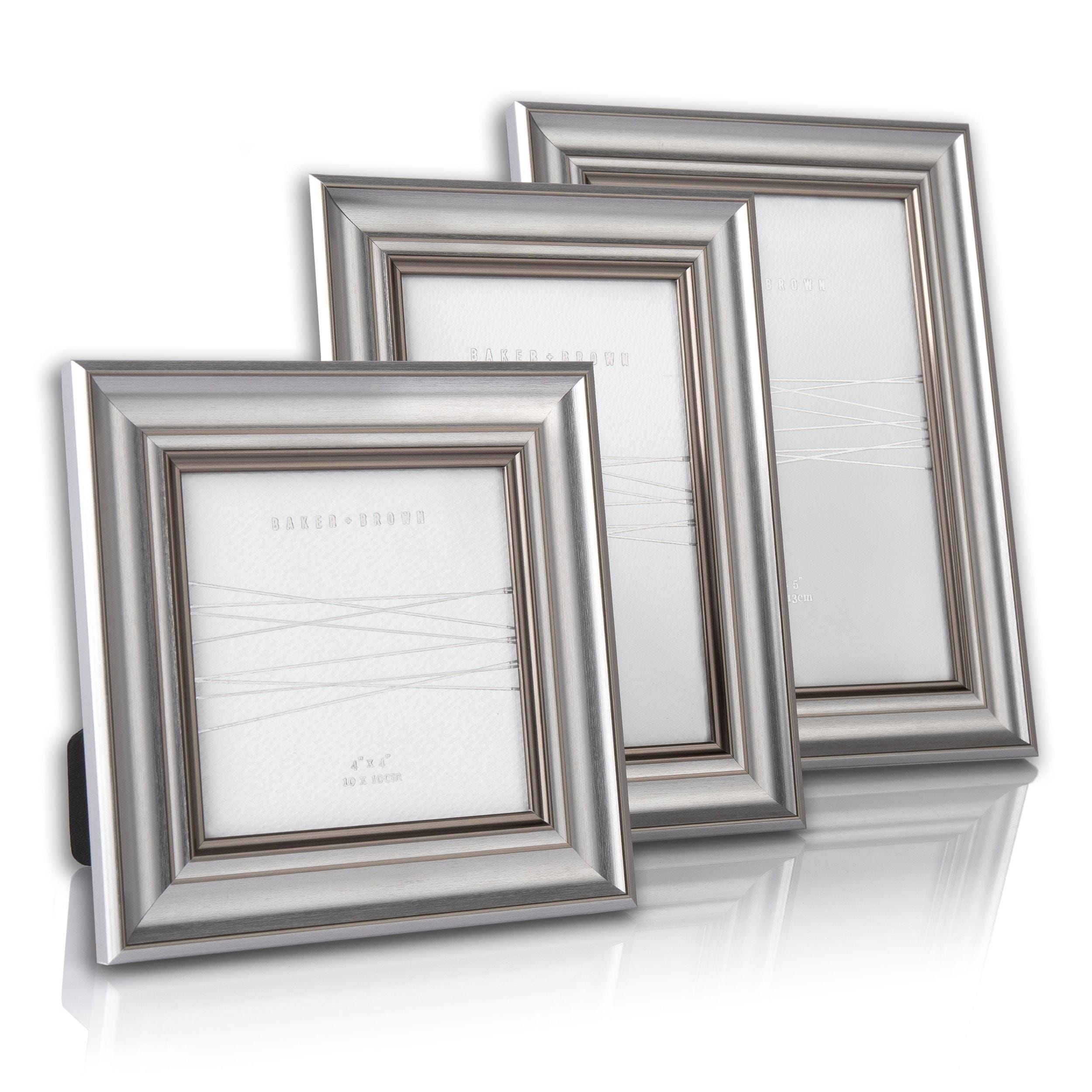 A simple silver metallic frame with a chrome highlight pivoting across the profile edges. The metallic feature rolls into the inner lip, creating a striking design. A grey velvet window opening back completes the overall aesthetic. The versatile style is available in two additional sizes: 6" x 4" and 7" x 5".