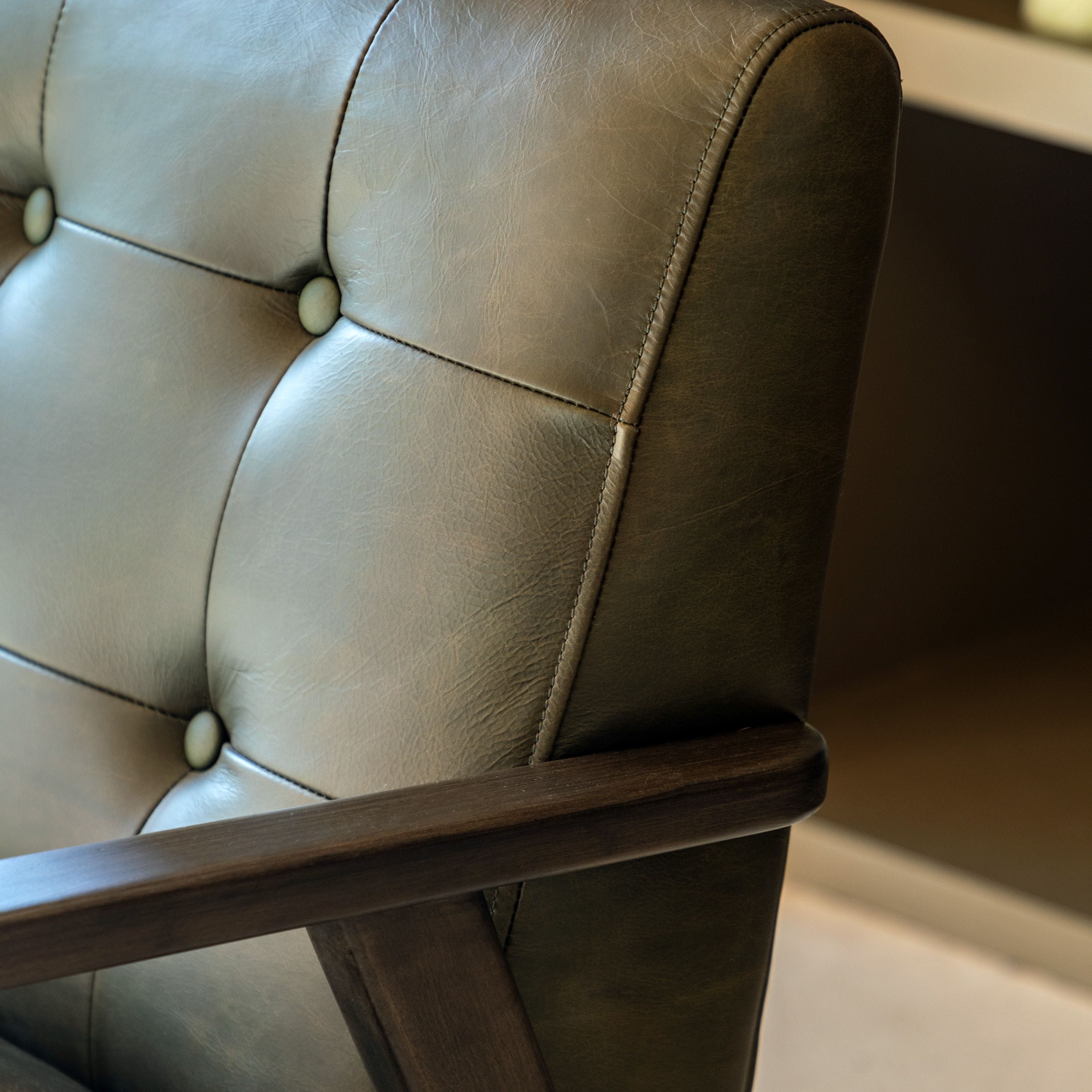 Introducing the BlackHallel Armchair Heritage Green Leather, a stunning piece of furniture that combines sophisticated elegance with Scandinavian design. This armchair is upholstered in rich heritage green leather, adding a touch of warmth and sophistication to any room. The sleek, minimalist scandi-inspired frame highlights clean lines and a modern silhouette, while the buttoned back adds a classic touch of refinement and traditional craftsmanship.