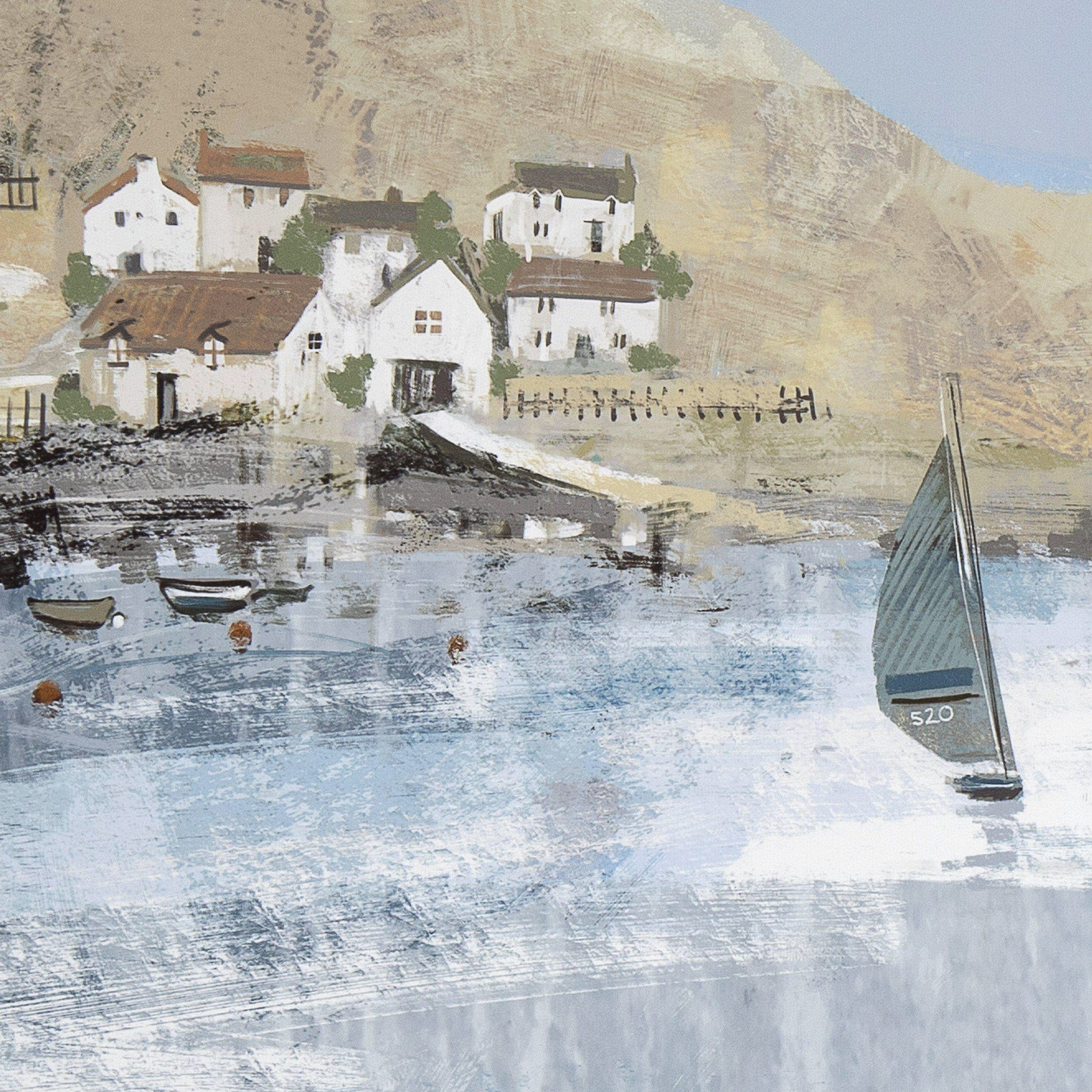 A quaint British cove brims with activity. Sabrina Roscino captures an early morning start on a summer's day. A flotilla of small sailboats begins their adventure. The homes that surround the coastal inlet wake to a stunning blue sky. A simple colour palette brings to life a simple way of living. The charming canvas print wraps itself in a modern white wood effect frame.