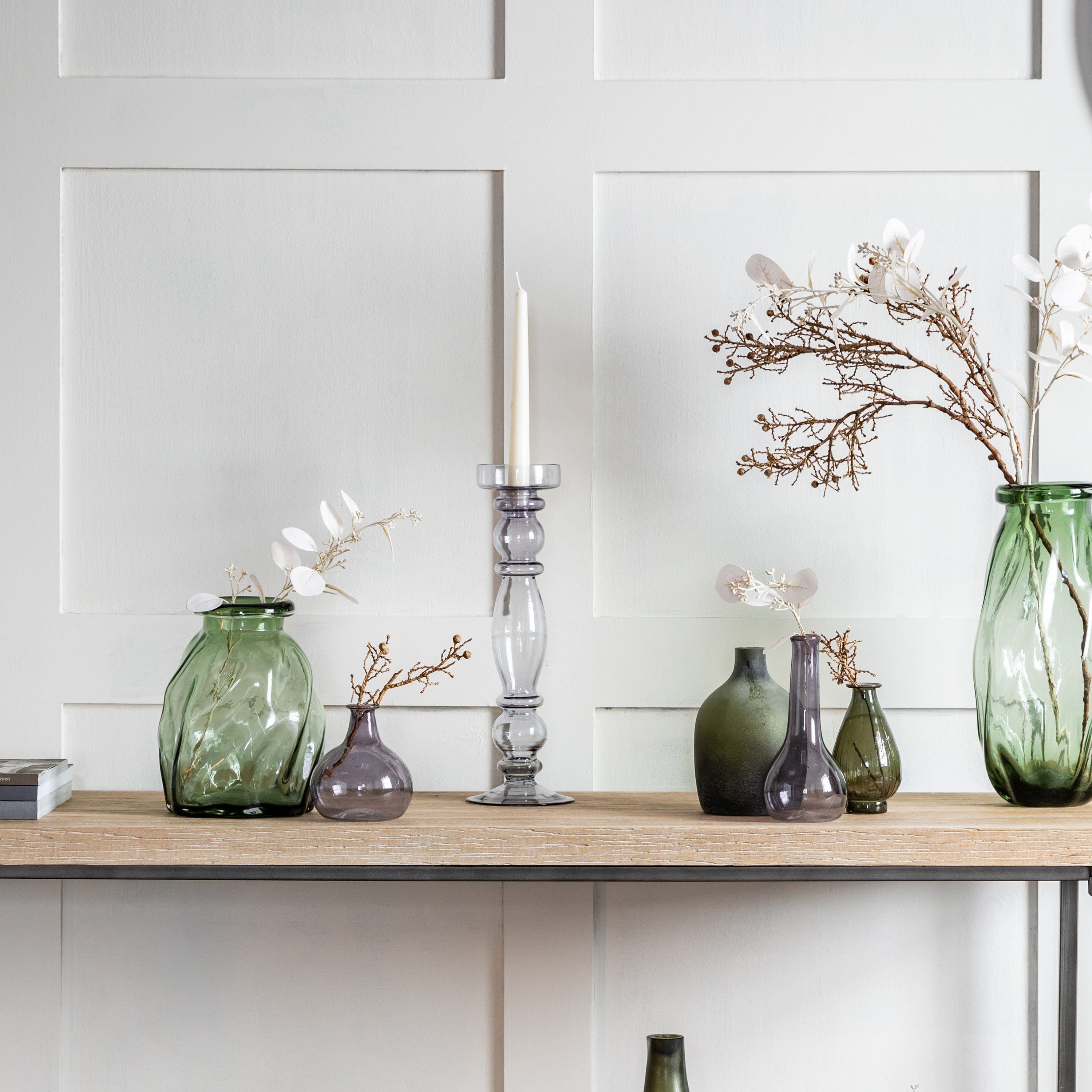 A contemporary twist on a classic, this candlestick combines modern grey glass and traditional shapes. 3 coordinating candlesticks are available enabling you to create a stunning grouping. Suitable for pillar and dinner candles. Candle not included.
