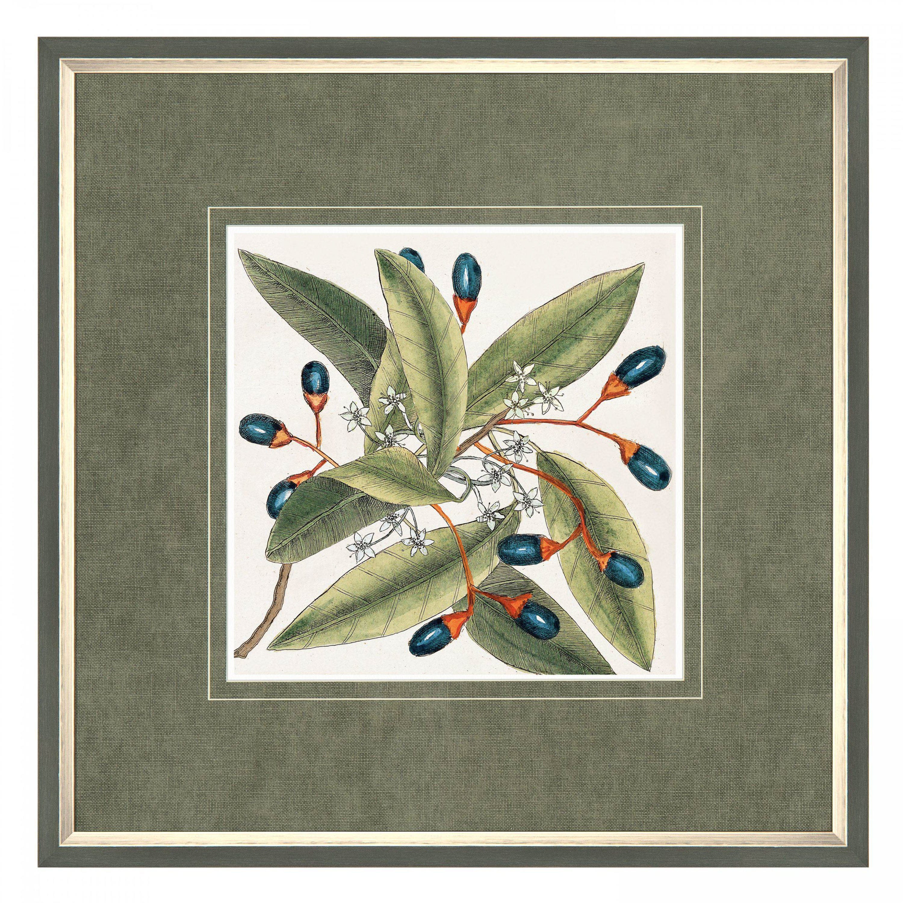 Mark Catesby was one of the most influential naturalists of the early 18th century. The Englishman studied the flora and fauna of the New World. Catesby spent many years away collecting specimens and seeds but found that, on returning home, his illustrations were met with great praise. To enhance the exceptional watercolour print, a decorative olive green mount sits behind a glaze. A slimline green frame with a gold inner bezel completes the presentation.