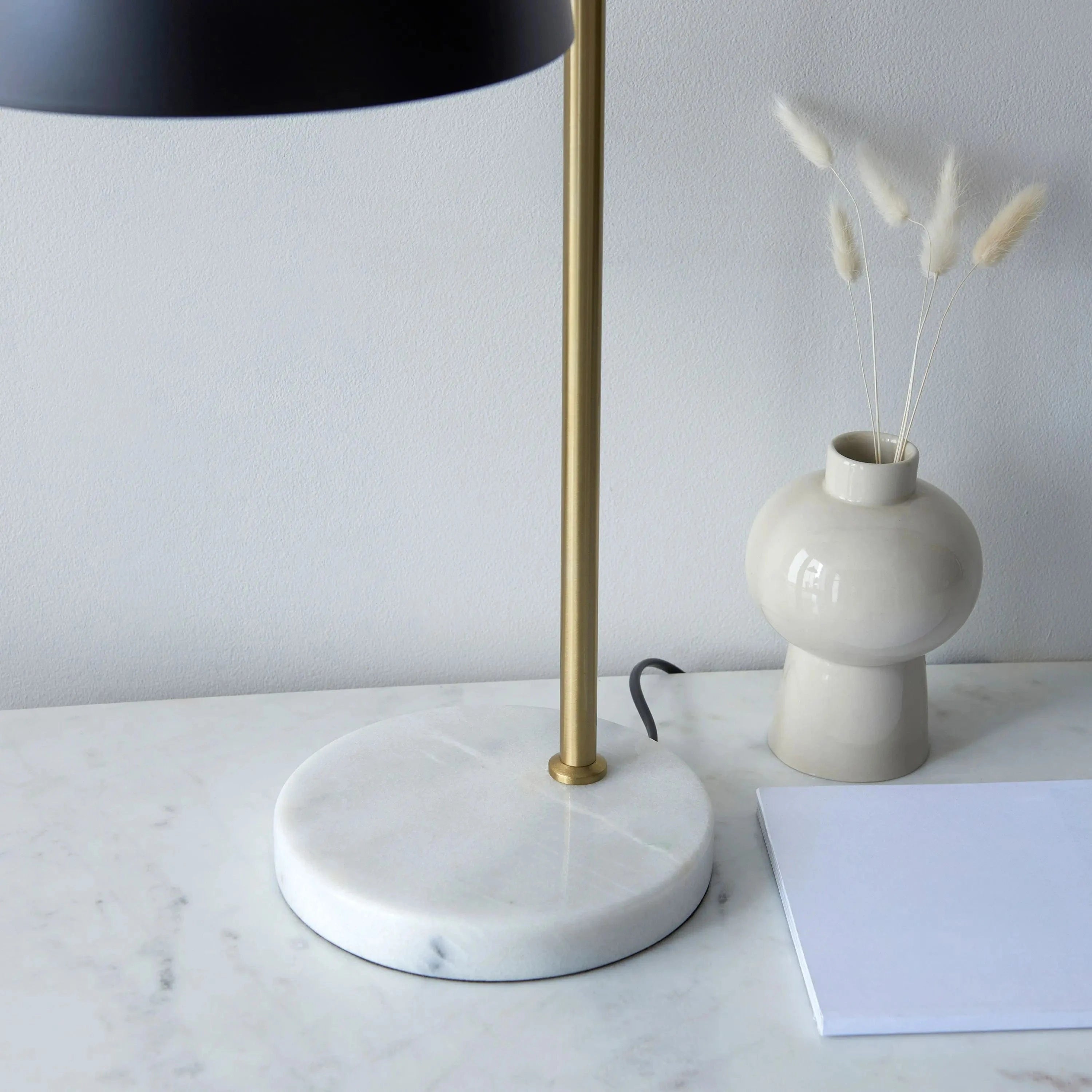 Introducing the Buchanan Table Lamp Matt Black, a stunning addition to any home. This lamp draws inspiration from mid-century design, featuring clean lines and a mix of finishes. The white and grey marble base adds a touch of elegance, while the antique brass stem and matt black shade create a modern look. And the best part? This lamp is available for fast delivery.