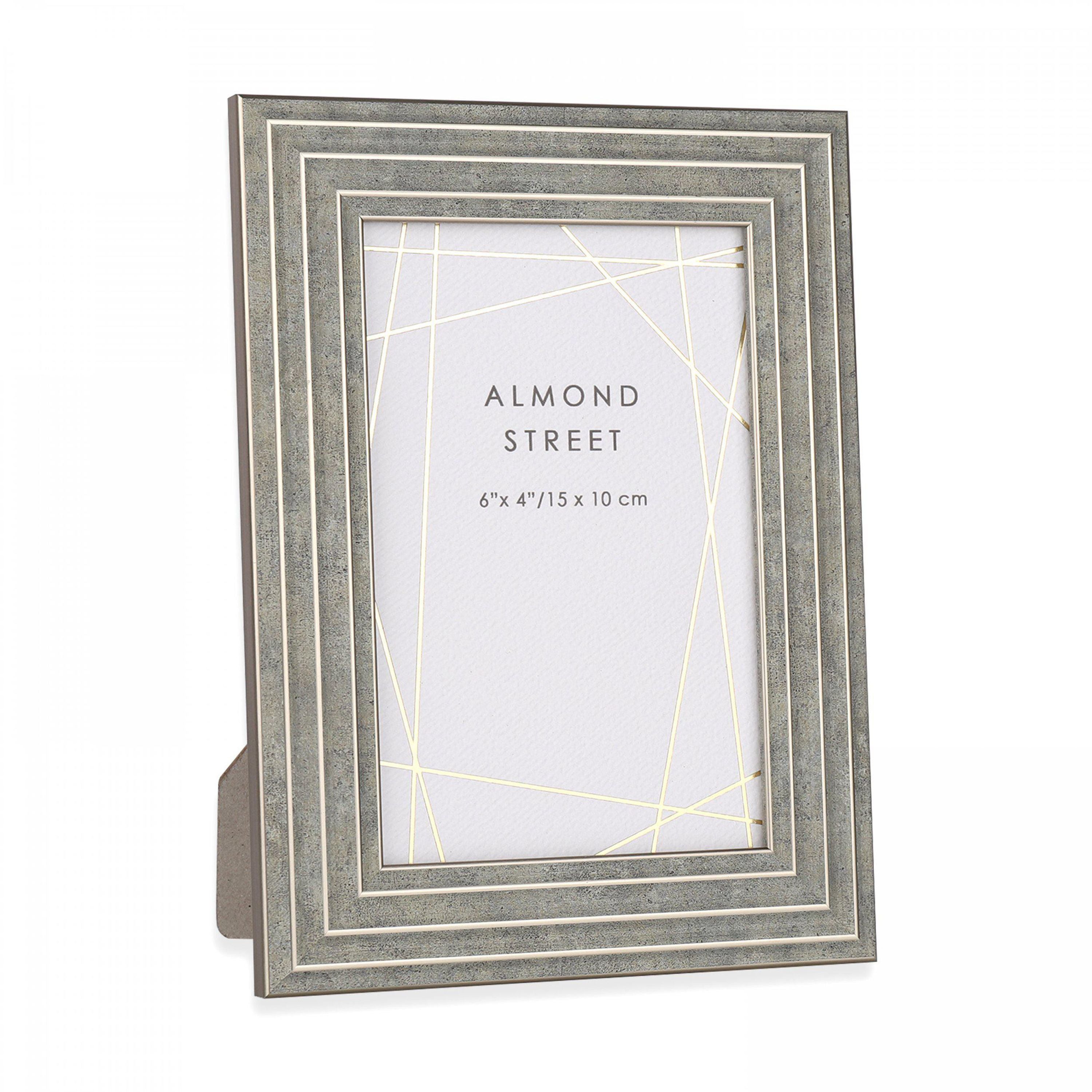 A textured stone frame provides a striking backdrop. Metallic highlights draw attention to the profile edges around the photo frame, creating a modern design. The photo frame has a grey velvet window opening at the back to complete the overall aesthetic. The versatile style is available in two additional sizes 4" x 4" and 6" x 4".