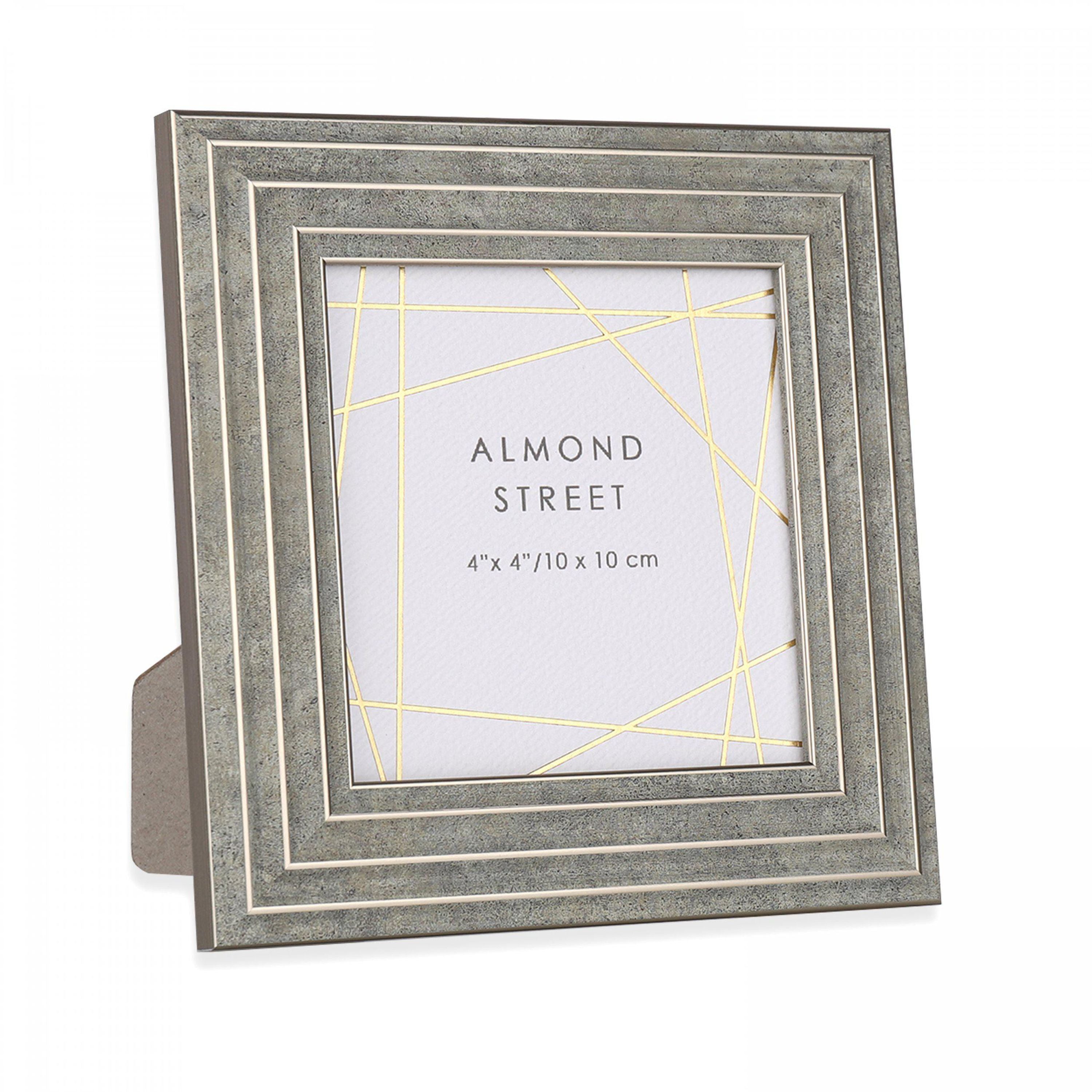 A textured stone frame provides a striking backdrop. Metallic highlights draw attention to the profile edges around the photo frame, creating a modern design. The photo frame has a grey velvet window opening at the back to complete the overall aesthetic. The versatile style is available in two additional sizes 4" x 4" and 6" x 4".