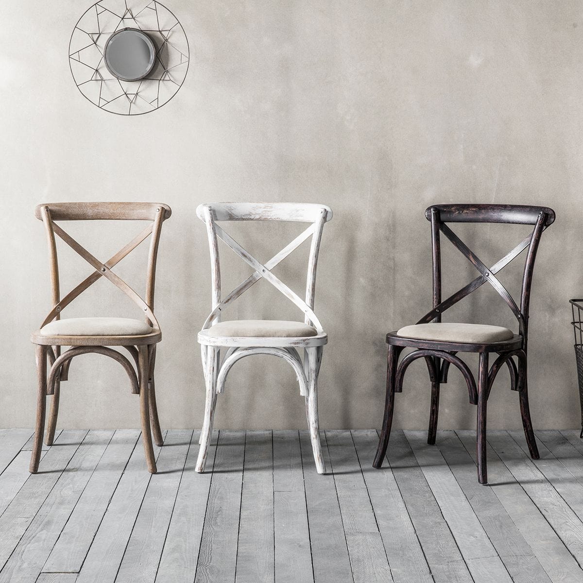 Introducing the Berwick Chair White (2pk) from House of Isabella - the perfect addition to your home for creating a relaxed French cafe feel. This pack of 2 understated cross back chairs features a distressed black finish and comfortable canvas seat pads.