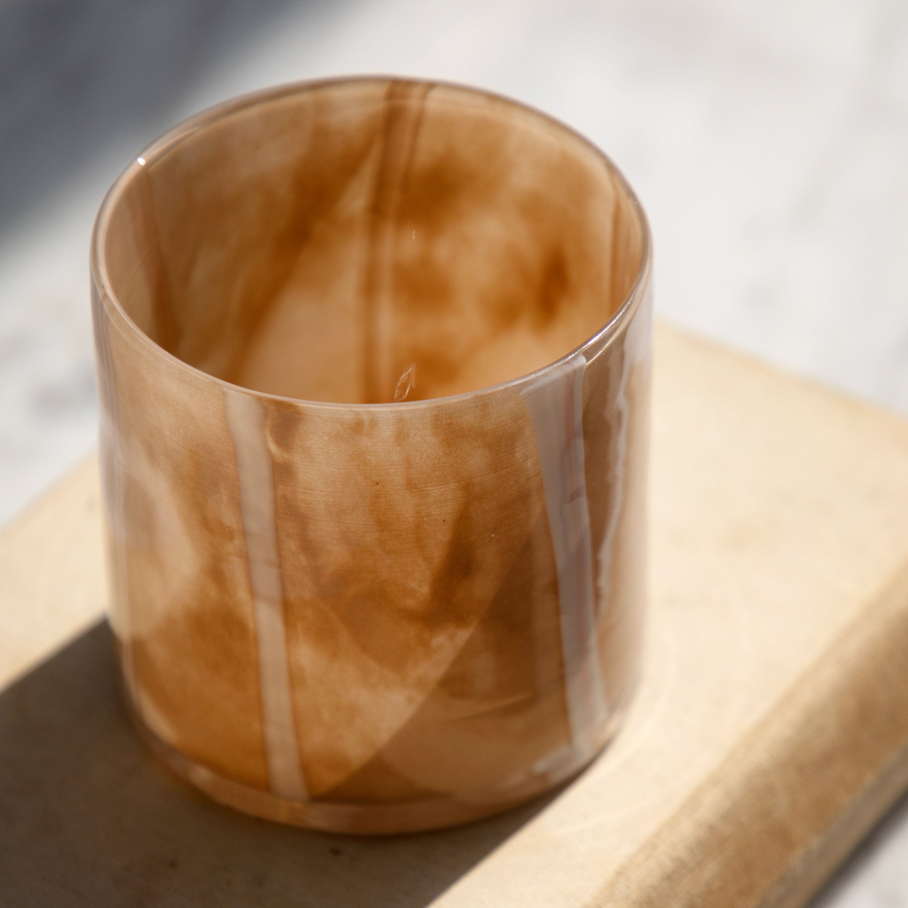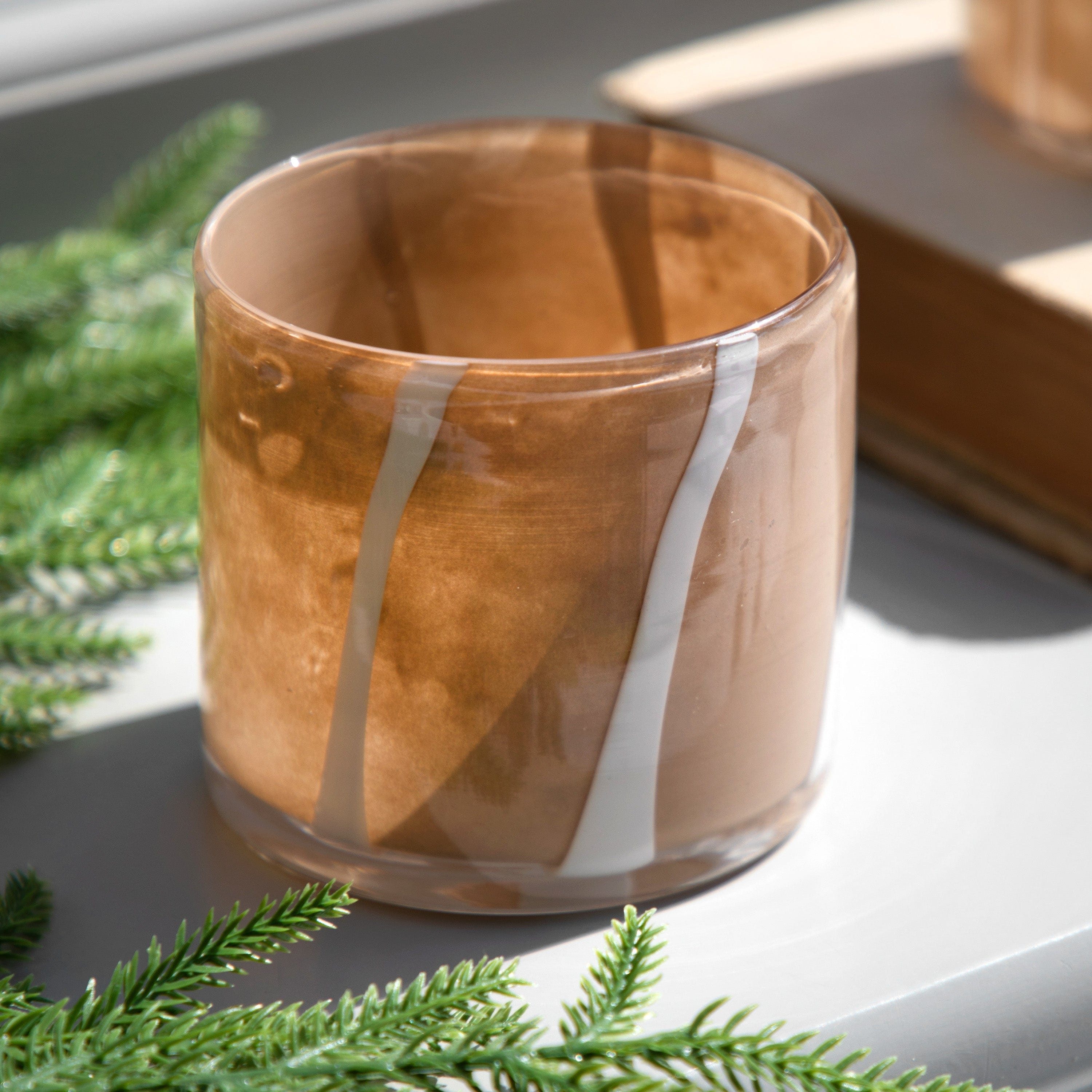 Handblown with unique stripe detail, this set of 2 beige tealight holders will create a warm glow when lit. Candles not included.