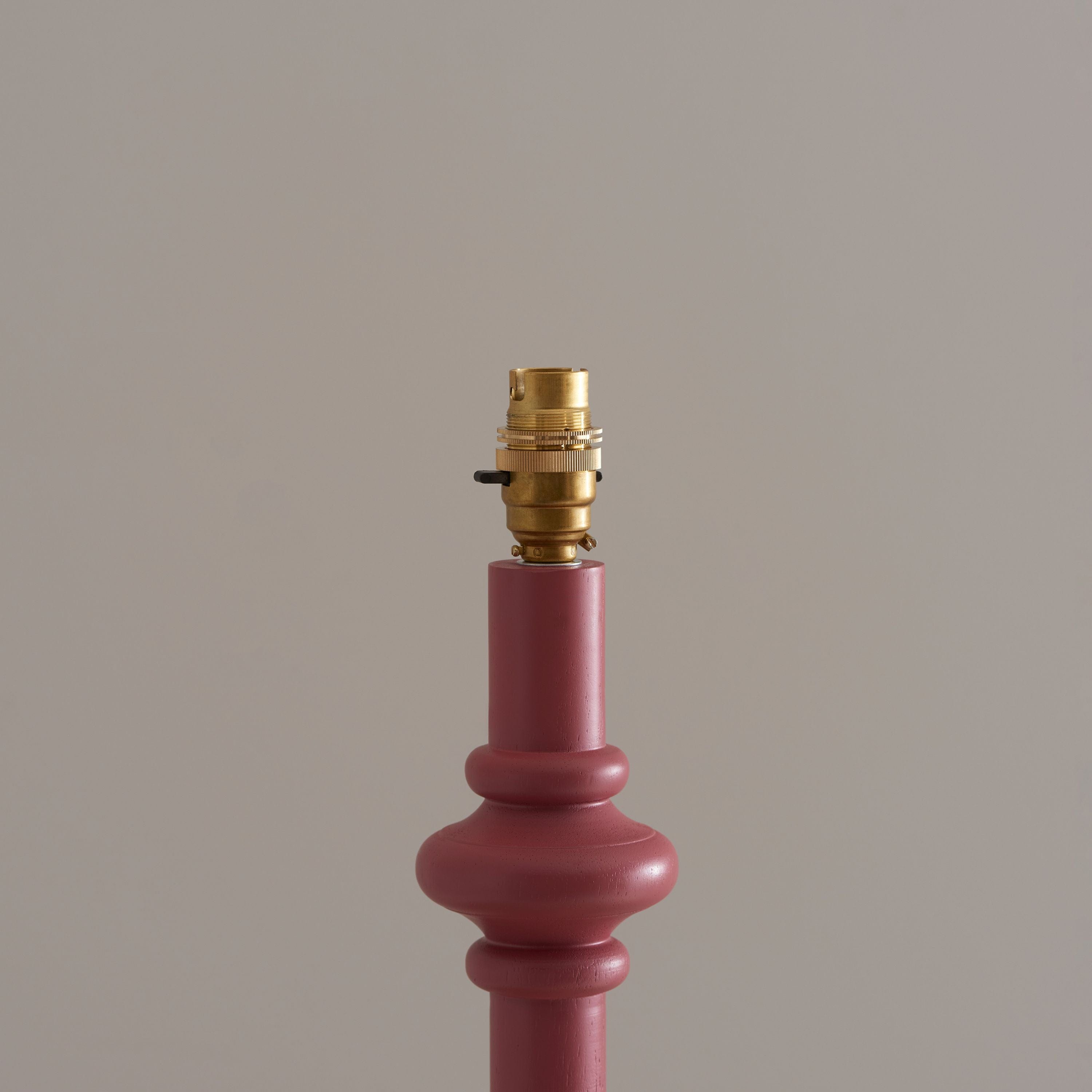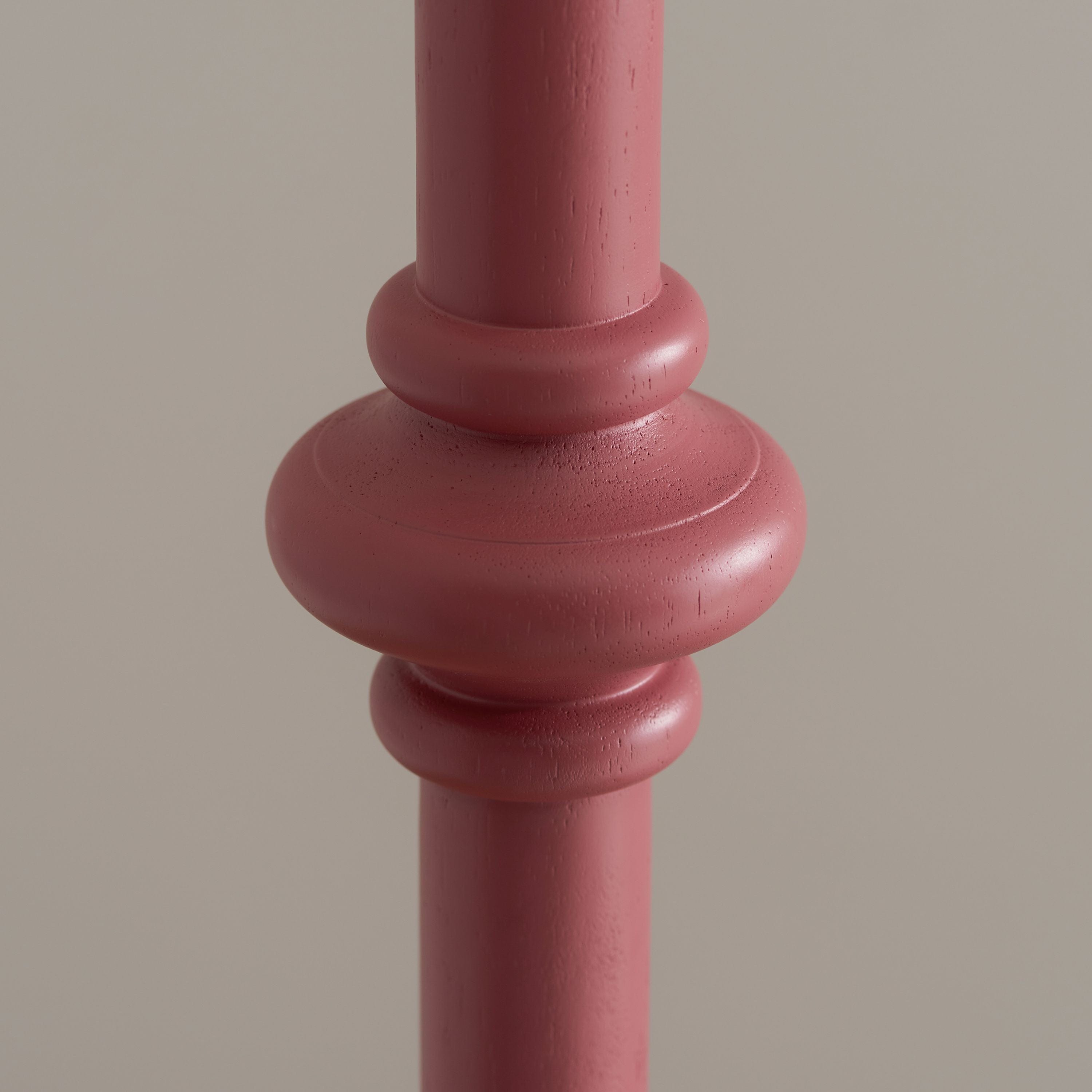 This unique wooden turned spindle floor lamp is inspired by past design styles with a fresh update. Painted in classic satin pink clay with a brass B22 switched lamp holder and grey braided fabric flex. Each product is turned on a wood lathe by hand and will be unique, any variants in finish are part of the individual charm of the product. Pair with one of our 35cm or 40cm decorative fabric shades for a unique classic style.