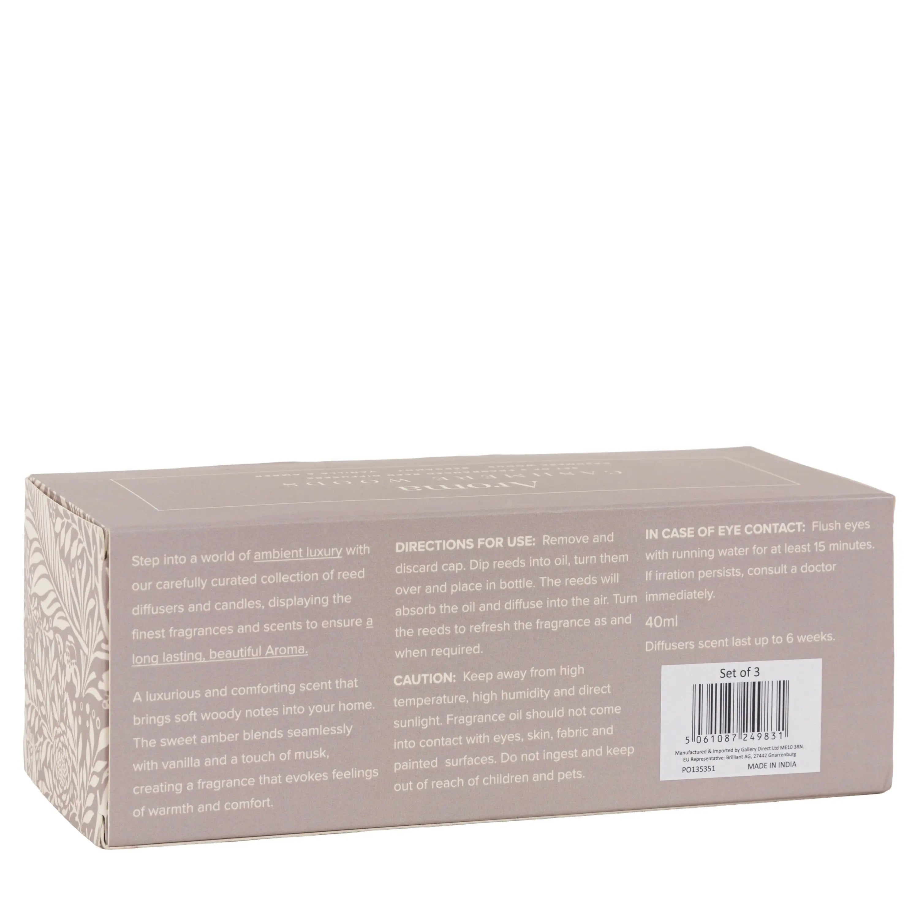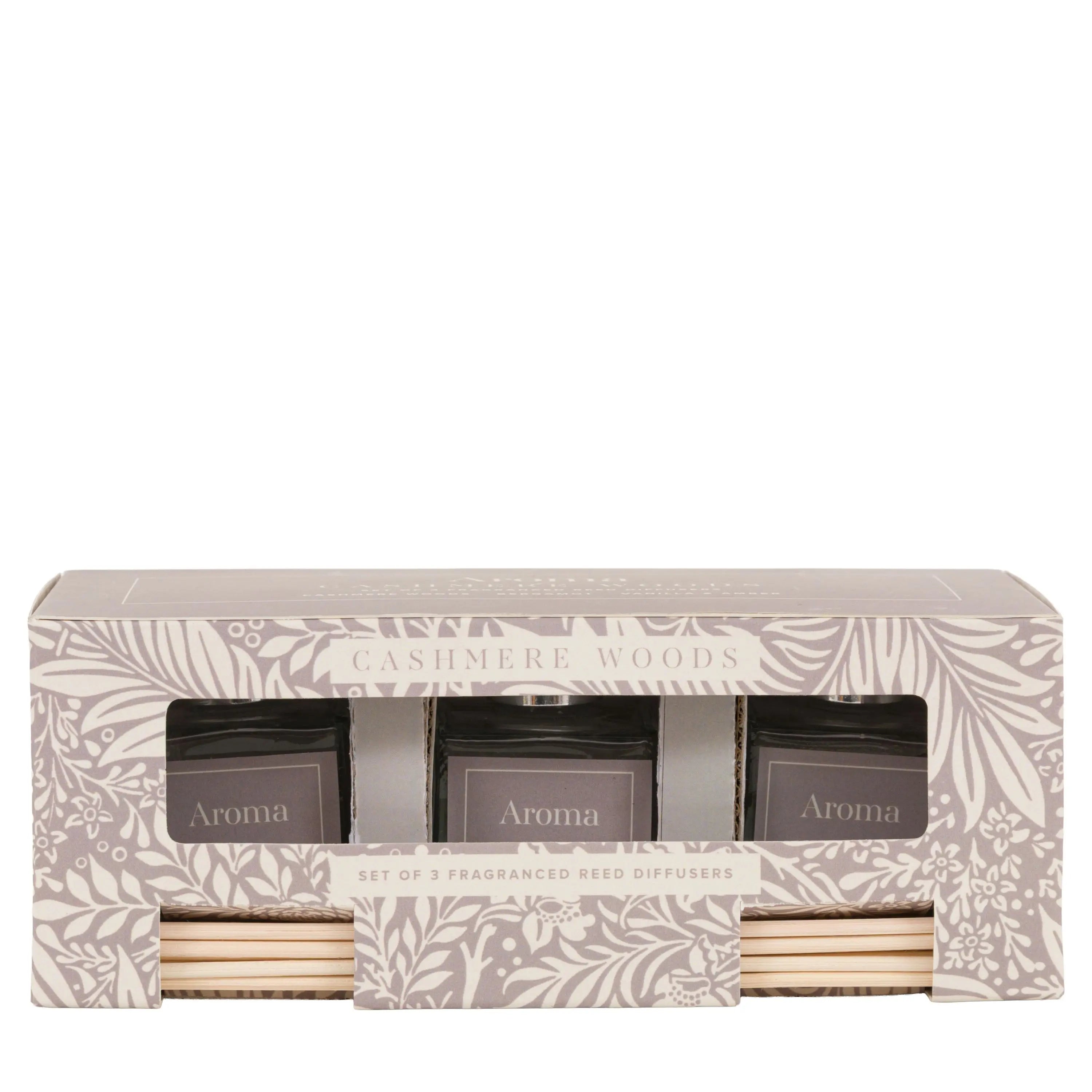 Subtly fill your home with the sweet aroma of cashmere woods. With this set of 3 reed diffusers, lasting floral, sweet and slightly woody scents will drift throughout any room they are placed in.