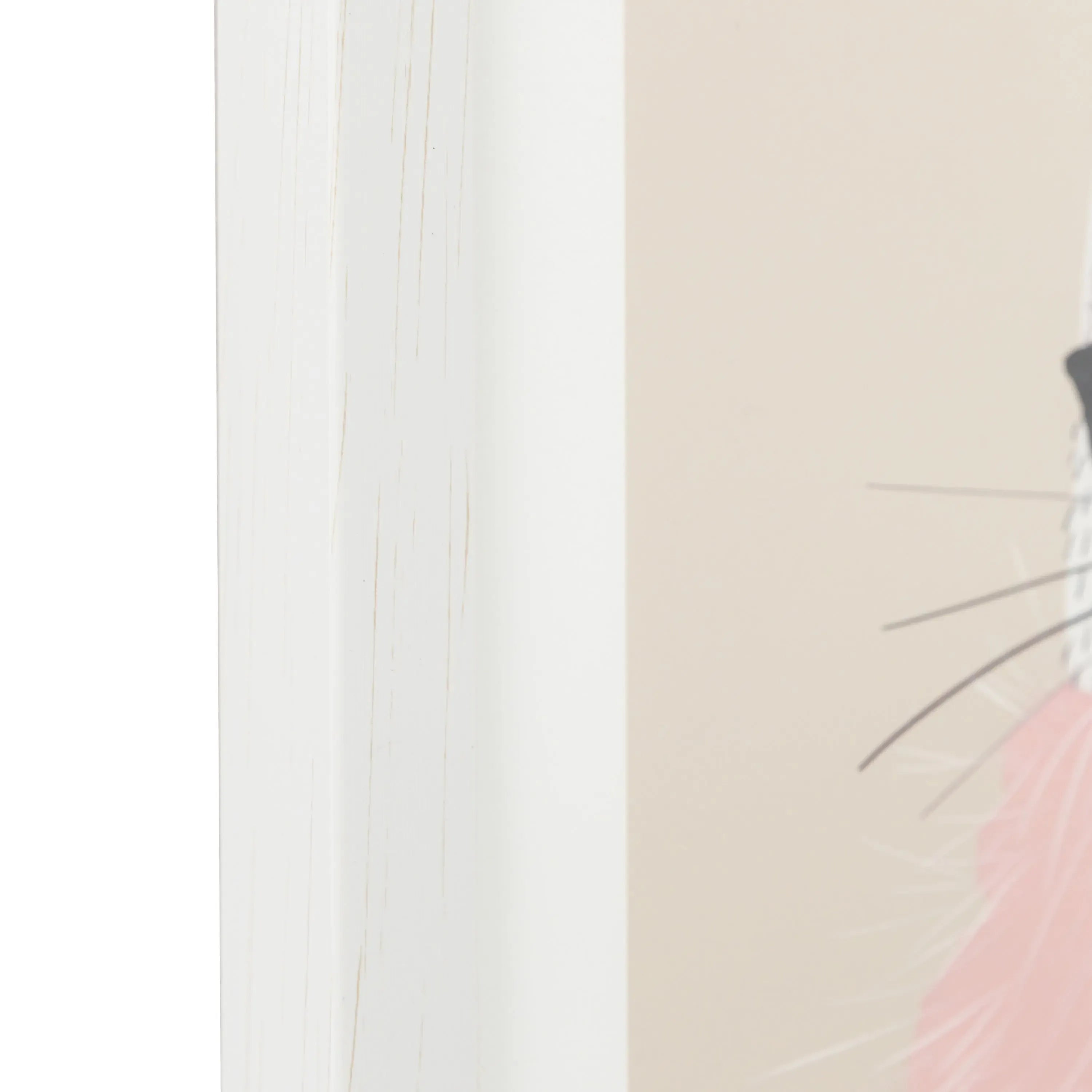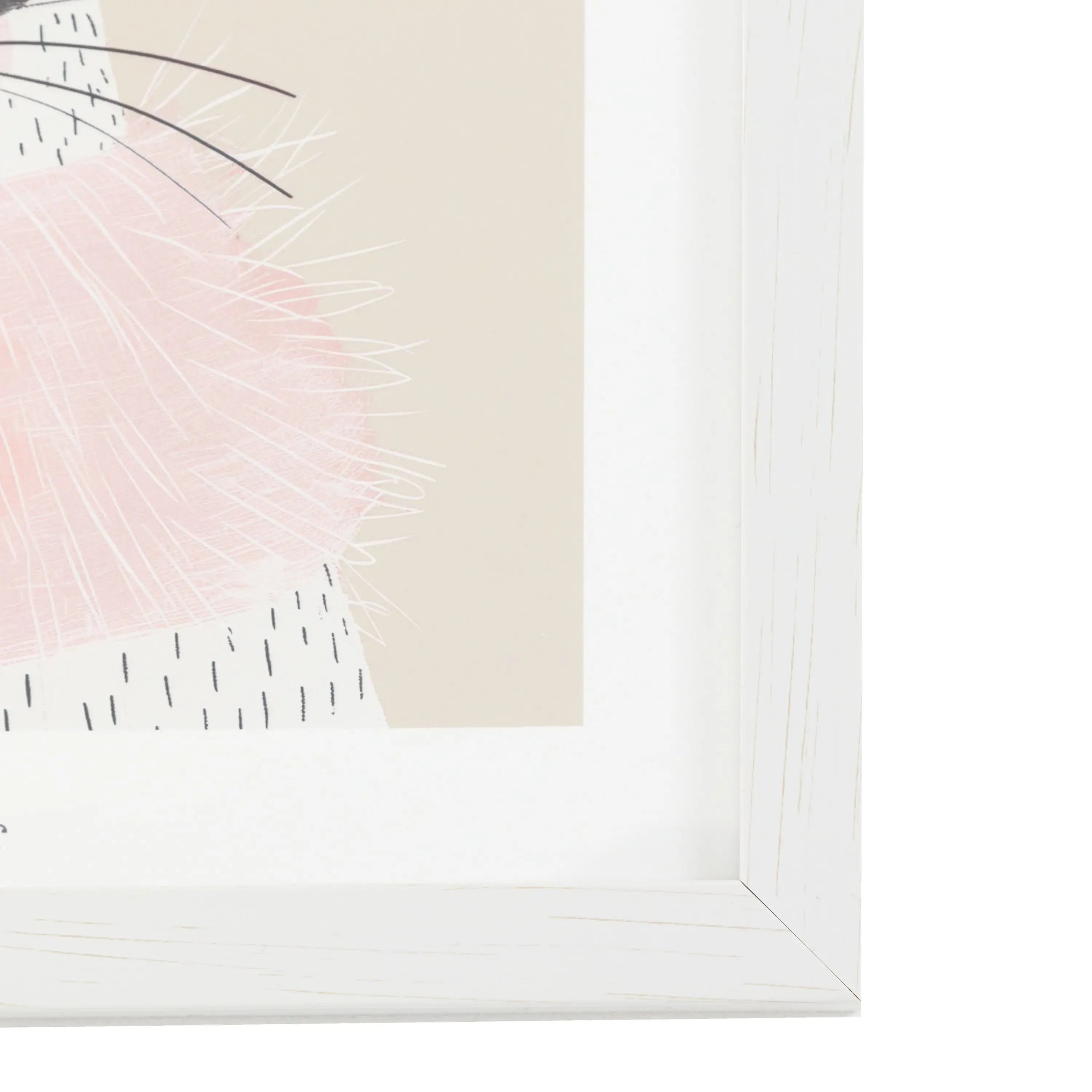 Ready to walk the catwalk, this perfect glamour cat is showing off their style in sunglasses, a fluffy pink scarf and a finishing feather hat. In muted pinks, creams, beiges and touches of black, this whimsical illustration is a quirky addition to a home. The print is complemented by a simple off white wood effect frame.