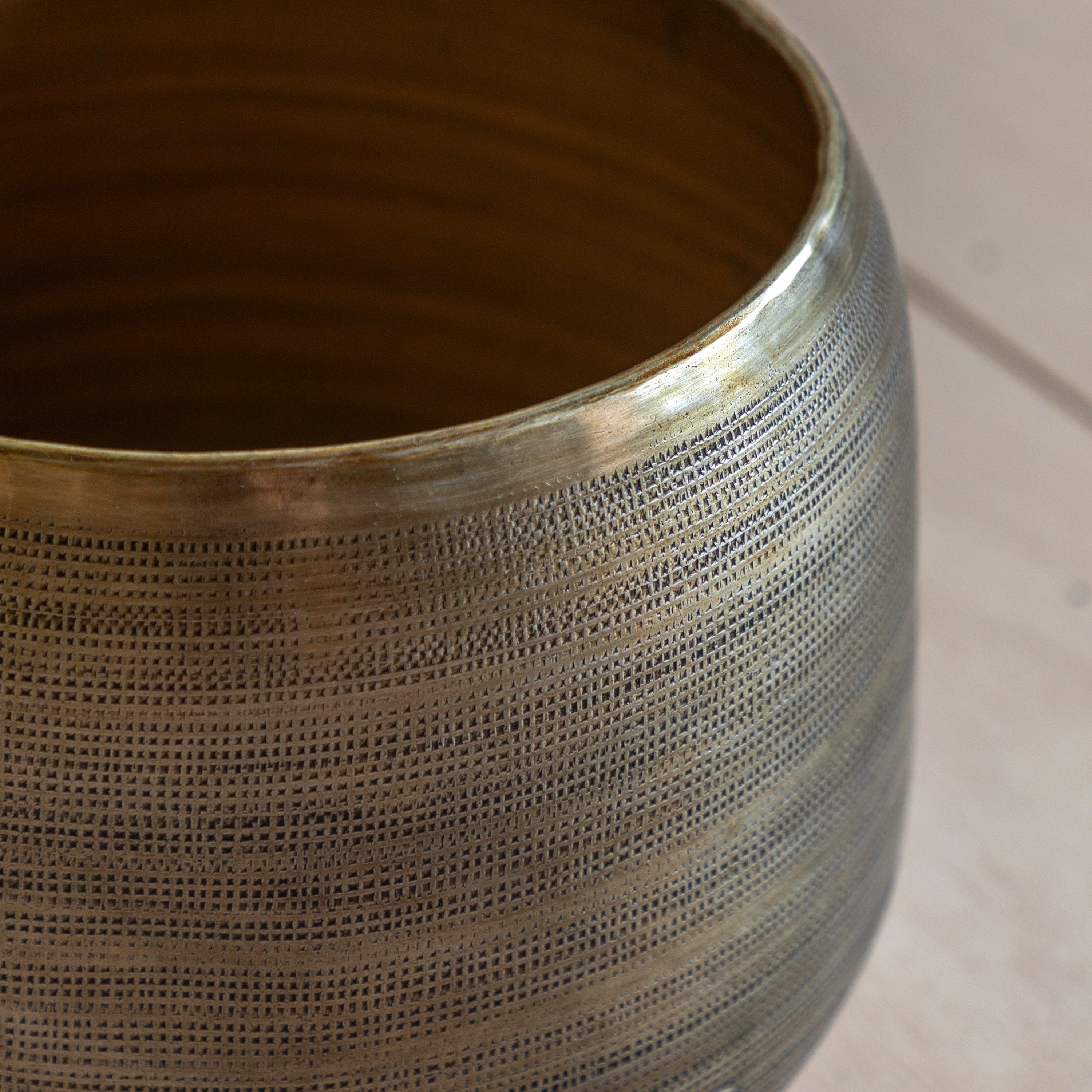 With an antiqued brass finish and unique texture, this pair of planters will enhance your plant display. Perfect paired with faux or real plants, the rich tones will complement a wide range of foliage and interiors.