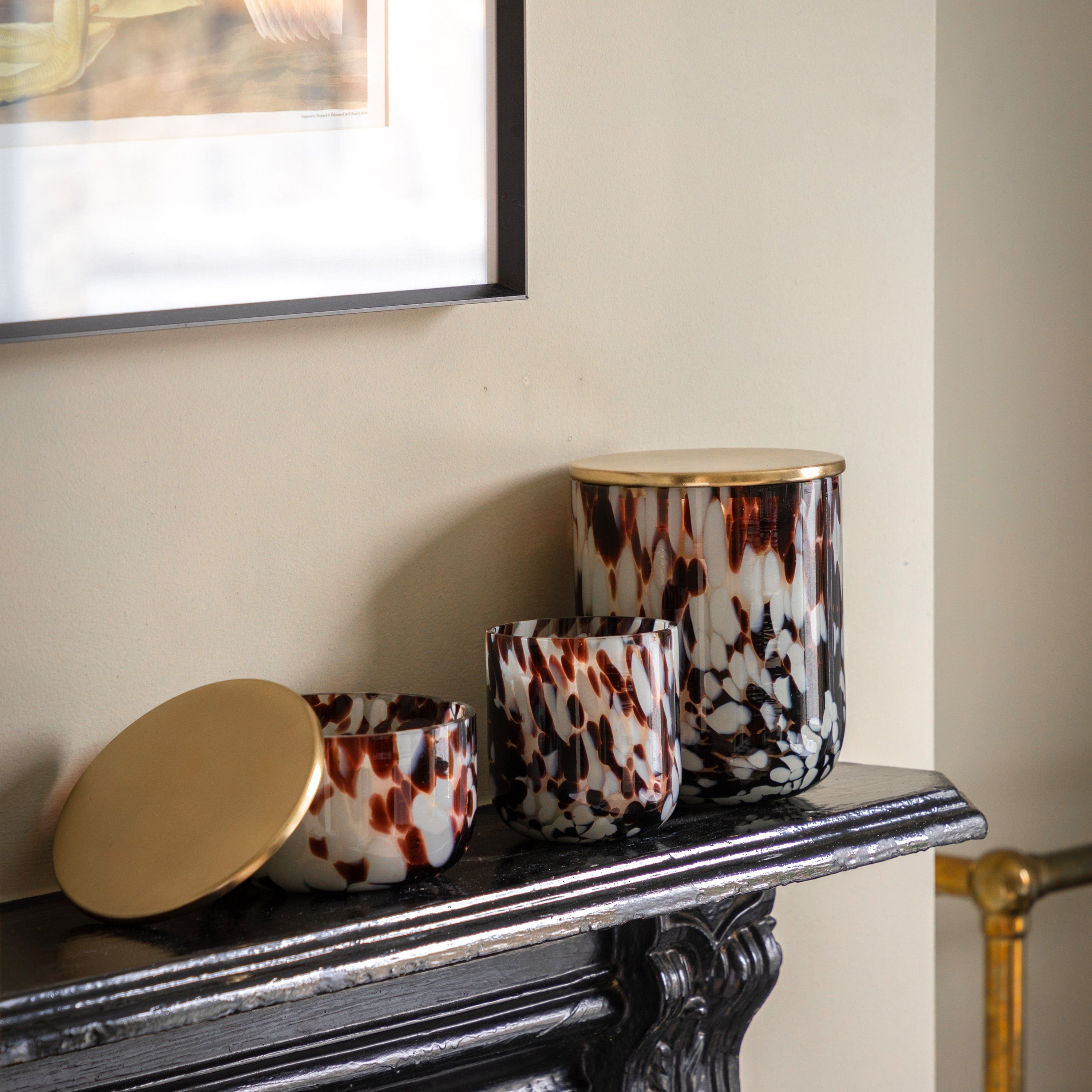 Combining the soft scent of peony and musk with the classic look of tortoiseshell this candle is an unmistakably elegant addition. The brown and white confetti style glass jar is complemented by a brass effect lid. The 3 wick candle benefits from a long burn time of 28 hours.