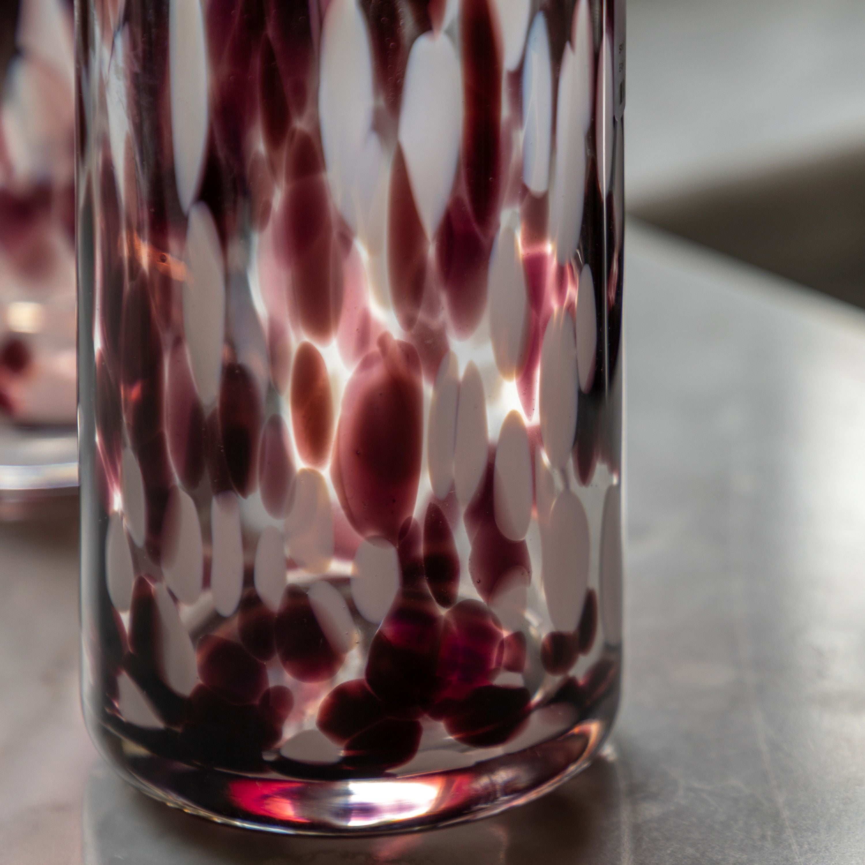 Set of 4 highball glasses, dappled with flecks of brown and white, creating a unique confetti effect sure to grab attention.